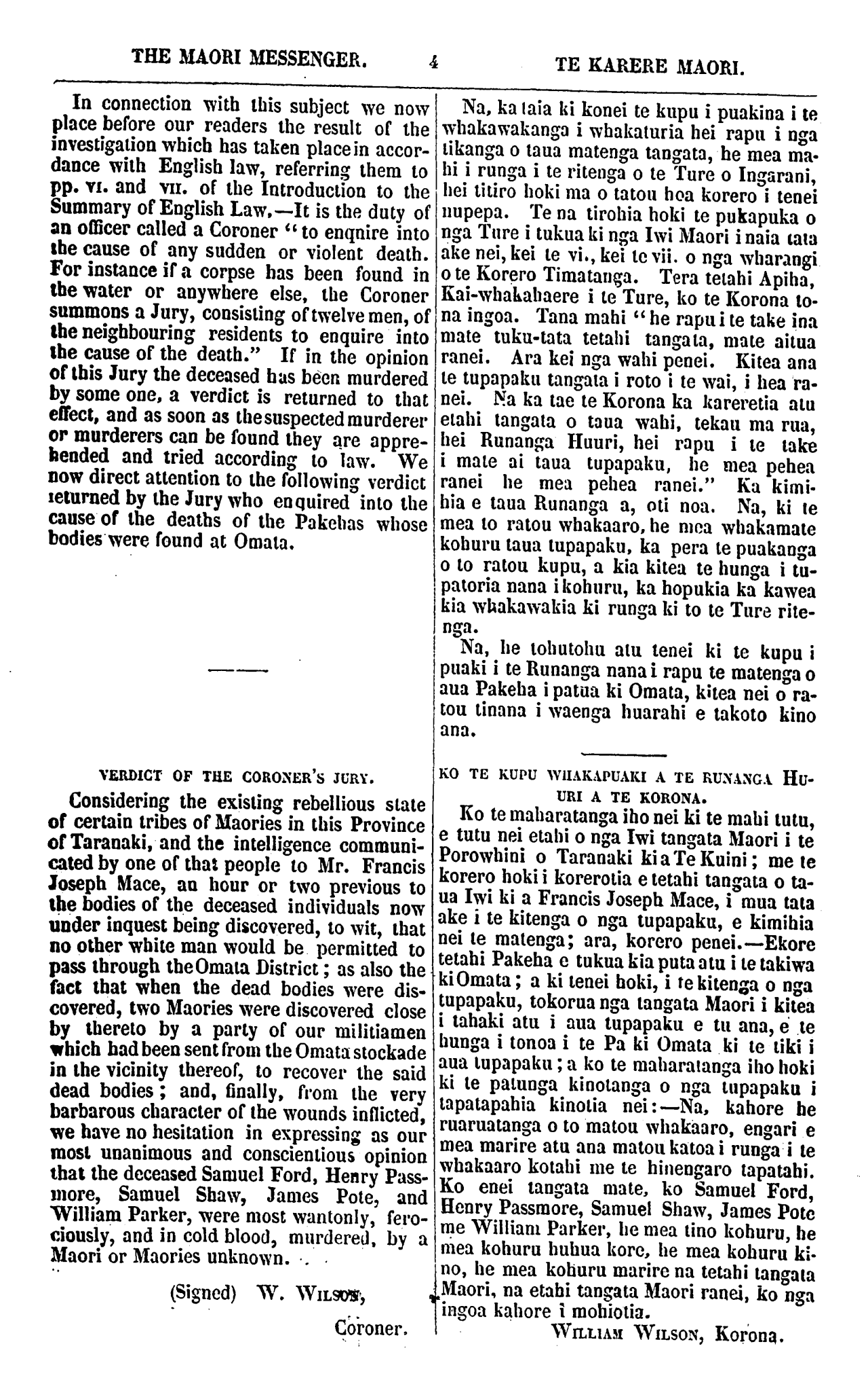 THE MAORI MESSENGER. TE KARERE MAORI. In connection with this subject we now place before our readers the result of the investigation which has taken place in accor- dance with English law, referring them to pp. TI. and VII. of the Introduction to the Summary of English Law,—It is the duty of an officer called a Coroner " to enquire into the cause of any sudden or violent death. For instance if a corpse has been found in the water or anywhere else, the Coroner summons a Jury, consisting of twelve men, of the neighbouring residents to enquire into the cause of the death." If in the opinion of this Jury the deceased has been murdered by some one, a verdict is returned to that effect, and as soon as the suspected murderer or murderers can be found they are appre- hended and tried according to law. We now direct attention to the following verdict returned by the Jury who enquired into the cause of the deaths of the Pakehas whose bodies were found at Omata. VERDICT OF THE CORONER'S JURY. Considering the existing rebellious state of certain tribes of Maories in this Province of Taranaki, and the intelligence communi- cated by one of that people to Mr. Francis Joseph Mace, an hour or two previous to the bodies of the deceased individuals now under inquest being discovered, to wit, that no other white man would be permitted to pass through the Omata District; as also the fact that when the dead bodies were dis- covered, two Maories were discovered close by thereto by a party of our militiamen which bad been sent from the Omata stockade in the vicinity thereof, to recover the said dead bodies; and, finally, from the very barbarous character of the wounds inflicted, we have no hesitation in expressing as our most unanimous and conscientious opinion that the deceased Samuel Ford, Henry Pass- more, Samuel Shaw, James Pote, and William Parker, were most wantonly, fero- ciously, and in cold blood, murdered, by a Maori or Maories unknown. (Signed) W. WILSON, Coroner. Na, ka taia ki konei te kupu i puakina i te whakawakanga i whakaturia hei rapu i nga tikanga o taua matenga tangata, he mea ma- hi i runga i te ritenga o te Ture o Ingarani, hei titiro hoki ma o tatou hoa korero i tenei nupepa. Te na tirohia hoki te pukapuka o nga Ture i tukua ki nga Iwi Maori i naia tata ake nei, kei te vi., kei te vii. o nga wharangi o te Korero Timatanga. Tera tetahi Apiha, Kai-whakahaere i te Ture, ko te Korona to- na ingoa. Tana mahi " he rapu i te take ina mate tuku-tata tetahi tangata, mate aitua ranei. Ara kei nga wahi penei. Kitea ana te tupapaku tangata i roto i te wai, i hea ra- nei. Na ka tae te Korona ka kareretia atu etahi tangata o taua wahi, tekau ma rua, hei Runanga Huuri, hei rapu i te take i mate ai taua tupapaku, he mea pehea ranei he mea pehea ranei." Ka kimi- hia e taua Runanga a, oti noa. Na, ki te mea to ratou whakaaro, he mea whakamate kohuru taua tupapaku, ka pera te puakanga o to ratou kupu, a kia kitea te hunga i tu- patoria nana i kohuru, ka hopukia ka kawea kia whakawakia ki runga ki to te Ture rite- nga. Na, he tohutohu atu tenei ki te kupu i puaki i te Runanga nana i rapu te matenga o aua Pakeha i patua ki Omata, kitea nei o ra- tou tinana i waenga huarahi e takoto kino ana. KO TE KUPU WHAKAPUAKI A TE RUNANGA HU- URI A TE KORONA. Ko te maharatanga iho nei ki te mahi tutu, e tutu nei etahi o nga Iwi tangata Maori i te Porowhini o Taranaki ki a Te Kuini; me te korero hoki i korerotia e tetahi tangata o ta- ua Iwi ki a Francis Joseph Mace, i mua tata ake i te kitenga o nga tupapaku, e kimihia nei te matenga; ara, korero penei.—Ekore tetahi Pakeha e tukua kia puta atu i te takiwa ki Oma ta; a ki tenei hoki, i te kitenga o nga tupapaku, tokorua nga tangata Maori i kitea i tahaki atu i aua tupapaku e tu ana, e te hunga i tonoa i te Pa ki Omata ki te tiki i aua tupapaku; a ko te maharatanga iho hoki ki te patunga kinotanga o nga tupapaku i tapatapahia kinotia nei:—Na, kahore he ruaruatanga o to matou whakaaro, engari e mea marire atu ana matou katoa i runga i te whakaaro kotahi me te hinengaro tapatahi. Ko enei tangata mate, ko Samuel Ford, Henry Passmore, Samuel Shaw, James Pote me William Parker, he mea tino kohuru, he mea kohuru huhua kore, he mea kohuru ki- no, he mea kohuru marire na tetahi tangata Maori, na etahi tangata Maori ranei, ko nga ingoa kahore i mohiotia. WILLIAM WILSON, Korona.