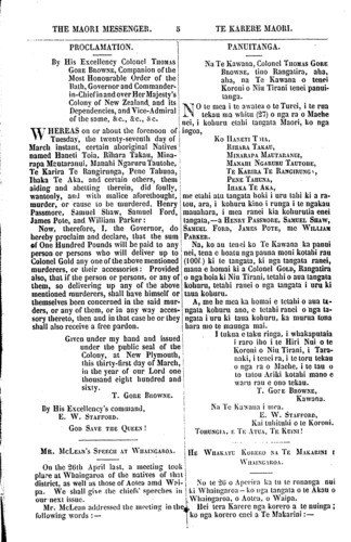 THE MAORI MESSENGER. o TE KARERE MAORI. PROCLAMATION. By His Excellency Colonel THOMAS GORE BROWNE, Companion of the Most Honourable Order of the Bath, Governor and Commander- in-Chief in and over Her Majesty's Colony of New Zealand and its Dependencies, and Vice-Admiral of the same, &c., &-c., &c. WHEREAS on or about the forenoon of Tuesday, the twenty-seventh day of March instant, certain aboriginal Natives named Haneti Toia, Rihara Takau, Mina- rapa Mautaranui, Manahi Ngaruru Tautohe, Te Karira Te Rangirunga, Pene Tahuna, Ihaka Te Aka, and certain others, them aiding and abetting therein, did foully, wantonly, and with malice aforethought, murder, or cause to be murdered, Henry Passmore, Samuel Shaw, Samuel Ford, James Pole, and William Parker: Now, therefore, I, the Governor, do hereby proclaim and declare, that the sum of One Hundred Pounds will be paid to any person or persons who will deliver up to Colonel Gold any one of the above mentioned murderers, or their accessories: Provided also, that if the person or persons, or any of them, so delivering up any of the above mentioned murderers, shall have himself or themselves been concerned in the said mur- ders, or any of them, or in any way acces- sory thereto, then and in that case he or they shall also receive a free pardon. Given under my hand and issued under the public seal of the Colony, at New Plymouth, this thirty -first day of March, in the year of our Lord one thousand eight hundred and sixty. T. GORE BROWNE. By His Excellency's command, E. W. STAFFORD. GOD SAVE THE QUEEN! MR. McLEAN'S SPEECH AT WHAINGAROA. On the 26th April last, a meeting took place at Whaingaroa of the natives of that district, as well as those of Aotea and Wai- pa. We shall give the chiefs' speeches in our next issue. Mr. McLean addressed the meeting in the following words:— PANUITANGA. Na Te Kawana, Colonel THOMAS GORE BROWNE, tino Rangatira, aha, aha, na Te Kawana o tenei Koroni o Niu Tirani tenei panui- tanga. NO te mea i te awatea o te Turei, i te rua tekau ma whitu (27) o nga ra o Maehe nei, i kohuru etahi tangata Maori, ko nga ingoa, KO HANETI TOIA, RIHARI TAKAU, MlNARAPA MAUTARANUI, MANAUI NGARURU TAUTOHE, TE KARIRA TE RANGIRUNGA, PENE TAHUNA, IHAKA TE AKA, me etahi atu tangata hoki i uru tahi ki a ra- tou, ara, i kohuru kino i runga i te ngakau mauahara, i mea ranei kia kohurutia enei tangata,—a HENRY PASSMORE, SAMUEL SHAW, SAMUEL FORD, JAMES POTE, me WILLIAM PARKER. Na, ko au tenei ko Te Kawana ka panui nei, tena e hoatu nga pauna moni kotahi rau (1001.) ki te tangata, ki nga tangata ranei, mana e homai ki a Colonel GOLD, Rangatira o nga hoia ki Niu Tirani, tetahi o aua tangata kohuru, tetahi ranei o nga tangata i uru ki taua kohuru. A, me he mea ka homai e tetahi o aua ta- ngata kohuru ano, e tutahi ranei o nga ta- ngata i uru ki taua kohuru, ka murua tona hara mo te maunga mai. I tukua e taku ringa, i whakapataia i raro iho i te Hiri Nui o te Koroni o Niu Tirani, i Tara- naki, i tenei ra, i te toru tekau o nga ra o Maehe, i te tau o to tatou Ariki kotahi mano e waru rau e ono tekau. T. GORE BROWNE, Kawana. Na Te Kawana i mea. E. W. STAFFORD, Kai tuhituhi o te Koroni. TOHUNGIA, E TE ATUA, TE KUINI! I HE WHAKATU KORERO NA TE MAKARINI I WHAINGAROA. No te 26 o Aperira ka tu te runanga nui ki Whaingaroa—ko nga tangata o te Akau o I Whaingaroa, o Aotea, o Waipa. Hei tera Karere nga korero a te nuinga; I ko nga korero enei a Te Makarini:—