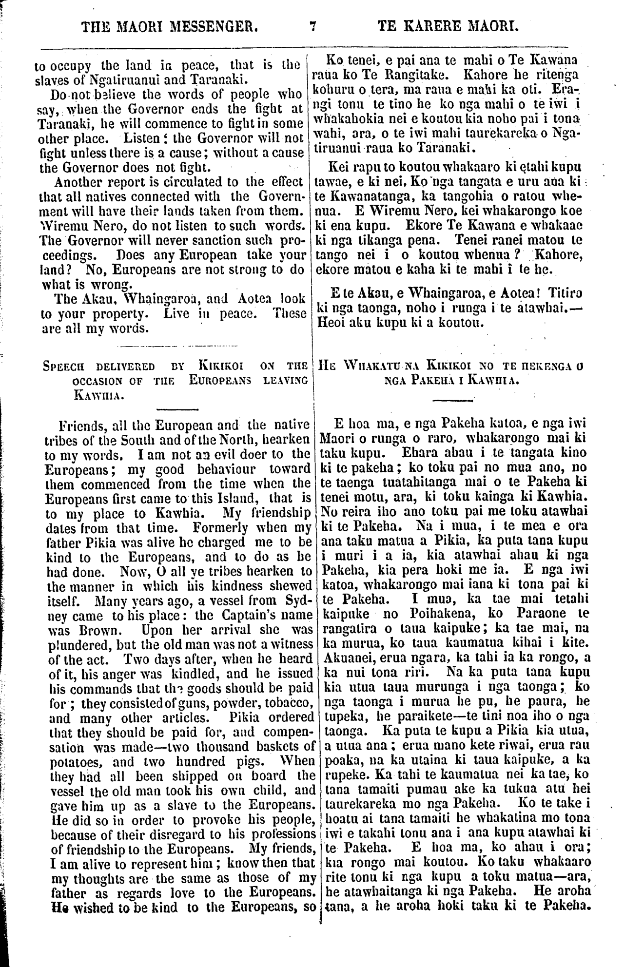 THE MAORI MESSENGER. TE KARERE MAORI. to occupy the land in peace, that is the slaves of Ngatiruanui and Taranaki. Do not believe the words of people who say, when the Governor ends the fight at Taranaki, he Will commence to fight in some other place. Listen the Governor will not fight unless there is a cause; without a cause the Governor does not fight. Another report is circulated to the effect that all natives connected with the Govern- ment will have their lands taken from them. Wiremu Nero, do not listen to such words. The Governor will never sanction such pro- ceedings. Does any European take your land? No, Europeans are not strong to do what is wrong. The Akau, Whaingaroa, and Aotea look to your property. Live in peace. These are all my words. SPEECH DELIVERED BY KlKIKOI ON THE OCCASION OF THE EUROPEANS LEAVING KAWHIA. Friends, all the European and the native tribes of the South and of the North, hearken to my words. I am not an evil doer to the Europeans; my good behaviour toward them commenced from the time when the Europeans first came to this Island, that is to my place to Kawhia. My friendship dales from that time. Formerly when my father Pikia was alive he charged me to be kind to the Europeans, and to do as be had done. Now, 0 all ye tribes hearken to the manner in which his kindness shewed itself. Many years ago, a vessel from Syd- ney came to his place: the Captain's name was Brown. Upon her arrival she was plundered, but the old man was not a witness of the act. Two days after, when he heard of it, his anger was kindled, and he issued his commands that the goods should be paid for; they consisted of guns, powder, tobacco, and many other articles. Pikia ordered that they should be paid for, and compen- sation was made—two thousand baskets of potatoes, and two hundred pigs. When they had all been shipped on board the vessel the old man look his own child, and gave him up as a slave to the Europeans. He did so in order to provoke his people, because of their disregard to his professions of friendship to the Europeans. My friends, I am alive to represent him; know then that my thoughts are the same as those of my father as regards love to the Europeans. Ha wished to be kind to the Europeans, so Ko tenei, e pai ana te mahi o Te Kawana raua ko Te Rangitake. Kahore he ritenga kohuru o tera, ma raua e mahi ka oti. Era- ngi tonu te tino he ko nga mahi o te iwi i whakahokia nei e koutou kia noho pai i tona wahi, ara, o te iwi mahi taurekareka o Nga- tiruanui raua ko Taranaki. Kei rapu to koutou whakaaro ki etahi kupu tawae, e ki nei, Ko nga tangata e uru ana ki te Kawanatanga, ka tangohia o ratou whe- nua. E Wiremu Nero, kei whakarongo koe ki ena kupu. Ekore Te Kawana e whakaae ki nga tikanga pena. Tenei ranei matou te tango nei i o koutou whenua? Kahore, ekore matou e kaha ki te mahi i te he. E te Akau, e Whaingaroa, e Aotea! Titiro ki nga taonga, noho i runga i te atawhai,— Heoi aku kupu ki a koutou. HE WHAKATU NA KlKIKOI NO TE HEKENGA O NGA PAKEHA I KAWHIA. E hoa ma, e nga Pakeha katoa, e nga iwi Maori o runga o raro, whakarongo mai ki taku kupu. Ehara ahau i te tangata kino ki te pakeha; ko toku pai no mua ano, no te taenga tuatahitanga mai o te Pakeha ki tenei motu, ara, ki toku kainga ki Kawhia. No reira iho ano toku pai me toku atawhai ki te Pakeha. Na i mua, i te mea e ora ana taku matua a Pikia, ka puta tana kupu i muri i a ia, kia atawhai ahau ki nga Pakeha, kia pera hoki me ia. E nga iwi katoa, whakarongo mai iana ki tona pai ki te Pakeha. I mua, ka tae mai tetahi kaipuke no Poihakena, ko Paraone te rangatira o taua kaipuke; ka tae mai, na ka murua, ko taua kaumatua kihai i kite. Akuanei, erua nga ra, ka tahi ia ka rongo, a ka nui tona riri. Na ka puta tana kupu kia utua taua murunga i nga taonga; ko nga taonga i murua he pu, he paura, he tupeka, he paraikete—te tini noa iho o nga taonga. Ka puta te kupu a Pikia kia utua, a uma ana; erua mano kete riwai, erua rau poaka, na ka utaina ki taua kaipuke, a ka rupeke. Ka tahi te kaumatua nei ka tae, ko tana tamaiti pumau ake ka tukua atu hei taurekareka mo nga Pakeha. Ko te take i hoatu ai tana tamaiti he whakatina mo tona iwi e takahi tonu ana i ana kupu atawhai ki te Pakeha. E hoa ma, ko ahau i ora; kia rongo mai koutou. Ko taku whakaaro rite tonu ki nga kupu a toku matua—ara, he atawhaitanga ki nga Pakeha. He aroha tana, a he aroha hoki taku ki te Pakeha.