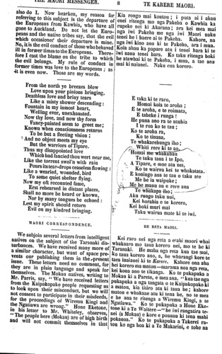 8 TE KARERE MAORI. also do I. Now hearken, my reason for referring to this subject is the departure of the Europeans from Kawhia, who have all gone to Auckland. Do not let the Euro- peans and the native tribes say, that the evil which occasioned their departure is mine. No, it is the evil conduct of those who behaved ill in former times to the Europeans. There- fore I cast the blame on the tribe to which the evil belongs. My rule of conduct in former times was love to the Europeans; as it is even now. Those are my words. From the north ye breezes blow Love upon your pinions bringing, Deathless love and briny tears Like a misty shower descending: Fountain in my inmost heart, Welling ever, unexhausted. Now thy love, and now thy form Fancy-painted seem to greet me; Known when conscionsness returns To be but a fleeting vision; <t And no object meets my eye But the warriors of Tipare. Thus my disappointed love Which had fancied thou wert near me, Like the torrent swol'n with rain Pours its tear-drops ceaseless flowing: Like a weaned, wounded, bird To some quiet shelter flying. Now my oft recounted fame, Erst rehearsed in distant places, Shall no more be heard or known. Nor by many tongues be echoed: Lest my spirit should return Evil on my kindred bringing. MAORI CORRESPONDENCE. We subjoin several letters from intelligent natives on the subject of the Taranaki dis- turbances. We have received many more of a similar character, but want of space pre- vents our publishing them in the present issue. These letters need no comment, for they are in plain language and speak for themselves. The Mokau natives, writing to Mr. Parris, say, " We have received letters from the Kaipakopako people requesting us to look upon their misconduct, but we will not consent to participate in their misdeeds, for the proccedings of Wiremu Kingi and the Ngatiawa are wrong. " Hone Eketone, in his letter to Mr. Whiteley, observes, " The people here (Mokau) are of high birth and will not commit themselves in that Kia rongo mai koutou; i puta ai i ahau enei ritenga mo nga Pakeha o Kawhia ka rupeke nei ki Akarana; ara kei mea mai nga iwi Pakeha me nga iwi Maori naku tenei he i haere ai te Pakeha. Kahore, na nga iwi kino ano ki te Pakeha, ara i mua. Koia ahau ka papare atu i tenei hara ki te iwi nona tenei hara. Ko taku ritenga hoki he atawhai ki te Pakeha, i mua, a tae ana mai ki naianei. Naku ena korero. E raka ki te raro, Homai koia te aroha; E te aroha, e te roimata, E taheke i runga! He puna ano ra te utuhia I te roa ko te tau; Ko te aroha ra, Ko te tinana, Te whakarehunga iho; Whiti rere ki te ao, Homai me whakahau Te tuku taua i te Ipo, A Tipare, e moe atu nei, Ko te wairua kei te whakatata, E koningo ana te tau o taku are Me he ia waipuke; Me he manu au e rere ana Te whakapa iho;— Aku rongo tuku nui, Kei horahia e te korero, Kei hoki muri mai Taku wairua mate ki te iwi. HE RETA MAORI. Kei raro nei nga reta a etahi maori whai whakaaro mo taua korero nei, mo to he ki Taranaki. He maha nga reta kua tae mai. ko taua korero ano, a, he wharangi kore te taea inaianei ki te Karere. Kahore ona aha hei korero ma matou— marama noa nga reta, kei kona ano te tikanga. Ko te pukapuka a Mokau ki a Parete, e mea ana, "kua tae nga pukapuka a nga tangata o te Kaipakopako ki a matou, kia titiro atu ki taua he; kahore matou e whakaae atu ki tena he, no te mea e he ana te ritenga a Wiremu Kingi, a te Ngatiawa." Ko te pukapuka a Hone Eke- tone ki a Te Waitere—"he iwi rangatira te- nei (a Mokau) e kore e poauau ki tena mahi pokanoa." Ko te pukapuka a Takerei ra- tou ko nga hoa ki a Te Makarini, e tohe oa