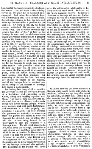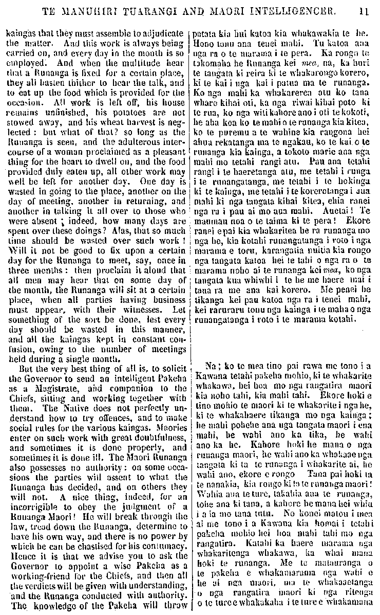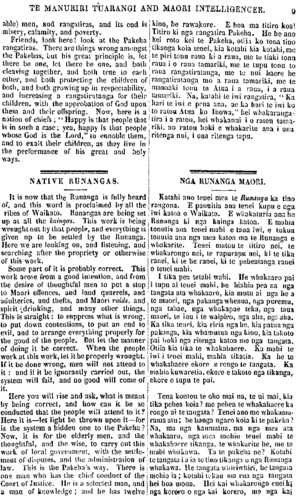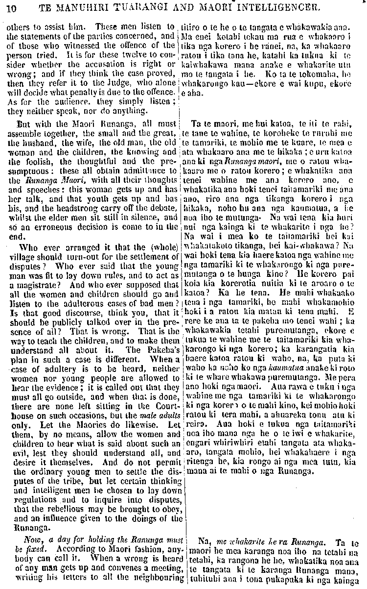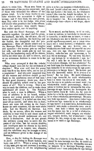 TE MANUHIRI TUARANGI AND MAORI INTELLIGENCER. 9 able) men, and rangatira, and its end is misery, calamity, and poverty. Friends, look here! look at the Pakeha rangatiras. There are things wrong amongst the Pakehas, but his great principle is,! let there be one, let there he one, and both cleaving together, and both true to each other, and both protecting the children of both, and both growingup in respectability, and increasing a rangatiratanga for their children, with the approbation of God upon them and their offspring. Now, here is a nation of chiefs; " Happy is that people that is in such a case; yea, happy is that people whose God is the Lord," to ennoble them, and to exalt their children, as they live in I the performance of his great and holy i ways. NATIVE RUNANGAS. It is now that the Runanga is fully heard of, and this word is proclaimed by all the tribes of Waikato. Runangas are being set up at all the kaingas. This work is being wrought out by that people, and everything is given up to be settled by the Runanga. Here we are looking on, and listening, and searching after the propriety or otherwise of this work. Some part of it is probably correct. This work arose from a good intention, and from the desire of thoughtful men to put a slop to Maori offences, and land quarrels, and adulteries, and thefts, and Maori raids, and spirit drinking, and many other things. This is straight: to suppress what is wrong, to put down contentions, to put an end to evil, and to arrange every thing properly for the good of the people. But let the manner of doing it be correct. When the people work at this work, let it be properly wrought. If it be done wrong, men will not attend to it: and if it be ignorantly carried out, the system will fail, and no good will come of it. Here you will rise and ask, what is meant by being correct, and how can it be so conducted that the people will attend to it? Here it is—let light be thrown upon it—for is the system a hidden one to the Pakeha? Now, it is for the elderly men, and the thoughtful, and the wise, to carry out this work of local government, with the settle- ment of disputes, and the administration of law. This is the Pakeha's way. There is one man who has the chief conduct of the Court of Justice, he is u selected man, and a man of knowledge; and he has twelve kino he rawakore. E hoa ma titiro koa! Titiro ki nga rangatira Pakeha. He he ano kei roto kei te pakeha, otiia ko tona tino tikanga koia tenei, kia kotahi kia kotahi, me te piri tonu raua ki a raua, me te tiaki tonu raua i o raua tamariki, me ti eupu tonu to raua rangatiratanga, me te nui haere he rangatiratanga mo a raua tamariki me te manaaki tonu te Atua i a raua, i a raua tamariki. Na katahi te iwi rangatira, "Ka hari te iwi e pena ana ae ka hari te iwi ko to ratou Atua ko Ihowa," hei whakaranga tira i a ratou, hei whakanui i o ratou tama riki no ratou hoki e whakarite ana i ona ritenga nui, i ona ritenga tapu.rawakore.titirorangatirarotokeiotiiarangatiratanga,haere NGA RUNANGA MAORI. Katahi ano tenei mea te Runanga ka tino rangona. E panuitia ana tenei kupu e nga iwi katoa o Waikato. E whakaturia ana he Runanga ki nga kainga katoa. E mahia tonutia ana tenei mahi e taua iwi, e tukua tonutia ana nga mea katoa ma te Runanga e whakarite. Tenei matou te titiro nei, te whakarongo nei, te rapurapu nei, ki te tika ranei, ki te he ranei, ki te peheatanga ranei o tenei mahi. I tika pea tetahi wahi. He whakaaro pai i tupu ai tenei mahi, he hiahia pea na nga tangata ata whakaaro, kia mutu ai nga he a te maori, nga pakanga whenua, nga puremu. nga tahae, nga whakapae teka, nga taua maori, te inu i te waipiro, nga aha, nga aha. Ka tika tenei, kia riria ngahe, kia patua nga pakanga, kia whamutua nga kino, kia takoto pai hoki nga ritenga katoa mo nga tangata. Otiia kia tika te whakahaere. Ka mahi te iwi i tenei mahi, mahia tikatia. Ka he te whakahaere ekore e rongo te tangata. Ka mahia kuwaretia, ekore e takoto nga tikanga, ekore e tupu te pai. Tena koutou te oho mai na, te ui mai, kia tika pehea koia? me pehea te whakahaere ka rongo ai te tangata ? Tenei ano me whakama- rama atu; he hanga ngaro koia ki te pakeha ? Na, ma nga kaumatua, ma nga mea ata whakaaro, nga mea mohio tenei mahi te whakahaere tikanga, te whakarite he, me te mahi whakawa. Ta te pakeha ne? Kotahi te tangata i a ia te tino tikanga o nga Runanga whakawa. He tangata whiriwhiri, he tangata mohio ia ; kotahi tekau ma rua nga tangata hei hoa mona. Hei kai whakarongo enei ki nga korero o nga kai korero, me nga kai