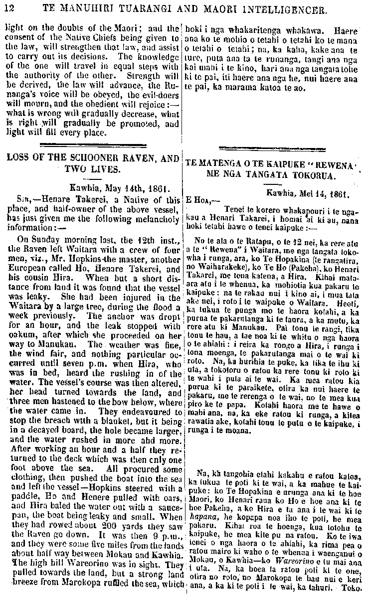 12 TE MANUHIRI TUARANGI AND MAORI INTELLIGENCER. light on the doubts of the Maori; and the consent of the Native Chiefs being given to the law, will strengthen that law, and assist to carry out its decisions. The knowledge of the one will travel in equal steps will the authority of the other. Strength will be derived, the law will advance, the Ru- nanga's voice will be obeyed, the evil-doers will mourn, and the obedient will rejoice:— what is wrong will gradually decrease, what is right will gradually be promoted, and light will fill every place. LOSS OF THE SCHOONER RAVEN, AND TWO LIVES. Kawhia, May 14th, 1861. SIR,—Henare Takerei, a Native of this place, and half-owner of the above vessel, has just given me the following melancholy information:— On Sunday morning last, the 12th inst., the Raven left Waitara with a crew of four men, viz., Mr. Hopkins-the master, another European called Ho, Henare Takerei, and bis cousin Hira. When but a short dis- tance from land it was found that the vessel was leaky. She had been injured in the! "Waitara by a large tree, during the flood a week previously. The anchor was dropped for an hour, and the leak slopped with oakum, after which she proceeded on her way to Manukau. The weather was fine, the wind fair, and nothing particular oc- curred until seven p.m. when Hira, who was in bed, heard the rushing in of the water. The vessel's course was then alerted her head turned towards the land, and three men hastened to the bow below, where the water came in. They endeavoured to stop the breach with a blanket, but it being in a decayed board, the hole became larger, and the water rushed in more and more. After working an hour and a half they ret urned to the deck which was then only one fool above the sea. All procured some clothing, then pushed the boat into the sea and left the vessel—Hopkins steered with a1 paddle, Ho and Henere pulled with oars, and Hira baled the water out with a sauce- pan, the boat being leaky and small. When they had rowed about 200 yards they saw the Raven go down. It was then 9 p.m and they were some five miles from the lands about halfway between Mokau and Kawhia. The high hill Wareorino was in sight. They pulled towards the land, but a strong land breeze from Marokopa ruffled the sea, which hoki i nga whakaritenga whakawa. Haere ana ko te mohio o tetahi o tetahi ko te mana o tetahi o tetahi; na, ka kaha, kake ana te ture, puta ana ta te runanga, tangi ana nga kai mahi i te kino, hari ana nga tangata tohe ki te pai, iti haere ana nga he, nui haere ana te pai, ka marama katoa te ao. TE MATENGA O TE KAIPUKE " REWENA- ME NGA TANGATA TOKORUA. Kawhia, Mei 14, 1861. E HOA,— Tenei te korero whakapouri i te nga- kau a Henare Takarei, i homai ai ki au, nana hoki tetahi hawe o tenei kaipuke :— No te ata o te Ratapu, o (e 12 nei, ka rere atu a (e '' Rewena" i Waitara, me nga tangata toko- wha i runga, ara, ko Te Hopakina (te rangatira, no Waiharakeke), ko Te Ho (Pakeha), ko Henare Takarei, me tona katena, a Hira. Kihai mata- ara atu i (e whenua, ka mohiotia kua pakaru (e kaipuke : na (e rakau nui i kino ai, i mua tata ake nei, i roto i te waipuke o Waitara. Heoti, ka tukua te punga mo Ie haora kotahi, a ka puma te pakarutanga ki te tana, a ka mutu, ka rere atu ki Manukau. Pai tonu te rangi, tika tonu te hau, a tae noa ki te whitu o nga haora o te ahiahi: i reira ka rongo a Hira, i runga i tona moenga, te pakarutanga mai o te wai ki roto. Na, ka hurihia te puke, ka tika te ihu ki uta, a tokotoru o ratou ka rere tonu ki roto ki te wahi i puta ai te wai. Ka mea ratou kia purua ki te paraikete, otira ka nui haere te pakaru, me te rerenga o te wai, no te mea kua piro ke te papa. Kotahi haora me te hawe e mahi ana, na, ka eke ratou ki runga, a kitea rawatia ake, kotahi tonu te putu o (e kaipuke, i runga i (e moana. Na, ka tangohia etahi kakahu e ratou katoa, ka tukua te poti ki te wai, a ka mahue te kai- puke : ko Te Hopakina e nuinga ana ki te hoe Maori, ko Henare raua ko Ho e hoe ana ki te hoe Pakeha, a ko Hira e Ia ana i te wai ki te kapana, he kopapa noa iho te poti, he mea pakaru. Kihai roa te hoenga, kua totohu te i kaipuke, he mea kite pu na ratou. Ko te iwa tenei o nga haora o te ahiahi, ka rima pea o ratou mairo ki waho o (e whenua i waenganui o , Mokau, o Kawhia—ko Wareorino e tu mai ana i uta. Na, ka hoea te ratou poti ki te one, otira no roto, no Marokopa te hau nui e keri ' ana, a ka ki te poti i te wai, ka tahuri. Toko-
