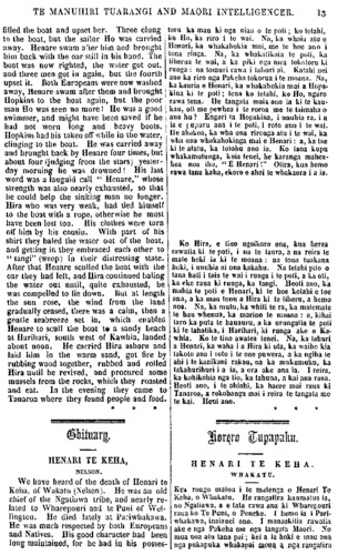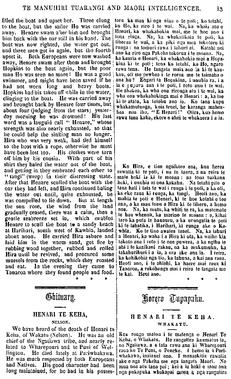 TE MANUHIRI TUARANGI AND MAORI INTELLIGENCER. 13 filled the boat and upset her. Three clung to the boat, but the sailor Ho was carried away. Henare swam after him and brought him back with the oar still in his hand. The boat was now righted, the water got out. and three men got in again, but the fourth upset it. Both Europeans were now washed away, Henare swam after them and brought Hopkins to the boat again, but the poor man Ho was seen no more I He was a good swimmer, and might have been saved if he had not worn long and heavy boots. Hopkins had his taken off while in the water, clinging to the boat. He was carried away and brought back by Henare four limes, but about four (judging from the stars) yester- day morning he was drowned! His last word was a languid call " Henare," whose strength was also nearly exhausted, so that he could help the sinking man no longer. Hira who was very weak, had lied himself to the boat with a rope, otherwise he must have been lost too. His clothes were torn off him by his cousin. With part of his shirt they baled the water out of the boat, and gelling in they embraced each other to " tangi" (weep) in their distressing state. After that Henare sculled the boat with the oar they had led, and Hira continued baling the water out until, quite exhausted, be was compelled to lie down. But at length the sun rose, the wind from the land gradually ceased, there was a calm, then a gentle seabreeze set in, which enabled Henare to scull the boat te a sandy beach at Harihari, south west of Kavvhia, landed about noon. He carried Hira ashore and laid him in the warm sand, got fire by rubbing wood together, rubbed and rolled Hira until he revived, and procured some mussels from the rocks, which they roasted and eat. In the evening they came to Tanaroa where they found people and food. Obituary HENARl TE KEHA, NELSON. We have heard of the death of Henari te Keha, of Wakatu (Nelson). He was an old chief of Ihe Ngatiawa tribe, and nearly re- lated to Wharepouri and to Puni of Wel- lington. He died lately at Pariwhakawa. He was much respected by both Europeans and Natives. His good character had been long maintained, for he had in his posses- toru ka mau ki nga niao o te poti; ko tetahi, ko Ho, ka riro i to wai. Na, ka whaia atu e Henare, ka whakahokia mai, me (e hoe ano i tona ringa. Na, ka whakatikaia te poti, ka tiherua te wai, a ka piki nga mea tokotoru ki runga : na tomuri rawa i tahuri ai. Katahi nei ano ka riro nga Pakeha tokorua i (e moana. Na, ka kauria e Henari, ka whakahokia mai a Hopa- kina ki te poti; tena ko tetahi, ko Ho, ngaro rawa tena. Ue tangata maia ano ia ki (e kau- kau, oti me pewhea i te roroa me te taimaha o ana hu ? Engari (a Hopakina, i unuhia ra, i a ia e pupuru ana i te poti, i roto ano i te wai. He ahakoa, ka wha ona rironga atu i te wai, ka wha ona whakahokinga mai e Henari: a, ka tae ki (e atatu, ka totohu ano ia. Ko Iana kupu whakamutunga, koia tenei, he karanga mahea- hea noa ihu, " E Henari!" Otira, kua hemo rawa (ana kaha, ekore e ahei (e whakaora i a ia. Ko Hira, e tino ngoikoro ana, kua herea rawatia ki (e poti, i na te taura, a na reira te mate hoki ia ki (e moana : na tona tuakana hoki, i unuhia ai ona kakahu. Na tetahi pito o (ana hati i taia te wai i runga i te poti, a ka oti, ka eke raua ki runga, ka tangi. Heoti ano, ka mahia te poti e Henare, ki te hoe kotahi e toe ana, a ka mau tonu a Hira ki te tiheru, a hemo noa. Na, ka mutu, ka whiti te ra, ka matemate te hau whenua, ka marino te moana : a, kihai taro ka puta te hauauru, a ka urungatia te poti ki te tahatika, i Harihari, ki runga ake o Ka- whia. Ko te tino awatea (enei. Na, kei tahuri a Henare, ka waha i a Hira ki uta, ka waiho kia takoto ana i i roto i te one puwera, a ka ngiha te ahi i te kanikani rakau, na ka mukumuku, ka takahurihuri i a ia, a ora ake ana ia. I reira, ka kohikohia nga tio, ka tahuna, a kai ana raua. Heoti ano, i te ahiahi, ka haere mai raua ki Tanaroa, a rokohanga mai i reira te tangata me (e kai. Heoi ano. * * * Korero Tupapaku HENARI TE KEHA. WHAKATU. KUA rongo matou i te matenga o Henare Te Keha, o Whakatu. He rangatira kaumatua ia, no Ngatiawa, a e (ata rawa ana ki Wharepouri raua ko Te Puni, o Poneke. I hemo ia i kari- whakawa, inaianei ano. I manaakitia rawatia ake e nga Pakeha me nga tangata Maori. No mua noa atu tana pai; kei a ia hoki e mau ana nga pukapuka whakapai mona a nga rangatira