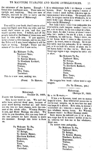 TE MANUHIRI TUARANGI AND MAORI INTELLIGENCER. 15 the substance of the korero. Enough : I found nine intelligent men. These men are upright and knowing. They are men of thought, and will be able to carry out the rules for the people of Mahurangi. You said in your book, that I was to select some intelligent men from my tribe, and for- ward their names to you, and that you would appoint them. I looked, and all the people looked to the fitness of these men, and now it rest with you. If you approve, write a letter to this runanga, and to me, that the Tribe and I may know whether will be right or wrong. Enough : These are the names of the men that 1 now write. Ko Mokoare Te Pu, Ngakauri Mate, Te Reinga, Te Katene Hawea, Te Manihera Katikati, Hopouni Tiwhao, Tuna, Mira Tame. Turiwhati. This is a new man, making ten. (From) TE HEMARA. Mahurangi, October 31, 1860, FRIEND THE GOVERNOR,— This is our word to you. We and the tribe have selected these men, because of your word having reached us: and those are Ihe two wo have chosen, with the con- sent of the whole tribe. Wiremu Pomare is one, and Hami Maunga the other. We write to you therefore, that you may hear of the two persons we have chosen to assist the Assessor. Enough this letter is from us. Na Mokoare Te Pu, Ngakauri Male, Te Reinga, Te Katene Hawea, Manihera Katikati, Hopoumai, Tiwhao, Tuna, Mira Tame, Turiwhati ki te whakarongo hoki i te tikanga o tenei korero. Heoi. Ko nga tangata i matau ai ahau i roto i tenei huihui, tokoiwa nga ta- ngata matau i kite ai ahau. He tangata tika enei, he tangata matau kite whakaaro, ki te mahi hoki i nga tikanga o ratou i te iwi e noho ana ki Mahurangi. Nau hoki i moa i roto i tau pukapuka kia whiriwhiria etahi tangata matau i roto i te iwi, a ki te kitea, ka ho atu e ahau ki a koe. Koia tenei, ko aku i matau ai ahau i roto i toku iwi: maku e he atu ki a koe, a mau e whakatu, ka tahi ka tu. Naku i titiro, na te iwi katoa hoki i titiro te tika o enei ta- ngata : ko tenei, mau te tikanga. Ki te pai koe tuhia mai tou pukapuka ki te runanga nei, a ki au hoki kia matau ai ahau me tu iwi katoa hoki i te tika i te he. Heoi ano. Tenei nga ingoa o nga tangata ka tuhia atu e ahau. Ko Mokoare Te Pu, Ngakauri Mate, Te Reinga, Te Katene Hawea, Te Manihera Katikati Hopouni, Tiwhao, Tuna, Mita Tamo, Turiwhati. ne tangata hou tenei: tekau tenei o nga tangata. i (Na TE HEMARA, pea.) Mahurangi, Oketopa 31, 1860. Ki A TE KAWANA,— E hoa e te Kawana, tenei ano ta matou kupu ki a koe. Kua whiriwhiri matou me te iwi ki enei tangata, no te mea kua tae mai tau kupu ki a matou. Koia tena, te matou i whiriwhiri ai; tokorua a matou i kite ai, kua whakaae matou katoa. Ko Wiremu Pomare tetahi: ko Hami Maunga tetahi. Koia matou ka tuhituhi atu ui ki a koe, kia rongo koe ki ta matou i mohio ai mo ta- ua tokorua hei hoa mo te kai whakawa. Heoi ano. Ka matou tena pukapuka, Na Makoare Te Pu, Ngakauri Mate, Te Reinga, Te Katene Hawea, i Manihera Katikati, Hopoumai, Tiwhao, Tuna, Mita Tame, Turiwhati.