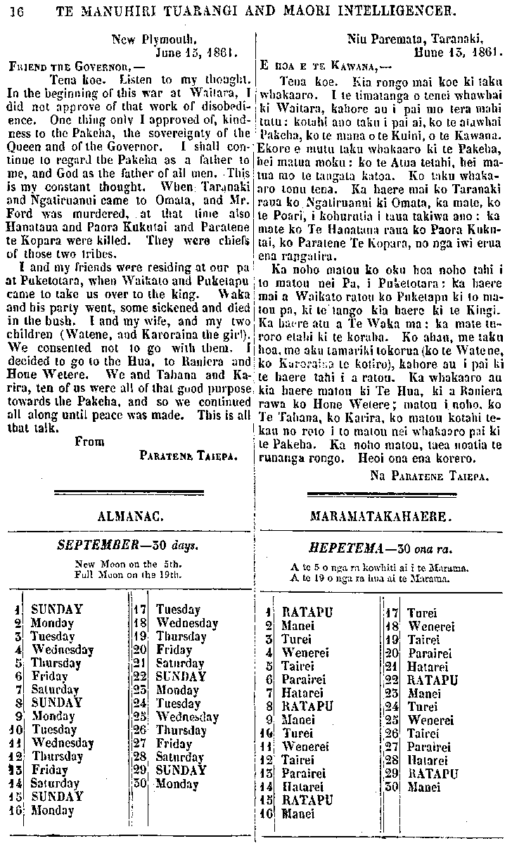 16 TE MANUHIRI TUARANGI AND MAORI INTELLIGENCER. New Plymouth, June 15, 1861. FRIEND THE GOVERNOR,— Tena koe. Listen to my thought. In the beginning of this war at Waitara, I did not approve of that work of disobedi- ence. One thing only I approved of, kind- ness to Ihe Pakeha, the sovereignty of the Queen and of the Governor. I shall con- tinue to regard the Pakeha as a father to me, and God as the father of all men. This; is my constant thought. When: Taranaki and Ngatiruanui came to Omata, and Mr. Ford was murdered, . at that lime also Hanataua and Paora Kukutai and Paratene te Kopara were killed. They were chiefs of those two tribes. I and my friends were residing at our pa at Puketotara, when Waikato and Puketapu came to take us over to the king. Waka and his parly went, some sickened and died in the bush. 1 and my wife, and my two children (Watene, and Karoraina the girl). We consented not to go with them. I decided to go to the Hua, to Raniera and Hone Wetere. We and Tahana and Ka- rira, ten of us were all of that good purpose towards the Pakeha, and so we continued all along until peace was made. This is all that talk. From PARATENE, TAIEPA. Niu Paremata, Taranaki, Hune 15, 1861. E HOA E TE KAWANA,— Tena koe. Kia rongo mai koe ki taku whakaaro. I te timatanga o tenei whawhai ki Waitara, kahore au i pai mo tera mahi tutu: kotahi ano taku i pai ai, ko te atawhai Pakeha, ko te mana o te Kuini, o te Kawana. Ekore e mutu taku whakaaro ki te Pakeha, hei matua moku : ko te Atua tetahi, hei ma- tua mo te tangata katoa. Ko taku whaka- aro tonu tena. Ka haere mai ko Taranaki raua ko Ngatiruanui ki Omata, ka mate, ko te Poari, i kohurutia i taua takiwa ano : ka mate ko Te Hanataua raua ko Paora Kuku- tai, ko Paratene Te Kopara, no nga iwi erua ena rangatira. Ka noho matou ko oku hoa noho tahi i to matou nei Pa, i Puketotara: ka haere mai a Waikato ratou ko Puketapu ki to ma- tou pa, ki te tango kia haere ki te Kingi. Ka haere atu a Te Waka ma : ka mate tu" roro etahi ki te koraha. Ko ahau, me taku hoa, me aku tamariki tokorua (ko te Watene, ko Karoraina te kotiro), kahore au i pai ki te haere tahi i a ratou. Ka whakaaro au kia haere matou ki Te Hua, ki a Raniera rawa ko Hone Wetere; matou i noho, ko Te Tahana, ko Karira, ko matou kotahi te- kau no roto i to matou nei whakaaro pai ki te Pakeha. Ka noho matou, taea noatia te runanga rongo. Heoi ona ena korero. Na PARATENE TAIEPA.