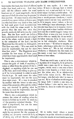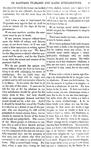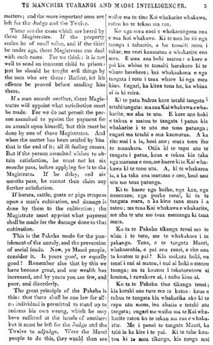 TE MANUHIRI TUARANGI AND MAORI INTELLIGENCER. matters; and the more important ones are left for the Judge and the Twelve. These; are the cases which are heard by these Magistrates. if the property stolen be of small value, and if the thief be under age, these Magistrates can deal with such cases. For we think: it is not well to send an innocent child to prison; lest he should be taught evil things by the men who are there: Rather, let his offence be proved before sending him there. If a man assault another, these Magis- trates will appoint what satisfaction must be made. For we do not permit the per- son assaulted to appoint the payment for an assault upon himself; but this must be done by one of those Magistrates. And when the matter has been settled by him that is the end of it; all ill feeling ceases. But if the person assaulted wishes to ob- tain satisfaction, he must not let six months pass, before applying for it to the Magistrate. If he delay, and six months pass, he cannot then claim any further satisfaction. If horses, cattle, goats or pigs trespass upon a man's cultivation, and damage is done by them to the cultivation; the Magistrate must appoint what payment shall be made for the damage done to that cultivation. This is the Pakeha mode for the pun- ishment of the unruly, and the prevention of social feuds. Now, ye Maori people, consider it. Is yours good, or equally good? Remember also that by this we have become great, and our wealth has increased, and by yours you are few, and poor, and disorderly. The great principle of the Pakeha is this: that there shall be one law for all: no individual is permitted to stand up to redress his own wrong, which he may have suffered at the hands of another: but it must be left for the Judge and the Twelve to adjudge. Were the Maori people to do this, they would, then see waiho ma te tino Kai whakarite whakawa, ratou ko te tekau ma rua. Ko nga mea enei e whakarangona ana e aua Kai whakawa. Ki te mea he iti nga taonga i tahaetia, a he tamaiti nana i tahae, ma enei kaumatua e whakarite ena mea. E mea ana hoki matou: e kore e pai kia whiua te tamaiti harakore ki te whare herehere; kei whakaakona e nga tangata i roto i taua whare ki nga mea kino. Engari, ka kitea tona he, ka whiua ai ia ki reira. Ki te patu huhua kore tetahi tangata tetahi tangata: ma aua Kai whakawa e wha- karite, me aha te utu. E kore ano hoki e tukua e matou te tangata i patua kia whakarite i te utu mo tona patunga; engari ma tetahi o aua kaumatua. A ka rite mai i a ia, heoi ano; mutu tonu iho te mauahara. Otiia ki te rapu utu te tangata i patua, kaua e tukua kia taka nga marama e ono, me haere ki te Kai wha- kawa ki te tono utu. A, ki te whakaroa ia, a ka taka aua marama e ono, heoi ano utu mo taua patunga. Ki te haere nga hoiho, nga kau, nga nanenane, nga poaka ranei, ki ta te tangata mara, a ka kino tana mara i a ratou; ma taua Kai whakawa e whakarite, me aha te utu mo taua meatanga ki taua I mara. Ko ta te Pakeha tikanga tenei mo te whiu i te tutu, mo te whakakore i te pakanga. Tena, e te tangata Maori, whakaarohia, e pai ana ranei, e rite ana ta koutou te pai? Kia mahara hoki, na tenei i nui ai matou, i nui ai hoki o matou taonga; na ta koutou i tokotorutoru ai koutou, i rawakore ai, i noho kino ai. Ko ta te Pakeha tino tikanga tenei; kia kotahi ano ture mo te katoa: kaua e tukua te tangata kia whakatika ake ki te rapu utu mona, ina ahatia e tetahi atu tangata; engari me waiho ma te Kai whaka rite ratou ko te tekau ma rua e whaka- rite, Me i penei te tangata Maori, ka tahi ia ka kite i te pai. Ki te tohe kou- tou ki to mua tikanga, kia rongo mai