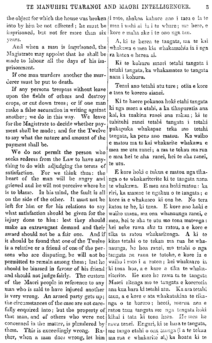 TE MANUHIRI TUARANGI AND MAORI INTELLIGENCER. 3 the object for which the house was broken into by him be not effected; he must be imprisoned, but not for more than six years. And when a man is imprisoned, the Magistrate may appoint that he shall be made to labour all the days of his im- prisonment. If one man murders another the mur- derer must be put to death. If any persons trespass without leave upon the fields of others and destroy crops, or cut down trees; or if one man make a false accusation in writing against another; we do in this way. We leave for the Magistrate to decide whether pay- ment shall be made; and for the Twelve to say what the nature and amount of the payment shall be. We do not permit the person who seeks redress from the Law to have any- thing to do with adjudging the terms of satisfaction. For we think thus: the heart of the man will be angry and grieved and he will not perceive where he is to blame. In his mind, the fault is all on the side of the other. It must not be left for him or for his relations to say what satisfaction should be given for the injury done to him: lest they should make an extravagant demand and their award should not be a fair one. And if it should be found that one of the Twelve is a relative or a friend of one of the per- sons who are disputing, he will not be permitted to remain among them; lest he should be biassed in favour of his friend and should not judge fairly. The custom of the Maori people in reference to any man who is said to have injured another is very wrong. An armed party gets up; the circumstances of the case are not care- fully enquired into; but the property of that man, and of others who were not concerned in the matter, is plundered by them. This is exceedingly wrong. Ra- ther, when a man does wrong, let him i roto, ahakoa kahore ano i taea e ia te mea i wahi ai ia i te whare, me here, e kore e maha ake i te ono nga tau. A, ki te herea te tangata, ma te kai whakawa e mea kia whakamahia ia i nga ra katoa e herea ai. Ki te kohuru maori tetahi tangata i tetahi tangata, ka whakamatea te tangata nana i kohuru. Tenei ano tetahi atu ture; otiia e kore e taea te korero aianei. Ki te haere pokanoa hoki etahi tangata ki nga mara a etahi, a ka tikopuratia ana kai, ka tuakina ranei ana rakau; ki te tuhituhi ranei tetahi tangata i tetahi pukapuka whakapae teka mo tetahi tangata, ka pena ano matou. Ka waiho e matou ma te kai whakarite whakawa e mea me utu ranei; a ma te tekau ma rua e mea hei te aha ranei, hei te aha ranei, te utu. E kore hoki e tukua e matou nga tika- nga o te whakariterite ki te tangata nana te whakawa. E mea ana hoki matou: ka riri, ka mamae te ngakau o te tangata; e kore ia e whakaaro ki ona he. No tera katoa te he, ki tana. E kore ano hoki e waiho mana, ma ona whanaunga ranei, e mea, hei te aha te utu mo tona matenga: kei neke rawa ake ta ratou, a e kore e tika ta ratou whakaritenga. A ki te kitea tetahi o te tekau ma rua he wha- naunga, he hoa ranei, mo tetahi o nga tangata na raua te totohe, e kore ia e waiho i roto i a ratou; kei whakaaro ia ki tona hoa, a e kore e tika te whaka- riterite. He mea he rawa ta te tangata Maori ritenga mo te tangata e korerotia ana kua hara ki tetahi atu. Ka ara tetahi i; aua, a e kore e ata whakatakina te tika nga o te korero; heoi, murua ana e ratou taua tangata me nga tangata hoki kihai i tata ki tona hara. Re mea he rawa tenei. Engari, ki te hara te tangata, me tango etahi o ona taonga (i a te tekau ma rua e whakarite ai,) ka hoatu ki te