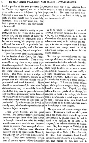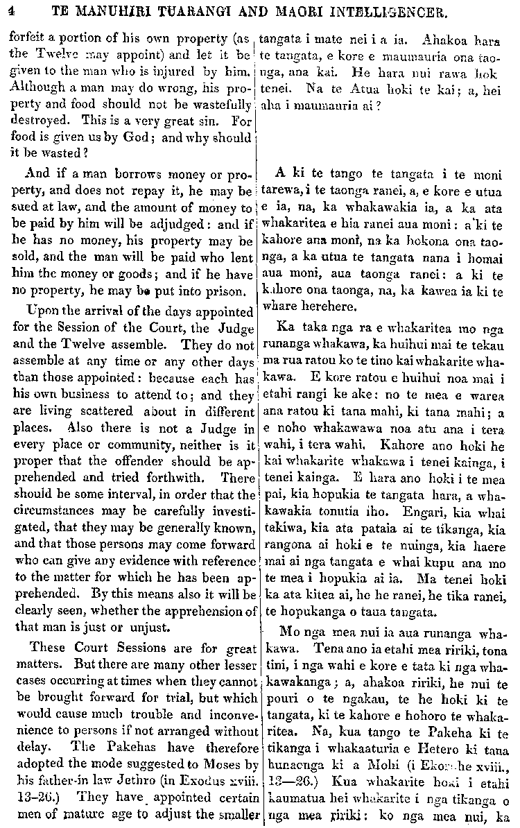 TE MANUHIRI TUARANGI AND MAORI INTELLIGENCER. forfeit a portion of his own property (as the Twelve may appoint) and let it be given to the man who is injured by him. Although a man may do wrong, his pro- perty and food should not be wastefully destroyed. This is a very great sin. For food is given us by God; and why should it be wasted? And if a man borrows money or pro- perty, and does not repay it, he may be sued at law, and the amount of money to be paid by him will be adjudged: and if he has no money, his property may be sold, and the man will be paid who lent him the money or goods; and if he have no property, he may be put into prison. Upon the arrival of the days appointed for the Session of the Court, the Judge and the Twelve assemble. They do not assemble at any time or any other days than those appointed: because each has his own business to attend to; and they are living scattered about in different places. Also there is not a Judge in every place or community, neither is it proper that the offender should be ap- prehended and tried forthwith. There should be some interval, in order that the circumstances may be carefully investi- gated, that they may be generally known, and that those persons may come forward who can give any evidence with reference to the matter for which he has been ap- prehended. By this means also it will be clearly seen, whether the apprehension of that man is just or unjust. These Court Sessions are for great matters. But there are many other lesser cases occurring at times when they cannot be brought forward for trial, but which would cause much trouble and inconve- nience to persons if not arranged without delay. The Pakehas have therefore adopted the mode suggested to Moses by his father-in-law Jethro (in Exodus xviii. 13-26.) They have appointed certain men of mature age to adjust the smaller tangata i mate nei i a ia. Ahakoa hara te tangata, e kore e maumauria ona tao- nga, ana kai. He hara nui rawa hoki tenei. Na te Atua hoki te kai; a, hei aha i maumauria ai? A ki te tango te tangata i te moni tarewa, i te taonga ranei, a, e kore e utua e ia, na, ka whakawakia ia, a ka ata whakaritea e hia ranei aua moni: a ki te kahore ana moni, na ka hokona ona tao- nga, a ka utua te tangata nana i homai aua moni, aua taonga ranei: a ki te kahore ona taonga, na, ka kawea ia ki te whare herehere. Ka taka nga ra e whakaritea mo nga runanga whakawa, ka huihui mai te tekau ma rua ratou ko te tino kaiwhakarite wha- kawa. E kore ratou e huihui noa mai i etahi rangi ke ake: no te mea e warea ana ratou ki tana mahi, ki tana mahi; a e noho whakawawa noa atu ana i tera wahi, i tera wahi. Kahore ano hoki he kai whakarite whakawa i tenei kainga, i tenei kainga. E hara ano hoki i te mea pai, kia hopukia te tangata hara, a wha- kawakia tonutia iho. Engari, kia whai takiwa, kia ata pataia ai te tikanga, kia rangona ai hoki e te nuinga, kia haere mai ai nga tangata e whai kupu ana mo te mea i hopukia ai ia. Ma tenei hoki ka ata kitea ai, he he ranei, he tika ranei, te hopukanga o taua tangata. Mo nga mea nui ia aua runanga wha- kawa. Tena ano ia etahi mea ririki, tona tini, i nga wahi e kore e tata ki nga wha- kawakanga; a, ahakoa ririki, he nui te pouri o te ngakau, te he hoki ki te tangata, ki te kahore e hohoro te whaka- ritea. Na, kua tango te Pakeha ki te tikanga i whakaaturia e Hetero ki tana hunaonga ki a Mohi (i Ekoruhe xviii., 13—26.) Kua whakarite hoki i etahi kaumatua hei whakarite i nga tikanga o nga mea ririki; ko nga mea nui, ka