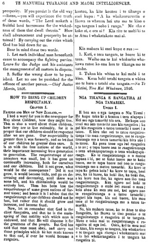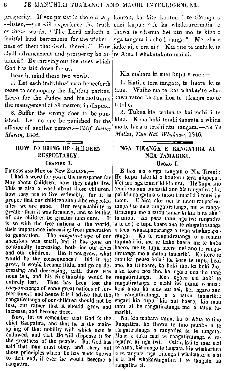 6 TE MANUHIRI TUARANGI AND MAORI INTELLIGENCER. prosperity. If you persist in the old way —listen,—you will experience the truth of these words, "The Lord maketh a fruitful land barrenness for the wicked- ness of them that dwell therein." How shall advancement and prosperity be at- tained? By carrying out the rules which God has laid down for us. Bear in mind these two words. 1. Let each individual man henceforth cease to accompany the fighting parties. Leave for the Judge and his assistants the management of all matters in dispute. 2. Suffer the wrong doer to be pun- ished. Let no one be punished for the offence of another person.—Chief Justice Martin, 1846. HOW TO BRING UP CHILDREN RESPECTABLY. CHAPTER I. FRIENDS AND MEN OF NEW ZEALAND,— I had a word for you in the newspaper for May about Children, how they might live. This is also a word about those children, how they are to live estimably, for it is proper that our children should be respected after we are gone. Our respectability is greater than it was formerly, and so let that of our children be greater than ours. It is so with the free nations of the world, their importance increasing from generation to generation. The rangatiratanga of our ancestors was small, but it has gone on continually increasing, both for ourselves and our children. Bid it not grow, what would be the consequence? Did it not grow, it would become little, and go on de- creasing and decreasing, until there was none left, and bis chieftainship would be entirely lost, Thus has been lost the rangatiratanga of some great nations of for mer limes; and hence it is 1 advise that the rangatiratanga of our children should not be lost, but rather that it should grow and increase, and become fixed. Now, let us remember that God is the chief Rangatira, and that he is the main- spring of that nobility with which man is endowed, and that He will dispense it for the greatness of the people. But God has said that man must obey, and carry out those principles which he has made known to that end, if ever he would become a rangatira. koutou, ka kite koutou i te tikanga o enei kupu: " A ka whakaururuatia e Ihowa te whenua hei utu mo te kino o nga tangata i noho i runga." Me aha e kake ai, e ora ai? Kia rite te mahi ki ta te Atua i whakatakoto mai ai. Kia mahara ki enei kupu e rua:— 1. Kati, e tera tangata, te haere ki te taua. Waiho ma te kai whakarite wha- kawa ratou ko ona hoa te tikanga mo te totohe. 2. Tukua kia whiua te kai mahi i te kino. Kaua hoki tetahi tangata e whiua mo te hara o tetahi atu tangata.—Ae Te Matini, Tino Kai Whakawa, 1846. NGA TIKANGA E RANGATIRA AI NGA TAMARIKI. UPOKO I. E hoa ma e nga tangata o Niu Tireni: He kupu taku ki a koutou i tera niupepa i Mei mo nga tamariki kia ora. He kupu; mo tenei mo aua tamariki ano kia rangatira; ka pai kia rangatira o tatou tamariki i muri i a tatou. E hira ake nei to tatou rangatira- tanga i to mua rangatiratanga me te ranga- tiratanga mo a tatou tamariki kia hira ake i to tatou. Ka pena tonu nga iwi rangatira a te ao; e tupu haere ana te rangatiratanga o tena whakapaparanga o tena whakapapa - ranga. Ko te rangatiratanga o o matou tupuna i iti, me te kake haere me te kake haere, me te tupu haere nei ano te ranga tiratanga mo a matou tamariki. Ka kore te tupu ka pehea koia? ka kore te tupu, heoi ano, ka iti haere, ka hoki iho, ka hoki iho, a ka kore noa iho, ka ngaro noa iho tona ranga timatanga. Kua ngaro nei hoki te rangatiratanga o etahi iwi nunui o mua; koia ahau ka mea atu nei, kei ngaro ano te rangatiratanga o a tatou tamariki; engari kia tupu, kia nui haere, kia mau tonu ai he rangatiratanga mo a tatou ta- mariki. Na, kia mahara tatou, ka te Atua te tino Rangatira, ko Ihowa te tino putake o te rangatiratanga e rangatira ai te tangata. Mana e tuku mai te rangatiratanga e ra ngatira ai nga iwi. Otira, kei te mea mai te Atua, kia rongo te tangata, kia whakaritea e te tangata nga ritenga i whakaaturia mai e ia hei whakarangatira i te tangata ka rangatira ai.
