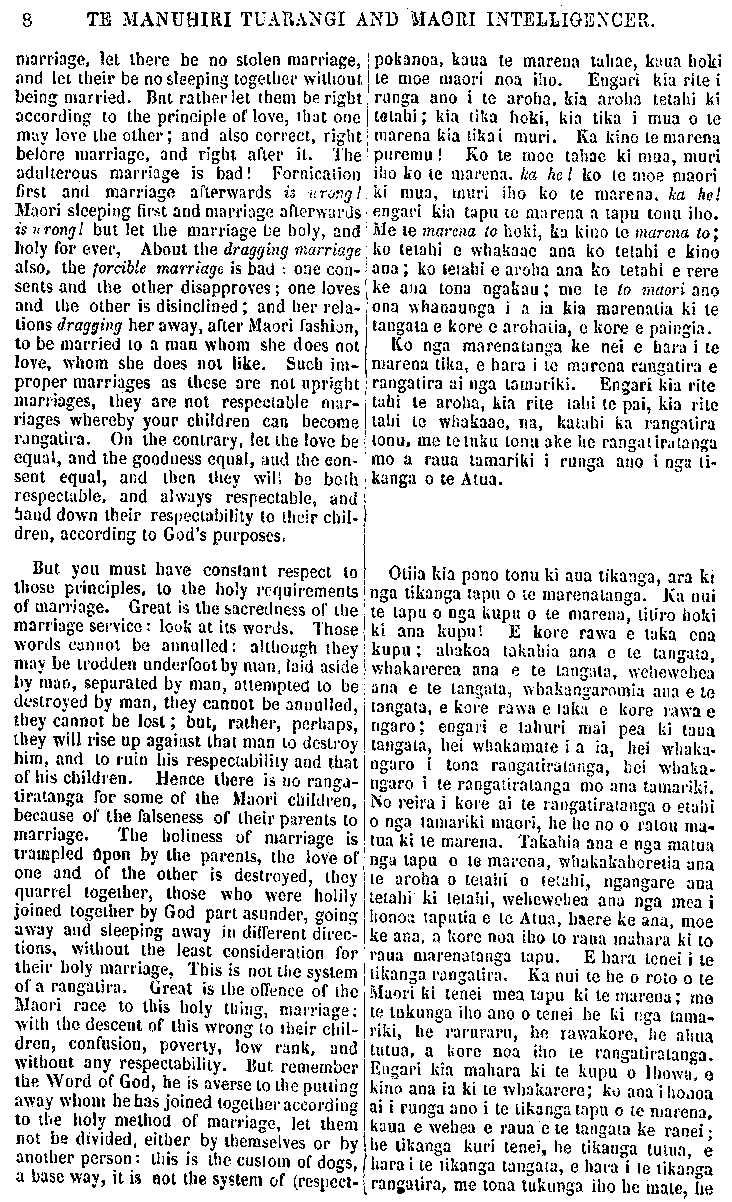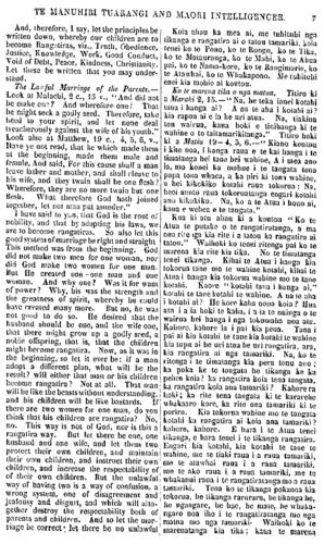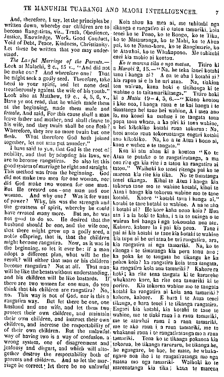 TE MANUHIRI TUARANGI AND MAORI INTELLIGENCER. 7 And, therefore, 1 say, let the principles be written down, whereby our children are to become Rangatiras, viz., Truth, Obedience, Justice, Knowledge, Work, Good Conduct, Void of Debt, Peace, Kindness, Christianity. Let these be written that you may under- stand. The Lairful Marriage of the Parents.— Look at Malachi, 2 c., 15 v., "And did not be make one? And wherefore one ? That he might seek a godly seed. Therefore, lake heed to your spirit, and let none deal treacherously against the wife of his youth." Look also at Matthew, 19 c., 4, 5, 6, v., Have ye not read, that he which made them at the beginning, made them male and female, And said, For this cause shall a man leave father and mother, and shall cleave to his wife, and they twain shall be one flesh? Wherefore, they are no more twain but one flesh. What therefore God hath joined together, let not man put asunder." I have said to you, that God is the root of nobility, and that by adopting bis laws, we are to become rangatiras. So also let this good system of marriage be right and straight This method was from the beginning. God did not make two men for one woman, nor did God make two women for one man. But He created one-one man and one woman. And why one? Was it for want of power? Why, his was the strength and the greatness of spirit, whereby be could have created many more. But no, he was not good to do so. He desired that the husband should be one, and the wife one, that there might grow up a godly seed, a noble offspring, that is, that the children might become rangatira. Now,; as it was in the beginning', so let it ever be: if a man adopt a different plan, what will be the result? will either that man or his children become rangatira? Not at all. That man will belike the beasts without understanding, and his children will be like bastards. If these are two women for one man, do you think that his children are rangatira? No, no. This way is not of God, nor is this a rangatira way. But let there be one, one husband and one wife, and let them two protect their own children, and maintain their own children, and instruct their own children, and increase the respectabilily of of their own children. But the unlawful way of having two is a way of confusion, a wrong system, one of disagreement and jealousy and disgust, and which will. alto- gether destroy the respectability both of, parents and children. And so let the mar- riage be correct let there be no unlawful Koia ahau ka mea ai, me tuhituhi nga tikanga e rangatira ai o tatou tamariki, koia tenei ko te Pono, ko te Rongo, ko te Tika, ko te Matauranga, ko te Mahi, ko te Ahua pai, ko te Nama kore, ko te Rangimarie, ko te Atawhai, ko te Whakapono. Me tuhituhi enei kia mohio ai koutou. Ko te marena tika o nga matua, Titiro ki a Maraki 2, 15.—" Na, he teka ianei kotahi tana i hanga ai? A na te aha i kotahi ai? kia rapua ai e ia he uri atua. Na, tiakina tou wairua, kaua hoki e tinihanga ki te wahine o to taitamarikitanga." Titiro hoki ki a Matiu 19—4, 5, 6.—''Kiano koutou i kite noa, i hanga raua e te kai hanga i te timatanga hei tane hei wahine, A i mea anu ia, mo konei ka mahue i (e tangata tona papa tona whaea; a ka piri ki tona wahine, a hei kikokiko kotahi raua tokorua: Na, heoi ano to raua tokoruatanga engari kotahi ano kikokiko. Na, ko a te Atua i hono ai, kaua e wehea e te tangata." Kua ki atu ahau ki a koutou "Ko te Atua te putake o te rangatiratanga, a ma ona rite nga kia rite i a tatou ka rangatira ai tatou." Waihoki ko tenei ritenga pai ko te marena kia rite kia tika. No te timatanga tenei tikanga. Kihai te Atua i hanga kia tokorua tane mo te wahine kotahi, kihai te Atua i hanga kia tokorua wahine mo te tane kotahi. Kaore "kotahi tana i hanga ai," ko! ahi te tane kotahi te wahine. A na te aha i kotahi ai? He kore kaha nona koia? Hua atu i a ia hoki te kaha, i a ia te nuinga o te wairua hei hanga i nga tokomaha noa atu. Kahore, kahore ia i pai kia pena. Tana i pai ai kia kotahi te tane kia kotahi te wahine kia tupu ai he uri atua he uri rangatira, ara, kia rangatira ai nga tamariki. Na, ko te ritenga i te timatanga kia pera tonu ano; ka poka ke te tangata he tikanga ke ka pehea koia? ka rangatira koia tena tangata, ka rangatira koia aua tamariki? Kahore ra hoki; ka rite tena tangata ki te kararehe whakaaro kore, ka rite ona tamariki ki te poriro. Kia tokorua wahine mo te tangata kotahi ka rangatira ai koia ana tamariki? kahore, kahore. E hara i te Atua tenei tikanga, e hara tenei i te tikanga rangatira. Engari kia kotahi, kia kotahi te tane te wahine, me te tiaki raua i a raua tamariki, me te atawhai raua i a raua tamariki, me te ako raua i. a raua tamariki, me te whakanui raua i te rangatiratanga mo a raua tamariki. Tona ko te tikanga pokanoa kia tokorua, he tikanga raruraru, he tikanga he, he ngangara, he hae, he male, he whaka- ngaro noa iho i te rangatiratanga mo nga matua mo nga tamariki- Waihoki ko te marenatanga kia tika; kaua te marena