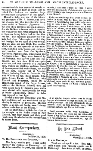 14 TE MANUHIRI TUARANGI AND MAORI INTELLIGENCER. sion testimonials from (masters of vessels, -— written in 1828 and 1829, at which lime he visited Port Jackson, and received large presents from the Governor of that colony. Henare te Keha was one or the friends and protectors of Mr. R. Barrett, and Love, the whalers, and who were the first Euro- peans settled at Taranaki (Ngamotu. It was with their assistance and six-pounders, that the Waikato tribe met with a repulse, and most severe loss, when attacking his pa at Moturoa, being driven back to the Aho- roa flat. This happened just after the Wai- kato had taken Pukerangiora, which they had beseiged for the space of three months. This was about the year 1852. The number within the pa was upwards of four thou- sand, including men, women and children, and contained men from the Ngatiawa, Ngatitama Ngatimutunga Ngatiruanui and Ngatimaru tribes. They were invested by the Waikatos, who starved them into sub- mission, and then slew 1600 men quite worn out, and took upwards of a thousand men. women and children, as slaves. Some of the conquered fled to the South, by way of the bush, coming out at Ngateko. Others, including Paora te Horoatua, Ra- wiri Waiawa his son, Hone Kopiha Nga- motu, Arama Karaka te Mitikakau, with Edward and Poharama, made off to Hongihongi island of the Sugar Loaves, whither the Waikatos followed them but were driven back by Barrett's guns, which were shotted with round pebbles for want of better ammunition. Henare te Keha was engaged in that fight. He was a man well acquainted with Na- tive traditions, and was considered an au- thorily in matters of genealogy. His last words to his sons and family, were "always adhere to the laws of the Pakeha." Let this chief Henare te Keha be taken as an example by the Native youth of New Zealand, that their names and their good works may likewise be held in remembrance in future years. Maori Correspondence. Mahurangi, October 31 1860. To His EXCELLENCY THE GOVERNOR,— This is my word to you. I have called together my runanga at Mahurangi. All the tribe assembled to speak, and to listen to kaipuke, i tuhia mai i 1828 nga -1829 : i reira hoki Iana haerenga ki Poihakena, me tana wha- kawhiwhinga ki nga taonga utu nui e (e Kawana o tena Koroni. Ko ia ano tetahi o nga hoa aroha me nga ka tiaki o Te Pareti raua ko Tone, nga kai patu Wheira, o Ngamotu, ko raua hoki i noho mata- mua ki reira o nga Pakeha katoa. Na raua hoki, na nga purepo i whakahokia mai a Wai- kato ki (e Ahoroa, me te male ano, i ta ratou whakaekenga o te pa i Moturoa. Ko tenei wha- tinga o Waikato no muri tonu iho o Ie horonga o Pukerangiora, i te mea kua whakawaia te pa i nga marama e toru. No te tau 1852 (enei pa horo. Hui katoa nga tangata i roto i te pa, e wha mano (takitahi), ara, nga tane, nga wahine, me nga tamariki. Ko nga iwi i roto, ko Ngati- awa, ko Ngatitama, ko Ngatimutunga, ko Ngati- ruanui, ko Ngatimaru, me etahi atu. I kara- potia rawatia ratou e Waikato, i whakatikia ki te kai a hemo noa: te putanga mai ki waho, na ka patua o nga tane 1600 (he mea kiko kore anake), a kotahi te mano e te lane, o (e wahine, o te tamariki, ka herea hoki e ratou hei taureka- reka. Ko etahi o nga oranga, 1 tahuti ki runga ki Kaputi, i na Ie ngaherehere a puta noa ki I Ngateko : ko etahi ka rere ki Hongihongi, kei uta nei o Ngamotu, a kei a ratou a Paora To Horoatua, a Rawiri Waiawa [Iana (ama), a Hone Kopiha Ngamotu, a Arama Karaka Te Mitakakau, a Poharama hoki, raua ko Eruera. Na, ka whaia ratou e Waikato ki reira ; otiia, i patua mai ano te taua e nga pu-huri-whenua o Pareti, ahakoa i purua kautia ki nga kowhatu potaka taka. Na, ko Henare To Keha i reira, i roto I ano i tena whawhai. E ki ana, he tangata mohio rawa ia ki nga korero whakahaere tikanga onamata, me nga whakapaparanga. Ko tana poroporoaki ki ana tamariki ratou ko tona iwi, koia tenei, " Kia piri tonu ratou ki nga Ture a te Pakeha." Heoti ano--me waiho (enei kaumatua, a Henare Te Keha, hei tauira mo nga taitamariki Maori o Niu Tireni, kia pera ai (e maharatanga ki o ra (ou ingoa, me o ratou mahi pai, i nga (au katoa e haere ake nei. He Reta Maori Mahurangi, Oketopa 31,1861. Ki A TE KAWANA,— Tenei ano te kupu ki a koe. Kua tuhi tuhia e ahau toku runanga e noho ana ki Mahurangi. Poto katoa te iwi ki te korero,