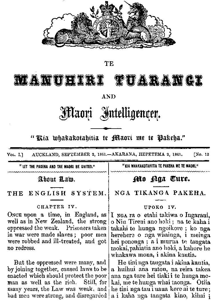 Te Manuhiri Tuarangi Maori Intelligencer 1861: Number 12. 02 September 1861 |