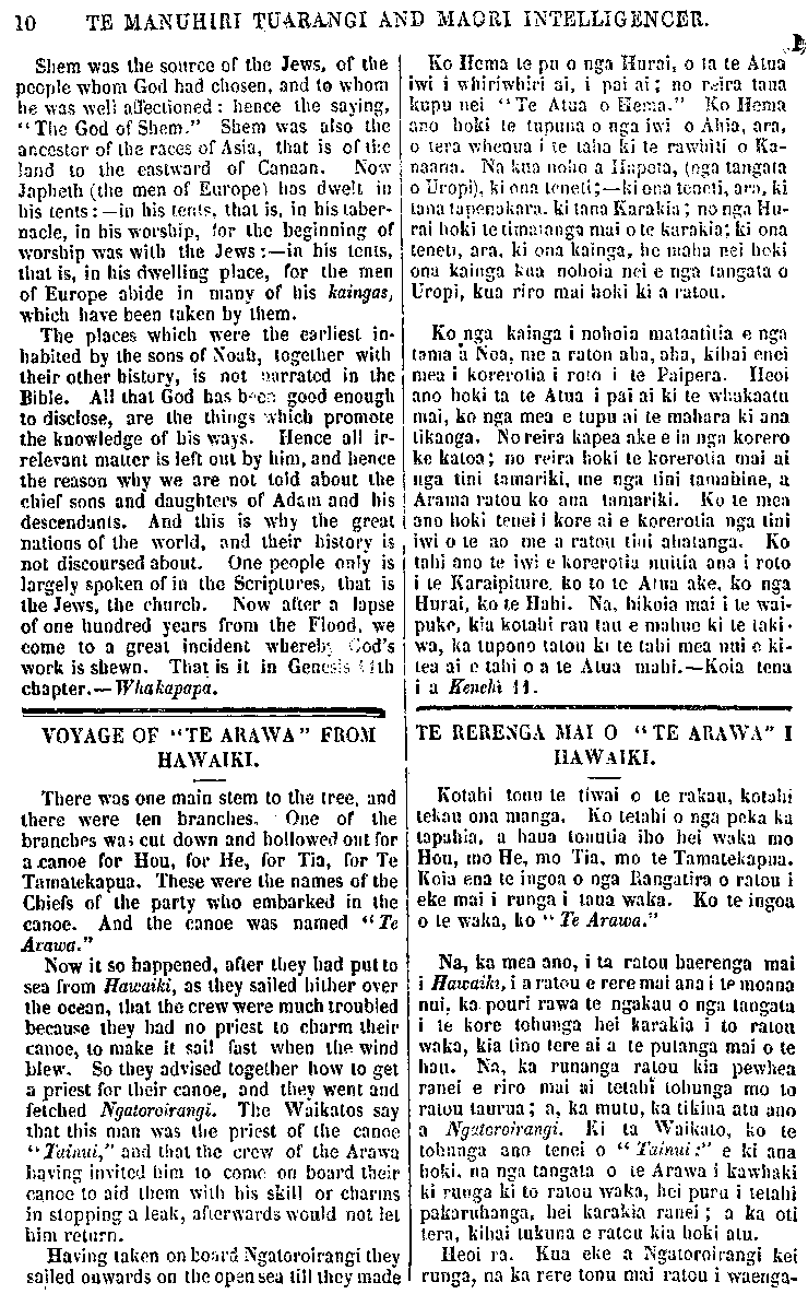 10 TE MANUHIRI TAUARANGI AND MAORI INTELLIGENCER. Shem was the source of the Jews, of the people whom God had chosen, and to whom he was well affectioned : hence the saying, "The God of Shem." Shem was also the ancestor of the races of Asia, that is of the land to the eastward of Canaan. Now Japheth (the men of Europe) has dwelt in his tents:—in his tents, that is, in his taber- nacle, in his worship, for the beginning of worship was with the Jews:—in his tents, that is, in his dwelling place, for the men of Europe abide in many of his kaingas, which have been taken by them. The places which were the earliest in- habited by the sons of Noah, together with their other history, is not narrated in the Bible. All that God has been good enough to disclose, are the things which promote the knowledge of his ways. Hence all ir- relevant matter is left out by him, and hence the reason why we are not told about the chief sons and daughters of Adam and his descendants. And this is why the great nations of the world, and their history is not discoursed about. One people only is largely spoken of in the Scriptures, that is the Jews, the church. Now after a lapse of one hundred years from the Flood, we come to a great incident whereby God's work is shewn. That is it in Genesis 11th chapter.— Whakapapa. VOYAGE OF "TE ARAWA" FROM HAWAIKI. There was one main stem to the tree, and there were ten branches. One of the branches was cut down and hollowed out for a canoe for Hou, for He, for Tia, for Te Tamatekapua. These were the names of the Chiefs of the parly who embarked in the canoe. And the canoe was named "Te Arawa." Now it so happened, after they had put to sea from Hawaiki, as they sailed hither over the ocean, that the crew were much troubled because they had no priest to charm their canoe, to make it sail fast when the wind blew. So they advised together how to get a priest for their canoe, and they went and fetched Ngatiroirangi. The Waikatos say that this man was the priest of the canoe "Tainui" and that the crow of the Arawa Laving invited him to come on board their canoe to aid them with his skill or charms in slopping a leak, afterwards would not let him return. Having taken on board Ngatiroirangi they sailed onwards on the open sea till they made Ko Hema te pu o nga Hurai, o ta te Atua iwi i whiriwhiri ai, i pai ai; no reira taua kupu nei "Te Atua o hema" Ko Hema ano hoki te tupuna o nga iwi o Ahia, ara o tera whenua i te taha ki te rawhiti o ka- naana. na kua noho a Hapeta (nga tangata o Uropi) ki ona teneti; ki ona teneti, ara ki tana tapenakara, ki tana Karakia, no nga Hu- rai hoki te tamatanga mai o te karakia, ki ona teneti ara ki ona kainga he maha bnei hoki ona kainga kua nohoia nei e nga tangata o Uropi, kua riro mai hoki ki a ratou. Ko nga kainga i nohoia mataatitia e nga tama a Noa, me a ratou aha, aha, kihai enei mea i korerotia i roto i te Paipera. Heoi ano hoki ta te Atua i pai ai ki te whakaatu mai, ko nga mea e tupu ai te mahara ki ana tikanga. No reira kapea ake e iia nga korero ke katoa; no reira hoki te korerotia mai ai nga tini tamariki, me nga tini tamahine, a Arama ratou ko ana tamariki. Ko te mea ano hoki tenei i kore ai e korerotia nga tini iwi o te ao me a ratou tini ahatanga. Ko tahi ano te iwi e korerotia nuitia ana i roto i te Karaipiture, ko to te Atua ake, ko nga Hurai, ko te Hahi. Na, hikoia mai i te wai- puke, kia kotahi rau tau e mahue ki te taki- wa, ka tupono tatou ki te tahi mea nui e ki- tea ai e tahi o a te Atua mahi.—Koia tena i a Kenehi 11. TE RERENGA MAI O (< TE ARAWA" I HAWAIKI. Kotahi tonu te tiwai o te rakau, kotahi tekau ona manga. Ko tetahi o nga peka ka tapahia, a haua tonutia iho hei waka mo Hou, mo He, mo Tia, mo te Tamatekapua. Koia ena te ingoa o nga Rangatira o ratou i eke mai i runga i taua waka. Ko te ingoa o te waka, ko " Te Arawa." Na, ka mea ano, i ta ratou haerenga mai i Hawaiki, i a ratou e rere mai ana i IP moana nui, ka pouri rawa te ngakau o nga tangata i te kore tohunga hei karakia i to ratou waka, kia tino tere ai a te putanga mai o te hau. Na, ka runanga ratou kia pewhea ranei e riro mai ai tetahi tohunga mo to ratou taurua; a, ka mutu, ka tikina atu ano a Ngatiroirangi. Ri ta Waikato, ko te tohunga ano tenei o Tainui:" e ki ana hoki, na nga tangata o te Arawa i kawhaki ki runga ki to ratou waka, hei puru i tetahi pakaruhanga, hei karakia ranei; a ka oti tera, kihai tukuna e ratou kia hoki atu. Heoi ra. Kua eke a Ngatiroirangi kei runga, na ka rere tonu mai ratou i waenga-