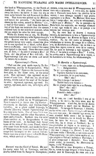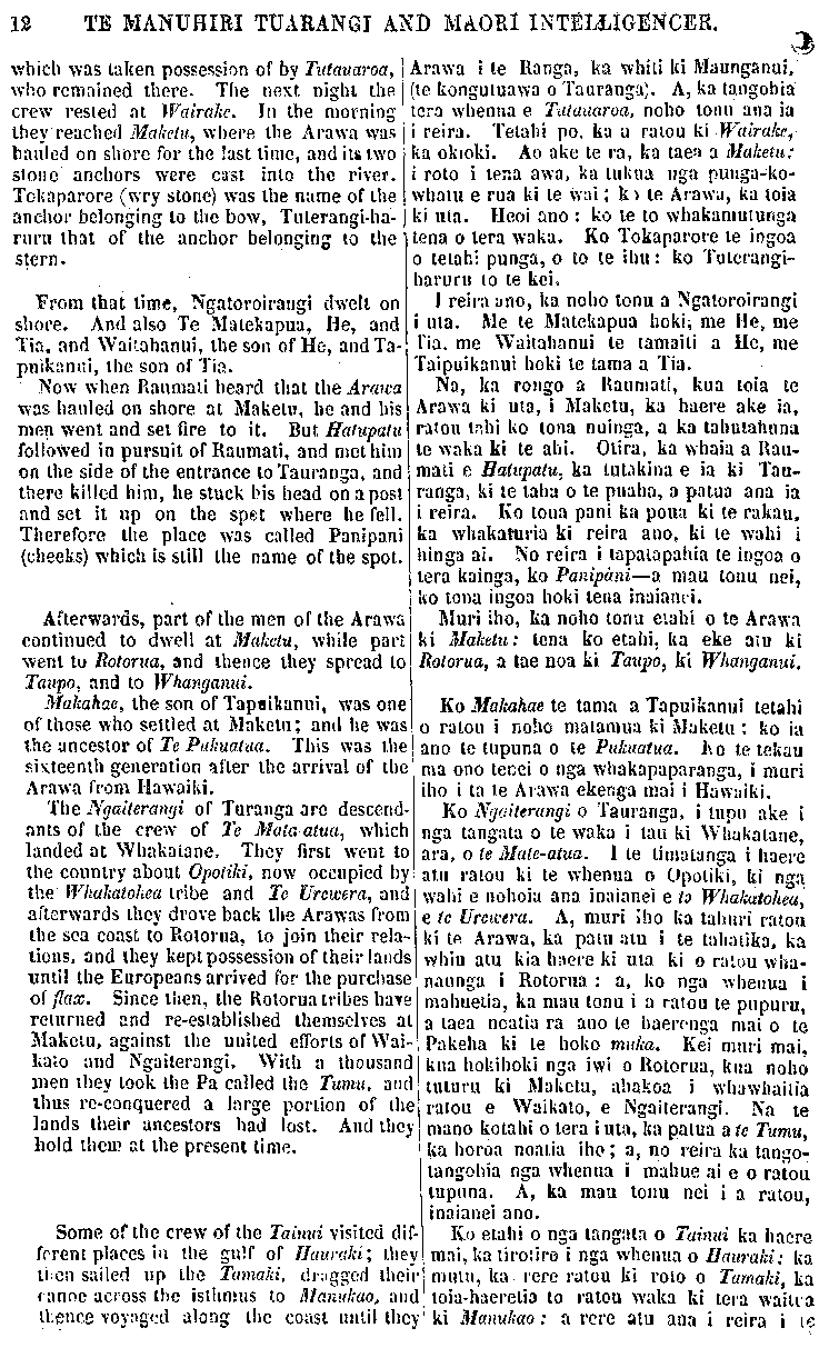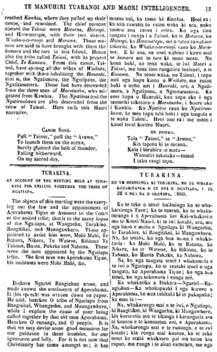 TE MANUHIRI TUARANGI AND MAORI INTELLIGENCER. 13 reached Kawhia, where they pulled up their canoe, and remained. The chief persons aboard the Tainui were Hoturoa, Hotuopi, and Hotumatapu with their two sisters, Whaka-o-te-rangi and Marama. These wo- men are said to have brought with them the kumara and the taro to this Island. Hence also the tribe called Tainui, with its present Chief, Te Kanawa. From this canoe, Tai- nui, have sprung all the tribes of Waikato, together with those inhabiting the Hauraki, that is, the Ngatimaru, the Ngatipaoa, the Ngatitamatera. These last have descended from the three sons of Marutuahu, who mi- grated from Kawhia. The Ngatitoas and the Ngatiraukawa are also descended from the crew of Tainui. Here ends this Maori narrative. CANOE SONG. Pull Tainui," pull the " Arawa." To launch them on the ocean, Surely glanced the bolt of thunder, Falling hitherward. On my sacred day. TURAKINA. AN ACCOUNT OF THE MEETING HELD AT TURA- KINA FOR UNITING TOGETHER THE TRIBE OF NGATIAPA. The objects of this meeting were the carry- ing out the law and the appointment of Aperahama Tipae as Assessor to the Court of the united tribe, that is to the many hapus of the Ngatiapa, at Wangaehu, Turakina, Rangitikei and Maungawhero. Those ap- pointed to assist him were, Mohi Mahi, Te Ratana, Nikera, Te Watene, Rihiona Te Tahana, Hunia, Pukake and Nahona. These were the men appointed by the Ngatiapa tribe. The first man was Aperahama Tipae, his assistants were Mohi Mahi, &c. Ihakara Ngariri Rangiahua arose, and made known the sentiments of Aperahama. It (his speech) was written down on paper. He said, hearken O tribe of Ngatiapa from Rangitikei, Whangaehu, and Maungawhero, while I explain the cause of your being called together by that old man Aperahama. Hearken O runanga, and O people. It is that we may devise some good measures for our guidance in these troubles, for our ignorance and folly. For it is not now that Christianity has come amongst us; it has moana nui, ka tomo ki Kawhia. Heoi ra : ka toia rawatia to ratou waka ki uta, noho tuturu ana ratou i reira. Ko nga tino tangata i runga i a Tainui, ko te Hoturoa, ko Hotuopi, ko Haumatapu, me o ratou tu wahine tokorua, ko Whaka-o-te-rangi raua ko Mara- ma. E ki ana, na enei wahine i kawe mai te kumara me te taro ki tenei motu. No kona hoki, no tena waka, te iwi Maori a Tainui, me tona tino rangatira inaianei, a te Kanawa. No tenei waka, no Tainui, i tupu mai nga hapu katoa o Waikato, me ratou hoki e noho nei i Hauraki, ara, a Ngati- maru, a Ngatipaoa, a Ngatitamatera. Ko enei hapu o Hauraki, kua tupu ake i nga tamariki tokotoru a Marutuahu i haere ake i Kawhia. Ko Ngatitoa raua ko Ngatirau- kawa, he mea tupu tahi hoki i nga tangata o te waka Tainui. Heoi ano ra: me mutu i konei tenei korero Maori. HE PUWHA. Toia " Tainui," te " Arawa," Kia tapotu ki te moana. Koia i hirahira te mata— Whatitiri takataka— tumai I taku rangi tapu. TURAKINA. KO TE HUIHUINGA KI TURAKINA, MO TE WHAKA- KOTAHITANGA O TE IWI O NGATIAPA, I TE 22 O NGA RA O OKETOPA, 1860. Ko te take o tenei huihuinga ko te whaka ritenga Ture, ko te tuarua, ko te whaka- turanga i a Aperahama hei Kaiwhakarite mo te Kooti Maori, ki te iwi kotahi, ara, mo nga hapu e maha o Ngatiapa ki Wangaehu, ki Turakina, ki Rangitikei, ki Mangawhero. Na, ko tetahi, ko nga hoa muna i whaka- turia: ko Mohi Mahi, ko te Ratana, ko Nikera, ko te Watene, ko Rihiona, ko te Tahana, ko Hunia Pakake, ko Nahona. Na, ko nga tangata tenei i whakaturia e te iwi o Ngatiapa, ko te tuatahi tenei o nga tangata, ko Aperahama Tipae; ko nga hua tenei, ko nga tokowaru i runga nei. Ka whakatika a Ihakara—Ngariri—Ra- ngiahua—Ka whakapuaki i nga korero a Aperahama, he mea tuhituhi ki te pukapuka; ka mea ia :— Na, whakarongo mai e te iwi, e Ngatiapa, ki Raugitikei, ki Wangaehu, ki Mangawhero, kia korerotia atu te tikanga i karangatia atu ai koutou e te kaumatua nei, e Aperahama. Na, whakarongo mai e te runanga, e te iwi kotahi; kia rongo mai komou, ko te lake tenei ko etahi whakaaro pai ma tatou kia rapua, mo runga i te ahua raruraru, me nga