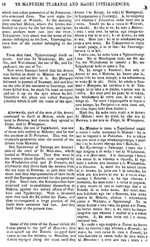 12 TE MANUHIRI TUARANGI AND MAORI INTELLIGENCER. which was taken possession of by Tutauaroa, who remained there. The next night the crew rested at Wairake. In the morning they reached Maketu, where the Arawa was hauled on shore for the last time, and its two stone anchors were cast into the river. Tokaparore (wry stone) was the name of the anchor belonging to the bow, Tuterangi-ha-ruru that of the anchor belonging to the stem. From that time, Ngatoroirangi dwelt on shore. And also Te Matekapua, He, and Tia. and Waitahanui, the son of He, and Ta- puikanui, the son of Tia. Now when Raumati heard that the Arawa was hauled on shore at Maketu, he and his men went and set fire to it. But Hatupatu followed in pursuit of Raumati, and met him on the side of the entrance toTauranga, and there killed him, he stuck his head on a post and set it up on the spot where he fell. Therefore the place was called Panipani (cheeks) which is still the name of the spot. Afterwards, part of the men of the Arawa continued to dwell at Maketu, while part went tu Rotorua, and thence they spread to Taupo, and to Whanganui. Makahae, the son of Tapaikanui, was one of those who settled at Maketu; and he was the ancestor of Te Pukuatua This was the sixteenth generation after the arrival of the Arawa from Hawaiki. The Ngaiterangi of Turanga are descend- ants of the crew of To Mataatua which landed at Whakatane. They first went to the country about Opotoki, now occupied by the Whakatohe tribe and Te Urewera, and afterwards they drove back the Arawas from the sea coast to Rotorua, to join their rela- tions, and they kept possession of their lands until the Europeans arrived for the purchase of flax. Since then, the Rotorua tribes have returned and re-established themselves at Maketu, against the united efforts of Wai- kato and Ngaiterangi, With a thousand men they look the Pa called the Tumu, and thus reconquered a large portion of the lands their ancestors had lost. And they hold then? at the present lime. Some of the crevv of the Tainui visited dif- ferent places in the gulf of Hauraki; they then sailed up Ihe Tamaki, dragged their canoe across the isthmus to Manukao, and hence voyaged along the coast until they Arawa i te Ranga, ka whiti ki Maunganui, (te kongutuawa o Tauranga). A, ka tangohia tera whenua e Tutauaroa, noho tonu ana ia i reira. Tetahi po, ka u ratou ki Wairake, ka okioki. Ao ake te ra, ka taea a Maketu: i roto i tena awa, ka tukua nga punga-ko- whatu e rua ki te wai; ko te Arawa, ka toia ki uta. Heoi ano : ko te to whakamutunga tena o tera waka. Ko Tokaparore te ingoa o tetahi punga, o to te ihu: ko Tuterangi- haruru to te kei, 1 reira ano, ka noho tonu a Ngatoroirangi i uta. Me te Matekapua hoki; me He, me tia, me Waitahanui te tamaiti a He, me Taipuikanui hoki te tama a Tia. Na, ka rongo a Raumati, kua toia te Arawa ki uta, i Maketu, ka haere ake ia, ratou tahi ko tona nuinga, a ka tahutahuna te waka ki te ahi. Otira, ka whaia a Rau- mati e Haupatu, ka tutakina e ia ki Tau- ranga, ki te taha o te puaha, a patua ana ia i reira. Ko tona pani ka poua ki te rakau, ka whakaturia ki reira ano, ki te wahi i hinga ai. No reira i tapatapahia te ingoa o tera kainga, ko Panipani—a mau tonu nei, ko tona ingoa hoki tena inaianei. Muri iho, ka noho tona etahi o te Arawa ki Maketu: tena ko etahi, ka eke atu ki Rotorua, a tae noa ki Taupo, ki Whanganui. Ko Makahae te tama a Tapuikanui tetahi o ratou i noho matamua ki Maketu ; ko ia ano te tupuna o te Pukuatua. ko te tekau ma ono tenei o nga whakapaparanga, i muri iho i ta te Arawa ekenga mai i Hawaiki. Ko Ngaiterangi o Tauranga, i tupu ake i nga tangata o te waka i tau ki Whakatane, ara, o te Mate-atua. I te timatanga i haere atu ratou ki te whenua o Opotiki, ki nga wahi e nohoia ana inaianei e to Whakatohea, e te Urewera. A, muri iho ka tahuri ratou ki IP. Arawa, ka patu atu i te tahatika, ka whiu atu kia haere ki uta ki o ratou wha- naunga i Rotorua : a, ko nga whenua i mahuetia, ka mau tonu i a ratou te pupuru, a taea noatia ra ano te haerenga mai o te Pakeha ki te hoko muka. Kei muri mai, kua hokihoki nga iwi o Rotorua, kua noho tuturu ki Maketu, ahakoa i whawhaitia ratou e Waikato, e Ngaiterangi. Na te mano kotahi o tera i uta, ka patua a te Tumu, ka horoa noatia iho; a, no reira ka tango- tangohia nga whenua i mahue ai e o ratou tupuna. A, ka mau tonu nei i a ratou, inaianei ano. Ku etahi o nga tangata o Tainui ka haere mai, ka tirotiro i nga whenua o Hauraki: ka mutu, ka rere ratou ki roto o Tamaki, ka toia-haeretia to ratou waka ki tera waina ki Manukao : a rere atu ana i reira i to