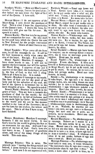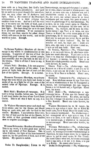 14 TE MANUHIRI TUARANGI AND MAORI INTELLIGENCER. been with us a long lime, but God's laws have never yet been attended to. And now let us seek out a good thought for ourselves. that we may come out of darkness into light. This is the reason of the Pakehas's advancement. It is their religion that enables them to see. And so it will be with us if we carry out the laws of God, and of the Queen, we shall emerge from darkness into light. The best thing for us to do now is to promote goodness. If we succeed in these, we can then search for other things which will save us in this world, and in the world to come. Enough. Te Ratana Ngahina: Hearken all the ru- nanga to my words in condemnation of this runanga. 1 approve of the law of God for promoting good among the united people, and secondly that we put faith in the law of the Queen. This is all that 1 have to say, it is ended. Nikera Naki: Hearken, I do not approve of one, and disapprove of the other, I ap- prove of both, both the law of God and the law of the Queen. Enough. It is ended. Hamuera Taumaru: Hearken, we acknow- ledge the laws which you have laid down in midst of us, as a light for all the men of the united tribe of Ngatiapa. Enough. It is ended. Mohi Mahi: Hearken all runangas. It is well to bring benefits before me, for myself I will bend under the love of our Lord Jesus Christ. this is all that I have to say, it is ended. Te Waitere Marumaru arose and stuck up three slicks; one for the Queen and Maori King on each side, and one for God in the centre. Hearken. I am between these two, the law of God and the law of the Queen, in the midst of that goodness which enables men to acquire knowledge. Wiremu Mokomoko: Hearken all runangas. This is my word, it is that good may spring up in this island of New Zealand. This is what I follow, the light of the laws bestowed upon us, by the goodness of God, and of the Queen. My speech is ended. Ihaka Te Rangihouhia listen to my kuwaretanga, me nga pohehetanga i a tatou; no te mea, ehara inaianei te whakapono i [ae mai ai, no mua noa atu, a kaore ano nei i whakaritea noatia a te Atua ana Ture. Na, ko tenei, me tahuri tatou ki te kimi whakaaro pai ma tatou, kia puia ai tatou i roto i te pouritanga ki te maramatanga. No te mea, ko te take tenei i puta te Pakeha; na to ratou whakapono ka kite tera iwi te Pakeha. Na, waihoki, me he mea ka wha- karite tatou i nga Ture a te Atua, me nga Ture o te Kuini, ko reira tatou puta ai i te pouritanga, ki te maramatanga. Ko tenei, heoi ano te mea pai mo tatou, ko te pai kiu whakaritea e tatou inaianei. Na, me he mea ka oti enei, ka rapu ano i etahi atu mea, ara, nga mea e ora ai tatou i tenei au, i tera ao atu ano hoki. Heoi ano. Te Ratana, Ngahina:—Na, whakarongo mai, e te runanga katoa, ki aku kupu wha- kahe RIO tenei runanga. E pai ana au ki te Ture o te Atua hei whakatupu i te pai ki te iwi kotahi; te tuarua, ko nga Ture o te Kuini kia whakaponohia e tatou. Heoti ano taku korero, ka mutu. Nikera Naki:—Na, whakarongo mai. Kahore au e kino ki tetahi: e pai ana au: ki tetahi, e pai ana au ki tetahi : ki te Ture o te Atua, ki te Ture o te Kuini. Heoti ano, ka mutu. Hamuera Taumaru —Na, whakarongo mai. Kua whakaae matou ki nga Ture kua oti na te whakatakoto e koe ki waenganui o matou, hei maramatanga mo nga tangata katoa o te iwi kotahi nei, o Ngatiapa. Heoti ano, ka mutu. Mohi Mahi:—Na, whakarongo e nga runanga katoa. E tika ana kia homai nga painga ki toku aroaro. Ko ahau, me tuohu noa iho i runga i te atawhai o to tatou Ariki o Ihu Karaiti. Heoti ano taku korero, ka mutu. Waitere Marumaru ka tu ki runga, ka poua e ia nga rakau e toru : ko te Kuini ki tetahi taha, ko te Kingi Maori ki tetahi taha, ku te Atua ki waenganui. Na, whakarongo; kei waenganui au o nga mea e rua, o te ture o te Atua, o te ture o Kuini: o "te pai, o te matauranga, e whiwhi ai te tangata ki te matauranga. Heoti ano taku korero, ka mutu. Wiremu Mokomoko:—Na, whakarongo mai, e nga runanga katoa. Ko taku kupu tenei; ki waenganui o tenei whakaminenga o Ngatiapa, ko taku kupu tenei, ko te tupunga ake o te pai ki tenei motu, ki Mu Tirani. Ko tenei taku e whai nei, ko te maramatanga mai o nga ture, o te pai o te Atua, o te pai o te Kuini. Ka mutu taku korero. Ihaka Te Rangihouhia :—Na, whakarongo
