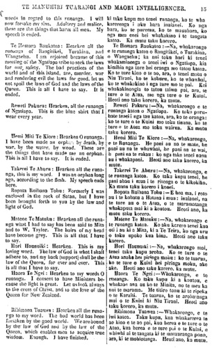 TE MANUHIRI TUARANGI AND MAORI INTELLIGENCER. 13 words in regard to this runanga. I will now forsake my sions. Adultery and malice, these are the things that harm all men. My speech is ended. Te Hemara Raukatoa; Hearken all the runanga of Rangitaikei, Turakina, and Wangaehu. I am rejoiced because of this meeting of the Ngatiapa tribe to seek the laws for our safety. The bad practices of the world and of this island, are murder, war and rendering evil the laws for good. Let us not spoil the laws of God and the laws of the Queen. This is all I have to say. It is ended. Reweti Pakuru; Hearken all the runanga of Ngatiapa. This is the blue shirt I wear every year. Hemi Miti Te Kiore: Hearken O runanga. I have been made an orphan: by death, by war, by the water, by wood. These are the things that have made me an orphan. This is all I have to say. It is ended. Takarei Te Ahuru : Hearken all the runa- nga, this is my word. I was an orphan long ago, according to the flesh. My speech ends here. Ropata Ruihana Tohu : formerly I was enclosed in the rock of Satan, but I have been brought forth to you by the law and light of God. Matene Te Matuku: Hearken aII the runa- nga what I had to say has been said to Mita and to W. Taylor. The hairs of my head have become grey. This is all that I have to say. Hori Haunuiki: Hearken. This is my loving word. The law of God is what I shall adhere to, and my back (support) shall be the law of the Queen, for ever and ever. This is all that I have to say. Haora Te Ngei: Hearken to my words O runanga. I consent to have Ministers be- cause the light is great. Let us look always to the cross of Christ, and to the love of the Queen for New Zealand. Rihimona Tuawea : Hearken all the runa- nga to my word. The bad world has been forsaken by the good world. We are bound by the law of God and by the law of the Queen, which enables men to acquire true wisdom. Enough. I have finished. ki taku kupu mo tenei runanga, ko te wha karerenga i aku hara inaianei. Ko nga hara, ko te puremu, ko te mauahara, ko nga mea enei hei whakakino i te tangata katoa. Ka mutu taku korero. Te Hemara Raukatoa :—Na, whakarongo e te runanga katoa o Rangitikei, o Turakina, o Wangaehu; ka nui toku hari ki tenei whakaminenga o tenei iwi o Ngatiapa, kia kimihia nga ture hei oranga mo tatou katoa. Ko te tu re kino o te ao, ara, o tenei motu o Niu Tirani, ko te kohuru, ko te whawhai, ko te whakakino i nga ture mo te pai. Kei whakakinongia to tatou taima pai, ara, te ture o te Atua, me nga ture o te Kuini. Heoti ano taku korero, ka mutu. Reweti Pakuru:—Na, whakarongo e to runanga katoa o Ngatiapa. Ko toku puru- hate tenei i nga tau katoa, ara, ko te oranga: ko te ture o te Kuini mo toku tinana, ko te ture o te Atua mo toku wairua. Ka mutu taku korero. Hemi Miti Te Kiore :—Na, whakarongo, e te Runanga. He pani au na te mate, he pani au na te whawhai, he patu na te vvai, he pani na te rakau: ko nga take tenei nana au i whakapani. Heoti ano taku korero, ka mutu. Takerei Te Ahuru:—Na, whakarongo, e te runanga katoa. Ko taku kupu tenei, he pani ahau i mua i te ritenga o te kikokiko. Ka mutu taku korero i konei. Ropata Ruihana Tohu :—E hoa ma, i roto au i te kohatu a Hatana i mua: inaianei, na te ture au o te Otiia, o te maramatanga whakaputa mai ki a koutou. Heoti ano, ka mutu taku korero. Matene Te Matuku:—Na. whakarongo e te runanga katoa. Ko aku korero tenei kua oti i au ki a Mita, ki a Te Teira, ko nga uru o toku upoko kua hina. Heoti ano taku korero. Hori Haunuiki :—Na, whakarongo mai, tenei taku kupu aroha. Ko te ture o te Atua anake hei piringa moku: ko te tuarua, ko te ture o Kuini hei piringa moku, ake ake. Heoti ano taku korero, ka mutu. Haora Te Ngei:—Whakarongo, e te runanga. Ko taku kupu ki a koutou, e whakaae ana au ko te Minita, no te mea ka nui te marama. Me titiro tonu ki te ripeka o te Karaiti. Te tuarua, ko te arohatanga mai o te Kuini ki Niu Tirani. Heoti ano taku korero, ka mutu. Rihimona Tuawea :—Whakarongo, e te iwi katoa. Taku kupu, kua whakarerea te ao kino e te ao pai, kua herea e te ture o te Atua, kua herea e te ture pai o te Kuini, e whiwhi ai te tangata ki te matauranga pono, ara, ki te mohiotanga. Heoti ano, ka mutu.