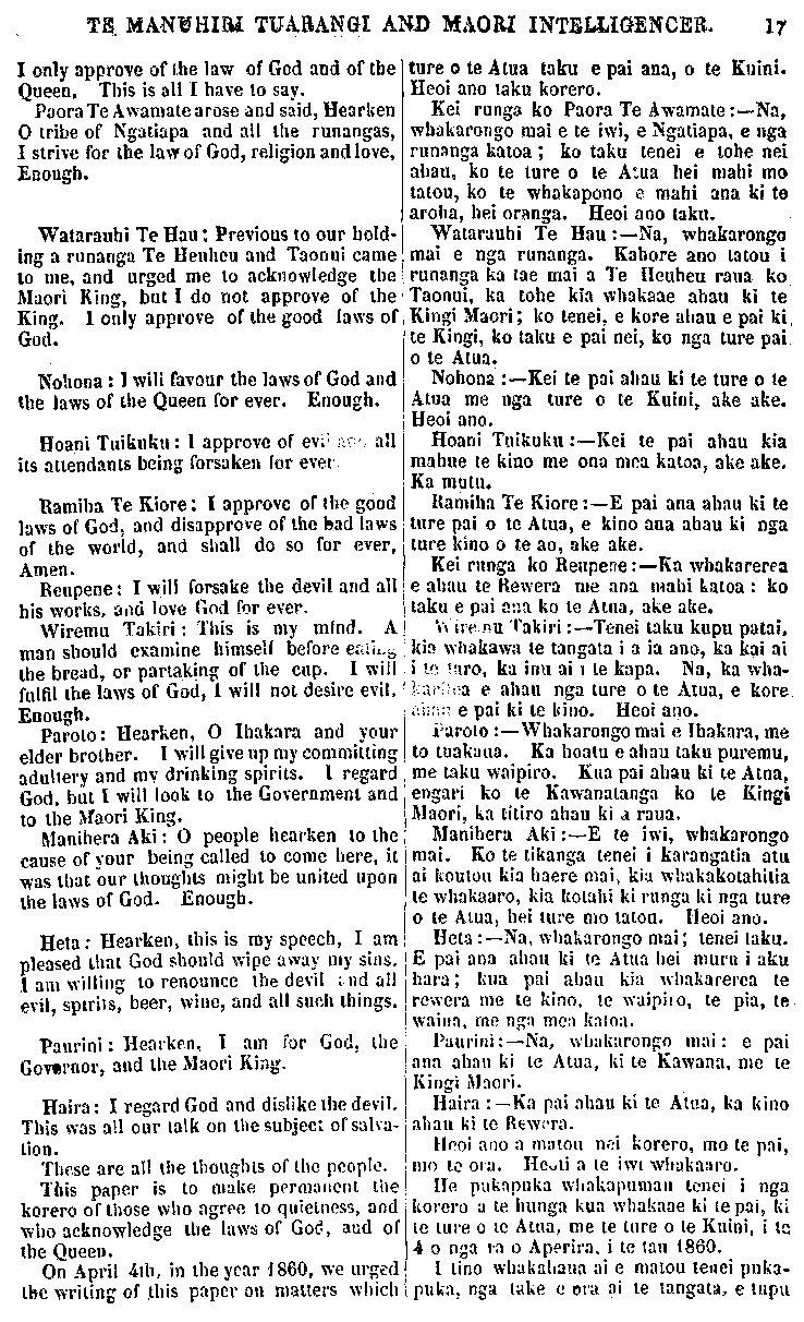 TE. MANUHIRI TUARANGI AND MAORI INTELLIGENCER. 17 I only approve of the law of God and of the Queen, This is all I have to say. Paora Te Awamate arose and said, Hearken O tribe of Ngatiapa and all the runangas, I strive for the law of God, religion and love, Enough. Watarauhi Te Hau Previous to our hold- ing a runanga Te Heuheu and Taonui came to me, and urged me to acknowledge the Maori King, but I do not approve of the King. 1 only approve of the good laws of God. Nohona: 1 will favour the laws of God and the laws of the Queen for ever. Enough. Hoani Tuikuku: 1 approve of its attendants being forsaken (or ever Ramiha Te Kiore: I approve of the good laws of God and disapprove of the bad laws of the world, and shall do so for ever, Amen. Reupene: I will forsake the devil and all his works, and love God for ever. Wiremu Taki ri : This is my mind. A man should examine himself before eating the bread, or partaking of the cup. I will fulfil the laws of God, 1 will not desire evil. Enough. Paroto: Hearken, O Ihakara and your elder brother. I will give up my committing adultery and my drinking spirits. I regard God. but I will look to the Government and to the Maori King. Manihera Aki: O people hearken to the cause of your being called to come here, it was that our thoughts might be united upon the laws of God. Enough. Heta: Hearken, this is my speech, I am pleased that God should wipe away my sins. I am willing to renounce the devil and all evil, spirits, beer, wine, and all such things. Paurini: Hearken, I am for God, the Governor, and the Maori King. Haira: I regard God and dislike the devil. This was all our talk on the subject of salva- tion. These are all the thoughts of the people. This paper is to make permanent the korero of those who agree to quietness, and who acknowledge the laws of God, and of the Queen. On April 4th, in the year I860, we urged the writing of this paper on matters which ture o te Atua taku e pai ana, o te Kuini. Heoi ano taku korero. Kei runga ko Paora Te Awamate:—Na, whakarongo mai e te iwi, e Ngatiapa, e nga runanga katoa; ko taku tenei e tohe nei ahau, ko te ture o te Atua hei mahi mo tatou, ko te whakapono e mahi ana ki te aroha, hei oranga. Heoi ano taku. Watarauhi Te Hau:—Na, whakarango mai e nga runanga. Kahore ano tatou i runanga ka tae mai a Te Heuheu raua ko Taonui, ka tohe kia whakaae ahau ki te Kingi Maori; ko tenei, e kore ahau e pai ki, te Kingi, ko taku e pai nei, ko nga ture pai o te Atua. Nohona :—Kei te pai ahau ki te ture o te Atua me nga ture o te Kuini, ake ake. Heoi ano. Hoani Tuikuku :—Kei te pai ahau kia mahue te kino me ona mea katoa, ake ake. Ka mutu. Ramiha Te Kiore:—E pai ana ahau ki te ture pai o te Atua, e kino ana ahau ki nga ture kino o te ao, ake ake. Kei runga ko Reupene:—Ka whakarerea e ahau te Rewera me ana mahi katoa : ko taku e pai ana ko te Atua, ake ake. Wiremu Takiri:—Tenei taku kupu pata?, kia whakawa te tangata i a ia ano, ka kai ai i te taro, ka inu ai i te kapa. Na, ka wha karitea e ahau nga ture o te Atua, e kore e pai ki te kino. Heoi ano. Paroto:—Whakarongo mai e Ihakara, me to tuakana. Ka hoatu e ahau taku puremu, me taku waipiro. Kua pai ahau ki te Atua, engari ko te Kawanatanga ko te Kingi Maori, ka titiro ahau ki a raua. Manihera Aki:—E te iwi, whakarongo mai. Ko te tikanga tenei i karangatia atu ai koutou kia haere mai, kia whakakotahitia te whakaaro, kia kotahi ki runga ki nga ture o te Atua, hei ture mo tatou. Heoi ano. Heta :—Na, whakarongo mai; tenei taku. E pai ana ahau ki te Atua hei muru i aku hara; kua pai ahau kia whakarerea te rewera me te kino, te waipiro, te pia, te waina, me nga mea katoa. Paurini—Na, whakarongo mai: e pai ana ahau ki te Otiia, ki te Kawana, me te Kingi Maori. Haira :—Ka pai ahau ki te Atua, ka kino ahau ki te Rewera. Heoi ano a matou nei korero, mo te pai, mo te ora. Heoti a te iwi whakaaro. He pukapuka whakapumau tenei i nga korero a te hunga kua whakaae ki te pai, ki te ture o te Atua, me te ture o te Kuini, i te 4 o nga ra o Aperira, i te tau 1860. I tino whakahaua ai e matou tenei puka- puka, nga lake e ora ai te tangata, e tupu