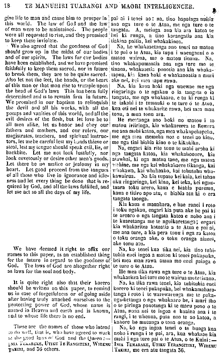 I8 TE MANUHIRI TUARANGI AND MAORI INTELLIGENCER. give life to man and cause him to prosper in this world. The law of God and the law of man were to be maintained. The people were all requested to rise, and they promised to keep these inviolate. We also agreed that the goodness of God should grow up in the midst of our bodies and of our spirits. The laws for our bodies have been established, and we have promised faithfully to keep them sacred, nor in future to break them, they are to be quite sacred. Also let not the feet, the hands, or the heart of this man or that man rise to trample upon the head of God's laws This has been fully determined and is to remain firm in future. We promised in our baptism to relinquish the devil and all his works, with all the pomps and vanities of this world, and all the evil desires of the flesh, but let love be to all men alike, let us honor and obey our fathers and mothersn and our rulers, our magistrates,, teachers, and spiritual instruc- tors, let me be careful lest my hands thieve or steal, lest my tongue should speak evil, lie, or backbite. Let me not look lustfully, nor look covetously or desire other men's goods. Let there be no malice or jealousy in my heart. Let good proceed from the tongues of all those who live in ignorance and idle- ness and let every thing be done that is re- quired by God, and all the laws fulfilled, and let me act so all the days of my life. We have deemed it right to affix our names to this paper, as an established thing for the future in regard to the goodness of God. The laws of God are altogether right as laws for the soul and body. It is quite right also that their korero should be written on this paper, to remind us in case of forgetfulness or of going aside after having truely attached ourselves to the protecting power of God, whose name is named in Heaven and earth and is known, and to whose lire there is no end. These are the names or those who intend to do well, that is, who have agreed to work at the good laws of God and the Queen; INIA TEMAREKE, UTIKU TE RANGITEKI, WIREMU TAKIRI, and 36 others. pai-ai i tenei ao: na, tino hapainga nuitia ana nga ture o te Atua, me nga ture o te tangata. A, meinga ana kia ara katoa te iwi ki runga, a tino karangatia ana kia tiakina paitia, kei whakakinoa. Na, he whakaaetanga ano tenei na matou i te pai o te Atua, kia tupu i waenganui o o matou wairua, me o matou tinana. Na, tino whakapumautia ana nga ture mo te tinana, whakaaetia ponoiia ana kia whaka- tapua, kia kaua hoki e whakanoatia a muri ake nei, hoi mea tapu rawa. Na, kia kaua hoki nga waewae me nga ringaringa o te ngakau o ia tangata o ia tangata, me nga whakaaro, e tu ki runga ki te takahi i te tumuaki o te ture 6 te Atua, kua oti nei te whakarite rawa, hei mea mau tonu, a mua tonu atu. He meatanga ano hoki no matou i to matou iriiringa, kia whakarerea te Rewera me ana mahi katoa, nga mea whakapehapeha, me nga mea memeha noa o tenei ao kino, me nga tini hiahia kino o te kikokiko. Na, engari kia rite tonu te mahi aroha ki nga tangata katoa, kia whakahonore, kia atawhai, ki nga matua tane, me nga matua wahine, me nga kai whakahaere tikanga, kai whakawa, kai whakaako, kai tohutohu wha- kawairua. Na kia tupato kei kaia, kei tahae oku ringaringa, kei kino, kei teka, kei ngau- tuara toku arero, kaua e hiahia puremu, kaua e titiro apo atu, e hiahia atu Id o era tangata taonga. Kia kaua e mauahara, e hae ranei i roto i toku ngakau, engari kia puta ake he pai ki te aroaro o nga tangata katoa e noho ana i te kuaretanga me te ngoikoretanga; engari kia whakaritea katoatia a te Atua e pai ai, me ana ture, a kia pera tonu i nga ra katoa o toku oranga ake, o toku oranga aianei, ake tonu atu. Na, ko tenei kua tika nei, kia tino tuhi- tuhia enei ingoa a matou ki tenei pukapuka, hei mea mau rawa amua mo enei painga o te ture o te Atua. He mea tika rawa nga ture o te Atua. kia whakaritea hei ture mo te wairua mo te tinana. Na, ka tika rawa tenei, kia tuhituhia enei korero ki tenei pukapuka, hei whakamahara- tanga i roto i te warewarenga me te poka- nga-ketanga o nga whakaaro he, i muri iho o te piringa ponotanga ki te maru pono o te Atua, nona nei te ingoa e huaina ana i te rangi, i te whenua, puta noa te ao katoa, a ka hore he mutunga o tona oranga. Na, ko nga ingoa tenei o te hunga kua noho i runga i te pai, ara, kua whakaae kia mahi i nga ture pai o te Atua, o te Kuini:— I INIA TEMARAKE, UTIKU TERANGITIKI, WIREMU i TAKIRI, me era atu tangata 56.
