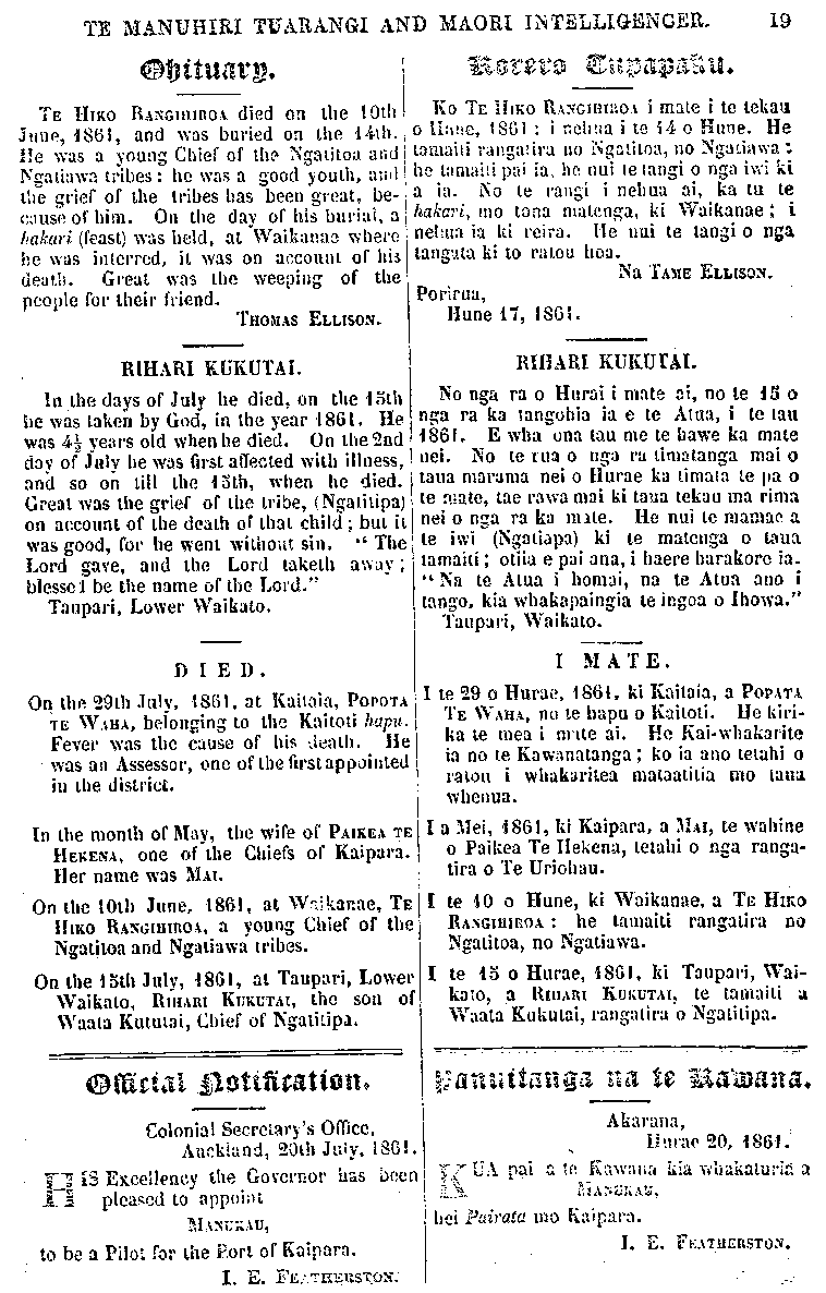 TE MANUHIRI TUARANGI AND MAORI INTELLIGENCER. 19 Obituary TE HIKO RANGIHIROA died on the 10th June, 1861, and was buried on the 14th. He was a young Chief of the Ngatitoa and Ngatiawa tribes : he was a good youth, and the grief of the tribes has been groat, be- cause of him. On the day of his burial, a hakari (feast) was held, at Waikanae whero he was interred it was on account of his death. Great was the weeping of the people for their friend, THOMAS ELLISON. RIHARI KUKUTAI. In the days of July he died, on the 15th he was taken by God, in the year 1861. He was 4 years old when he died. On the 2nd day of July he was first affected with illness, and so on till the 13th, when he died. Great was the grief of the tribe, (Ngatitipa) on account of the death of that child but it was good, for he went without sin. ' The Lord gave, and the Lord taketh away blessed be the name of the Lord." Taupari, Lower Waikato. DIED. On the 29th July, 1861, at Kaitaia, POPOTA TE WAHA, belonging Io the Kaitoti hapu. Fever was the cause of bis death. He was an Assessor, one of the first appointed in the district. In the month of May, the wife of PAIKEA TE HEKENA, one of the Chiefs of Kaipara. Her name was MAI. On the lOth June, 1861, at Waikanae, TE HIKO RANGIHIROA, a young Chief of the Ngatitoa and Ngatiawa tribes. On the I5th July, 1861, at Taupari, Lower Waikato, RIHARI KUKUTAI, the son of Waata Kututai, Chief of Ngatitipa. OFFICIAL NOTIFICATION Colonial Secretary's Office, HIS Excellency the Governor has been pleased to appoint MANUKAU, to be a Pilot for the Port of Kaipara. I. E. FEATHERSTON. KORERO TUPAPAKU Ko TE HIKO RANGIHIROA i mate i te tekau, o Hune, 1861 : i nehua i te 14 o Hune. He tamaiti rangatira no Ngatitoa, no Ngatiawa : he tamaiti pai ia, he nui te tangi o nga iwi ki a ia. No te rangi i nehua ai, ka tu te hakari, mo tona matenga, ki Waikanae ; i nehua ia ki reira. He nui te tangi o nga tangata ki to ra tou hoa. Na TAME ELISION. Porirua, Hune 17, 1861. RIHARI KUKUTAI. No nga ra o Hurai i mate ai, no te 15 o nga ra ka tangohia ia e te Atua, i te tau 1861. E wha una tau me te hawe ka mate nei. No te rua o nga ra timatanga mai o taua marama nei o Hurae ka timata te pa o te mate, tae rawa mai ki taua tekau ma rima nei o nga ra ka mate. He nui te mamae a te iwi (Ngatiapa) ki te matenga o taua tamaiti; otiia e pai ana, i haere harakore ia. " Na te Atua i homai, na te Atua ano i tango, kia whakapangia te ingoa o Ihowa." Taupari, Waikato. I MATE. I te 29 o Hurae, 1861. ki Kaitaia, a POPATA TE WAHA, no te hapu o Kaitoti. Ue kiri- ka te mea i mate ai. He Kai-whakarite ia no te Kawanatanga; ko ia ano tetahi o ratou i whakaritea mataatitia mo taua whenua. I a Mei, 1861, ki Kaipara, a MAI, te wahine o Paikea Te Hekena, tetahi o nga ranga- tira o Te Uriohau. te 10 o Hune, ki Waikanae, a TE HIKO RANGIHIROA : he tamaiti rangatira no Ngatitoa, no Ngatiawa. I te 15 o Hurae, 1861, ki Taupari, Wai- kato, a RIHARI KUKUTAI, te tamaiti u Waata Kukutai, rangatira o Ngatitipa. PANUITANGA NA TE KAWANA Akarana, Hurae 20, 1861. Kua pai a te Kawana kia whakaturia a Manukau, hei Pairata mo Kaipara. I.E.FEATHERSTON.