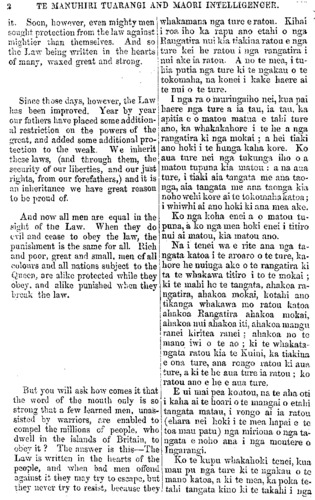 2 TE MANUHIRI TUARANGI AND MAORI INTELLIGENCER. it. Soon, however, even mighty men sought protection from the law against mightier than themselves. And so the Law being written in the hearts of many, waxed great and strong. Since those clays, however, the Law has been improved. Year by year! our fathers have placed some addition- al restriction on the powers of the great, and added some additional pro- tection to the weak. We inherit these laws, (and through them, the security of our liberties, and our just lights, from our forefathers») and it is an inheritance we have great reason to be proud of. And now all men are equal in the sight of the Law. When they do evil and cease to obey the law, the punishment is the same for all. Rich and poor, great and small, men of all colours and all nations subject to the Queen, are alike protected while they obey, and alike punished when they break the law. But you will ask how comes it that the word of the mouth only is so strong that a few learned men, unas- sisted by warriors, are enabled to compel the millions of people, who dwell in the islands of Britain, to obey it? The answer is this—The Law is written in the hearts of the people, and when bad men offend against it they may try to escape, but they never try to resist, because they whakamana nga ture e ratou. Kihai i roa iho ka rapu ano etahi o nga Rangatira nui kia tiakina ratou e nga ture kei he ratou i nga rangatira i nui ake ia ratou. A no te mea, i tu- hia putia nga ture ki te ngakau o te tokomaha, ua konei i kake haere ai te nui o te ture. I nga ra o muringaiho nei, kua pai haere nga ture a ia tau, ia tau, ka apitia e o matou matua e tahi ture ano, ka whakakahore i te he a nga rangatira ki nga mokai , a hei tiaki ano hold i te hunga kaha kore. Ko aua ture nei nga tukunga iho o a matou tupuna kia matou : a na aua ture, i tiaki aia tangata me ana tao nga, aia tangata me ana taonga kia noho wehi kore ai te tokomaha katoa; i whiwhi ai ano hoki ki ana mea ake. Ko nga koha enei a o matou tu- puna, a ko nga mea hoki enei i titiro nui ai matou, kia matou ano. Na i tenei wa e rite ana nga ta- ngata katoa i te aroaro o te tu re, ka- hore he nuinga ake o te rangatira ki ta te whakawa titiro i to te mokai ; ki te mahi he te tangata, ahakoa ra- ngatira, ahakoa mokai, kotahi ano tikanga whakawa mo ratou katoa ahakoa Rangatira ahakoa mokai, ahakoa nui ahakoa iti, ahakoa mangu ranei kiritea ranei : ahakoa no te mano iwi o te ao ; ki te whakata ngata ratou. kia te Kuini, ka tiakina I e ona ture, ana rongo ratou Id aua i ture, a ki te he aua ture ia ratou ; ko ratou ano e he e aua toe. E ui mai pea koutou, na te aha oti i kaha ai te hoari o te mangai o etahi tangata matau, i rongo ai ia ratou (ehara nei hoki i te mea hapai e te toa mau patu) nga miriona o nga ta- ngata noho ana i nga moutere o Ingarangi. Ko te kupu whakahoki tenei, kua mau pu nga ture ki te ngakau o to mano katoa, a ki te mea, ka poka te- tahi tangata kino ki te takahi i nga