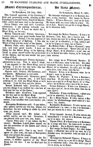 30 TE MANUHIRI TUARANGI AND MAORI INTELLIGENCER. Maori CORRESPONDENCE Te Kawakawa, 9th July, -1861. This Council approves of the Governor's kind and protecting words, alluding to His Excellency's circular letter, dated 5th March, 4861, which had been read to the meeting. Paora Pakaia rose and said: Governor, salutations. I am sighing towards you. How do you do? 1 have no desire for a Maori King, or for war, Hohua Tumuru said: Friend, Governor, 1 salute you and your good words )letter 5th March, 1861). Friend, I do not approve of the Maori King or of fighting. I like the Word of God and the word of the Queen. Hohera Puha said: Governor, 1 salute you, and your good words. I have no liking for the Maori King, or for fighting. I wish to place myself under the protection of the Queen, and my soul under the pro-tection of God. Wikiriwhi Matene said: Friend, Governor, salutations to you. This is what I think. I am opposed to the Maori King, and to fighting. I am for the two laws-the law of God and the law of the Queen. Rutene said: Friend, the Governor, and 1 the Queen. Salutations to you both. Hunia te Wairere said : Governor, great is my regard towards you. 1 will have nothing to do with the Maori King or with the war. I am for God and the Queen. Renata Kakawai said: Governor, there are two things I am wishful for—the law of God and the law of the Queen, Pehikura said: Governor, I am opposed to the war and to the Maori King. Hoani Kopu said: O my father, the Go- vernor, I am satisfied with your words; yes, Amen. Karapaina Houkamau said: O my father, who quietly carries out the law, friend, the Governor, we are willing to abide by your laws, yes, Amen. Piripi A panui said: My father, who mildly carries out the law. Governor, I am pleased with your law, yes, Amen. Tipene Pihoi said: 0 my father, the Go- vernor. Hearken, 1 shall place myself un- der the protection of the Queen and Christ my Saviour. Ihaia Ingoa said : This is my word. I agree to your laws, the laws of Europeans, laws that protect the people. Raharuhi Tapore said: Friend, the Go- vernor, I neither approve of the Maori King nor the war. 1 am for God and the Queen. HE RETA MAORI Te Kawakawa, Hurai 9, 1861. He runanga whakapai ki a te Kawana ko- rero, aroha, atawhai. Kei runga ko Paora Pakaia : E hoa e Kawana ; tena ra ko koe. He kupu mihi atu tenei naku ki a koe. Te- na ra koe. Kaore aku pai ki te kingi Maori, ki te whawhai hoki. Kei runga ko Hohua Tumuru : E hoa e te Kawana; tena koe, me o korero pai. E hoa. kaore au e pai ki te Kingi Maori, kaore au e pai ki te whawhai; e hoa, taku e pai ai ko te kupu a te Atua, ko te Kuini. Ko Hohea Puha: E hoa e Kawana'; tera koe, me o korero pai. Kaore aku pai ki te Kingi Maori, ki te whawhai; e pai ana au ki a ie Kuini mo taku tinana, ki te Atua Mo taku wairua. Kei runga ko te Wikiriwhi Matehe; E hoa e te Kawana; tena ra ko koe. Ko taku whakaaro tenei; kaore au e pai ki te Kingi Maori, ki te whawhai; ko taku pai, ko nga ture erua, ture Atua, ture Kuini. Rutene: E hoa e te Kawana raua ko te Kuini; tena ra ko korua. Hunia Te Wairere: E hoa e Kawana; tena koe. E rahi taku aroha atu ki a koe; kaore au e pai ki te Kingi Maori, ki te wha- whai ; ko te Kuini taku i pai ai ko te Atua. Renata Kakawai : E hoa e te Kawana; e rua oku e pai ai; ko te ture Atua raua ko te ture Kuini. Pehikuru; E hoa e te Kawana; e kino ana au ki te whawhai, ki te Kingi Maori. Ko o Hoani Kopu: E toku matua e Ka- wana ; he whakaaetanga tenei naku ki o ko- rero; Ae, Amine. Karapaina Houkamau: E taku matua ata whakahaere i te ture; e hoa e te Kawana ; kua pai matou ki o ture: Ae, Amine. Piripi Apanui; ka mea, E toku matua ate whakahaere i te ture ki a Kawana, kua pai au ki te ture: Ae, Amine. Tipene Pihoi: E te kaumatua e te Kawana; ki a rongo mai koe: ka tomo au ki (e maru o te Kuini. Ko te Karaiti toku oranga. Kei runga ko Ihaia Ingoa: Ko taku kupu tenei, e whakaae ana au ki au ture, ki o te Pakeha ture, he atawhai hoki au ture ki te tangata. Ki runga ko Raharuhi Tapore: E hoa e te Kawana; ekore au e pai ki te Kingi Maori ki te whawhai hoki; erua aku mea e pai ai ko te Atua, ko te Kuini.