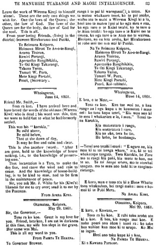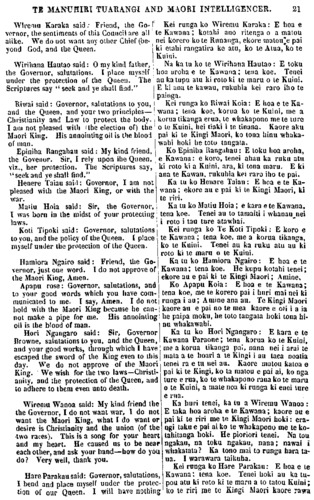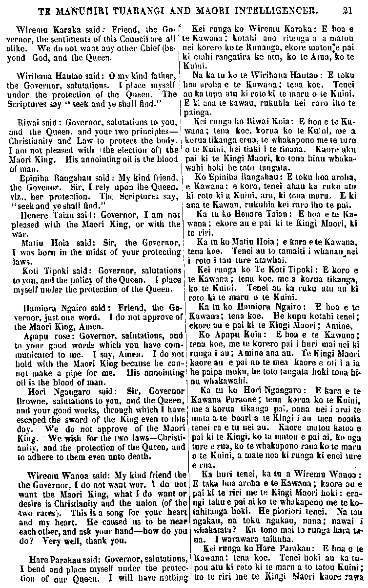 TE MANUHIRI TUARANGI AND MAORI INTELLIGENCER. 21 Wlremu Karaka said : Friend, the Go vernor, the sentiments of this Council are all alike. We do not want any other Chief (be yond God, and the Queen. Wirihana Hautao said: 0 my kind father, the Governor, salutations. I place myself under the protection of the Queen. The Scriptures say " seek and ye shall find." Riwai said: Governor, salutations to you, and the Queen, and your two principles— Christianity and Law to protect the body. I am not pleased with (the election of) the Maori King. His anointing oil is the blood of man. Epiniha Rangahau said: My kind friend, the Governor. Sir, I rely upon the Queen, viz. her protection. The Scriptures say, "seek and ye shall find." Henare Taiau said: Governor, I am not pleased with the Maori King, or with the war. Matiu Hoia said: Sir, the Governor, I was born in the midst of your protecting laws. Koti Tipoki said: Governor, salutations to you, and the policy of the Queen. I place myself under the protection of the Queen. Hamiora Ngairo said : Friend, the Go- vernor, just one word. I do not approve of the Maori King, Amen. Apapu rose: Governor, salutations, and to your good words which you have com- municated to me. I say, Amen. I do not hold with the Maori King because he can- not make a pipe for me. His anointing oil is the blood of man. Hori Ngangaro said: Sir, Governor Browne, salutations to you. and the Queen, and your good works, through which 1 have escaped the sword of the King even to this day. We do not approve of the Maori King. We wish for the two laws—Christ ianity, and the protection of the Queen, and to adhere to them even unto death. Wiremu Wanoa said: My kind friend the the Governor, I do not want war, I do not want the Maori King, what I do want or desire is Christianity and the union (of the •two races). This is a song for your heart and my heart. He caused us to be near each other, and ask your hand—how do you do? Very well, thank you. Hare Parakau said: Governor, salutations, I bend and place myself under the protec- tion of our Queen. I will have nothing Kei runga ko Wiremu Karaka: E hoa e te Kawana ; kotahi ano ritenga o a matou nei korero ko te Runanga, ekore matou e pai ki etahi rangatira ke atu, ko te Atua, ko te Kuini. Na ka tu ko te Wirihana Hautao : E toku hoa aroha e te Kawana; tena koe. Tenei au ka tupu atu ki roto ki te maru o te Kuini. E ki ana te kawau, rukuhia kei raro iho te painga. Kei runga ko Riwai Koia: E hoa e te Ka- wana; tena koe, korua ko te Kuini, me a korua tikanga erua, te whakapono me te ture o te Kuini, hei tiaki i te tinana. Kaore aku pai ki te Kingi Maori, ko tona hinu whaka- wahi hoki he toto tangata. Ko Epiniha Rangahau: E toku hoa aroha, e Kawana: e koro, tenei ahau ka ruku atu ki roto ki a Kuini, ara, ki tona maru. E ki ana te Kawau, rukuhia kei raro iho te pai. Ka tu ko Henare Taiau: E hoa e te Ka- wana ; ekore au e pai ki te Kingi Maori, ki te ri ri. Ka tu ko Matiu Hoia; e kara e te Kawana. tena koe. Tenei au to tamaiti i whanau nei i roto i tau ture atawhai. Kei runga ko Te Koti Tipoki: E koro e te Kawana; tena koe, me a korua tikanga, ko te Kuini. Tenei au ka ruku atu au ki roto ki te maru o te Kuini. Ka tu ko Hamiora Ngairo: E hoa e te Kawana; tena koe. He kupu kotahi tenei; ekore au e pai ki te Kingi Maori; Amine, Ko Apapu Koia: E hoa e te Kawana; tena koe, me te korero pai i huri mai nei ki runga i au; Amine ana au. Te Kingi Maori kaore au e pai no te mea kaore e oti i i a ia he paipa moku, he toto tangata hoki tona hi- nu whakawahi. Ka tu ko Hori Ngangaro: E kara e te Kawana Paraone; tena korua ko te Kuini, me a korua tikanga pa;, nana nei i arai te mata a te hoari a te Kingi i au taea noatia tenei ra e tu nei au. Kaore matou katoa e pai ki te Kingi, ko ta matou e pai ai, ko nga ture e rua, ko te whakapono raua ko te maru o te Kuini, a mate noa ki runga ki enei ture e rua. Ka huri tenei, ka tu a Wiremu Wanoa : E taka hoa aroha e te Kawana; kaore au e pai ki te riri me te Kingi Maori hoki: era- ngi taku e pai ai ko te whakapono me te ko- tahitanga hoki. He pioriori tenei. Na tou i ngakau, na toku ngakau, nana; nawai i whakatata ? Ka tono mai to runga hara taua. I warawara taikuha. Kei runga ko Hare Parakau: E hoa e te Kawana: tena koe. Tenei hoki au ka tu- pou atu ki roto ki te maru a to tatou Kuini; ko te riri me to Kingi Maori kaore rawa
