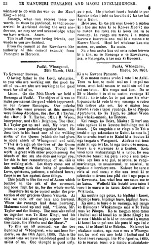 23 TE MANUHIRI TUARANGI AND MAORI INTELLIGENCER,. whatever to do with the war or the Maori King—a song. Enough, when you receive these our words, let them be published, so that on our arrival in Auckland during the. next con- ference, we may see and acknowledge what we have written. Amen. This is all from your loving friends, our words to you are finished. From the council at the Kawakawa the authority of this council extends, from Patangata to Horoeru. Putiki, Whanganui, 30th March, 1861. To Governor Browne, O loving father in the Lord, salutation, to you who are working out the good for all of us—we also are working at the good work for all of us. Listen. On the 30th March we held a Runanga at Putiki. The object of it was to make permanent the good which (appeared) in our former Runangas. Our pakeha friends who were present at this meeting were Bishop Abraham. the Rev. R.) Taylor, the (Rev.) B T. Taylor, (Mr.l R. Woon, Interpreter, and Mr. Deighton. The Rev, R.) Taylor got up and said, My heart re joices at your gathering together here. He then look in his hand one of the walking slicks of the Queen [which she had given to some chiefs of Whanganui and said, This is (a sign of) the love of the Queen to you, men of Whanganui. Though her work is great with other people among the islands of the sea she does not forget you, for this is her remembrance of us, this is her walking stick. Let there come out of this walking slick the fruits of goodness. Love, quietness, patience, a subdued heart; there is no law against these things. This (staff) is like the rod of Aaron which budded in the ark of the covenant, and hore fruit for us, for the whole world. Therefore let us be united under the pro- tection of our gracious Queen Victoria. At this we took off our hats and hurraed. When the runanga had done hurraing, Haimona stood up and said, "Listen, Mr. Taylor and the Bishop. The man who called us together was Te Mete Kingi, and his object was that good might appear for the two races, the Pakeha and the Maori." To this we all assented, we the two hundred of Whanganui, who met here for- merly, on the 10th April, 1860. This is the second time we have established good in the midst -of us. One thought is good only. au e pai. He pioriori tenei: kotahi te pu- kapuka naku i tuhi na koraihari; ka tae kai kei u Kuini. Heoi ano, ka tae atu enei korero a matou ki a koe me tuku ki te Karere Maori; mo to matou tae rawa atu ki kona ina tu te runanga, ka rongo atu matou i a matou korero e korerotia ana mai ki a matou e te Karere Maori. Heoi hei whakaae kau atu matou, ae, amine. Ka mutu. Na o hoa aroha kua oti nei a ratou korero ki a koe, na te Runanga o te Kawakawa, ara, o Patangata, a tae noa ki Horoera. Putiki, Whanganui, Maehe, 50, 1861, Ki a te Kawana Paraone. E to matou matua aroha i roto i te Ariki. Tena ra koe, te mahi mai na i te pai mo tatou, tenei hoki matou u te mahi atu nei i te pai mo tatou. Kia rongo mai koe. No te 50 o Maehe i tu ai to matou runanga ki Putiki: ko te lake, ko te pai ano kia wha- kapumautia ki roto ki era runanga o ratou kua mahue ake nei. Ko o matou hoa Pakeha i roto i tenei runanga, ko te Pihopa Aperahama, ko Te Teira, ko Rihari Woon (kai whaka-maori), ko Tiatene. Kei runga ko Teira, Minita: E hari ana taku ngakau ki to koutou huihuinga mai ki konei. [Ka tangohia e te ringa o Te Teira tetahi o nga tokotoko a te Kuini, ka mea ia,] Ko te aroha tenei o te Kuini ki a koutou ki nga tangata o Wanganui. Ahakoa nui tona mahi ki nga iwi ke, ki nga motu o te moana, kaore ia e wareware ki a koutou. Koia tenei tona mahanatanga ki a tatou, ko ona tokotoko tenei; kia puta i roto i enei toko- toko nga hua o te. pai, te aroha, te rangi- marietanga, te manawanui, te atawhai, te ngakau e herehere ana. Kahore he ture e riria ai enei mea; e rite ana tenei ki te tokotoko o Arona kua pihi ake i nga papa o te Kawenata, kua whai hua mo tatou mo te ao katoa. Waihoki kia kotahi tonu tatou i raro i te maru o to tatou Kuini atawhai o Wikitoria. Ka unuhia nga potae, ka hipihipi i konei, Hipihipi hure, hipihipi hure, hipihipi hure. Ka mutu te hure o te runanga, kei runga ko Haimona: Whakarongo mai e Te Teira raua Ito Pihopa. Ko te tangata nana tatou i huihui mai ki konei ko te Mete Kingi; ko te mea i hiahia ai ia ki te tono mai ia matou ki konei ko te pai ano kia puta ki nga iwi e rua, ki te Maori ki te Pakeha. Na konei ka whakaae matou, nga rau e rua o Whanga- nui, ko enei rau ano hoki i huihui mai ki konei i tera runanga, i te 10 o Aperira, 1860, ko to tuarua tenei, o a matou whakatakoto-