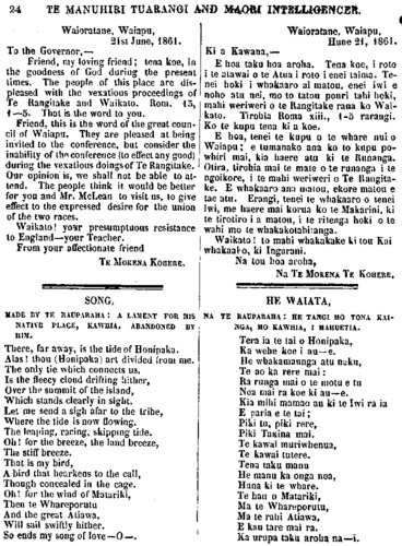24 TE MANUHIRI TUARANGI AND MAORI INTELLIGENCER Waioratane, Waiapu, 21st June, 1861. To the Governor,— Friend, my loving friend; tena koe, in the goodness of God during the present limes. The people of this place are dis- pleased with the vexatious proceedings of Te Rangitake and Waikato. Rom. 13, —5. That is the word to you. Friend, this is the word of the great coun- cil of Waiapu. They are pleased at being invited to the conference, but consider the inability of the conference (to effect any good) during the vexatious doings of Te Rangitake. Our opinion is, we shall not be able to at- tend. The people think it would be better for you and Mr. McLean to visit us, to give effect to the expressed desire for the union of the two races. Waikato! your presumptuous resistance to England—your Teacher. From your affectionate friend TE MOKENA KOHERE. SONG, MADE BY TE RAUPARAHA : A LAMENT FOR HIS NATIVE PLACE, KAWHIA, ABANDONED BY HIM. There, far away, is the tide of Honipaka Alas! thou Honipaka) art divided from me. The only lie which connects us, Is the fleecy cloud drifting hither, Over the summit of the island, Which stands clearly in sight. Let me send a sigh afar to the tribe, Where the tide is now flowing. The leaping, racing, skipping tide. Oh! for the breeze, the land breeze, The stiff breeze. That is my bird, A bird that hearkens to the call, Though concealed in the cage. Oh! for the wind of Matariki, Then te Whareporutu And the great Atiawa, Will sail swiftly hither. So ends my song of love—O—. Waioratane, Waiapu. Hune 21, 1861. Ki a Kawana,— E hoa taku hoa aroha. Tena koe, i roto i te atawai o te Atua i roto i enei taima. Te- nei hoki i whakaaro ai matou, enei iwi e noho atu nei, mo to tatou pouri tahi hoki, mahi weriweri o te Rangitake rana ko Wai- kato. Tirohia Roma xiii., 1-5 rarangi. Ko te kupu tena ki a koe. E hoa, tenei te kupu o te whare nui o Waiapu; e tumanako ana ko to kupu po whiri mai, kia haere atu ki te Runanga. Otira, tirohia mai te mate o te runanga i te ngoikore, i te mahi weriweri o Te Rangita- ke. E whakaaro ana matou, ekore matou e tae atu. Erangi, tenei te whakaaro o tenei iwi, me haere mai korua ko te Makarini, ki te tirotiro i a matou, i te ritenga hoki o te wahi mo te whakakotahitanga. Waikato! to mahi whakakake ki tou Kai whakaako, ki Ingarani. Na tou hoa aroha, Na TE MOKENA TE KOHERE. HE WAIATA, NA TE RAUPARAHA : HE TANGI MO TONA KAI- NGA, MO KAWHIA, I MAHUETIA. Tera ia te tai o Honipaka, Ka wehe koe i au—e. He whakamaunga atu naku, Te ao ka rere mai: Ra runga mai o te motu e tu Noa mai ra koe ki au—e. Kia mihi mamao au ki te Iwi ra ia E paria e te tai; Piki tu, piki rere, Piki Takina mai. Te kawai muriwhenua, Te kawai tutere. Tena taku manu He manu ka onga noa, Huna ki te whare. Te hau o Matariki, Ma te Whareporutu, Ma te rahi Atiawa, E kau tare mai ra. Ka urupa taku aroha na—i.