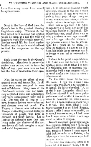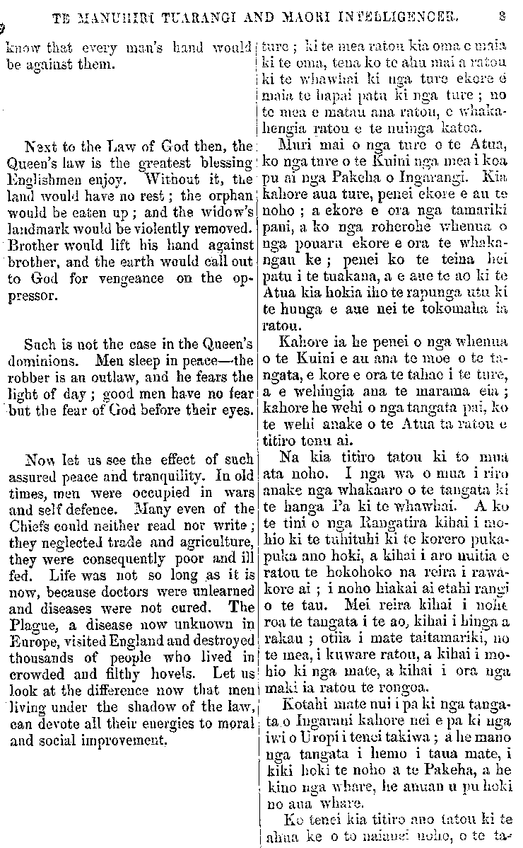 TE MANUHIRI TUARANGI AND MAORI INTELLIGENCER. know that every man's hand would be against them. Next to the Law of God then, the Queen's law is the greatest blessing- Englishmen enjoy. Without it, the land would have no rest; the orphan would be eaten up ; and the widow's landmark. would be violently removed. Brother would lift his hand against brother, and the earth would call out to God for vengeance on the op- pressor. Such is not the case in the Queen's dominions. Men sleep in peace—the robber is an outlaw, and he fears the light of day ; good men have no fear but the fear of God before their eyes. Now let us see the effect of such assured peace and tranquility. In old times, men were occupied in wars and self defence. Many even of the Chiefs could neither read nor write; they neglected trade and agriculture, they were consequently poor and ill fed. Life was not so long as it is now, because doctors were unlearned and diseases were not cured. The Plague, a disease now unknown in Europe, visited England and destroyed thousands of people who lived in crowded and filthy hovels. Let us look at the difference now that men living under the shadow of the law, can devote all their energies to moral and social improvement. ture ; ki te mea ratou kia oma e maia ki te oma, tena ko te ahu mai a rato a ki te whawhai ki nga ture ekore e maia te hapai patu ki nga ture ; no te mea e matau ana ratou, e whaka- hengia ratou e te nuinga katoa. Muri mai o nga ture o te Atua, ko nga tare o te Kuini nga mea i koa pu ai nga Pakeha o Ingarangi. Kia kahore aua ture, penei ekore e au te noho ; a ekore e ora nga tamariki pani, a ko nga roherohe whenua, o nga pouaru ekore e ora te whaka- ngau ke ; penei ko te teina hei patu i te tuakana, a e aue to ao Id te Atua kia hokia iho te rapunga utu ki te hunga e aue nei te tokomaha ia ratou. Kahore ia he penei o nga whenua o te Kuini e au ana te moe o te ta- ngata, e kore e ora te tahae i te tu re, a e wehinga ana te marama eia ; kahore he wehi o nga tangata pai, ko te wehi anake o te Atua ta ratou e titiro tonu ai. Na kia titiro tatou ki to mua ata noho. I nga wa o mua i riro anake nga whakaaro o te tangata ki te hanga Pa ki te whawhai. A ko te tini o nga Rangatira kihai i mo- hio ki te tuhituhi ki te korero puka- puka ano hoki, a kihai i aro nuitia e ratou te hokohoko na reira, i rawa- kore ai ; i noho hiakai ai etahi rangi o te tau. Mei reira kihai i noho roa te tangata i te ao, kihai i hinga a rakau ; otiia i mate taitamariki, no te mea, i kuware ratou, a kihai i mo- hio ki nga mate, a kihai i ora nga maki ia ratou te rongoa. Kotahi mate nui i pa ki nga tanga- ta o Ingarani kahore nei e pa ki nga iwi o U ropi i tenei takiwa ; a he mano nga tangata i hemo i taua mate, i kiki hoki te noho a te Pakeha, a he kino nga whare, he anuanu u pu hoki no aua whare. Ko tenei kia titiro ano tatou ki te ahua ke o to naianei noho, o te ta-