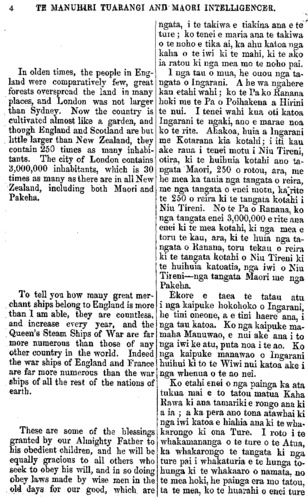 4 TE MANUHIRI TUARANGI AND MAORI INTELLIGENCER. In olden times, the people in Eng- land were comparatively few, great forests overspread the land in many places, and London was not larger than Sydney. Now the country is cultivated almost like a garden, and though England and Scotland are but little larger than New Zealand, they contain 250 times as many inhabi- tants. The city of London contains 3,000,000 inhabitants, which is 30 times as many as there are in all New Zealand, including both Maori and Pakeha. To tell you bow many great mer- chant ships belong to England is more than 1 am able, they are countless, and increase every year, and the Queen's Steam Ships of War are far more numerous than those of any other country in the world. Indeed the war ships of England and France are far more numerous than the war ships of all the rest of the nations of earth. These are some of the blessings granted by our Almighty Father to his obedient children, and he will be equally gracious to all others who seek to obey his will, and in so doing obey laws made by wise men in the old days for our good, which, are ngata, i te takiwa e tiakina ana e te ture ; ko tenei e maria ana te takiwa o te noho e tika ai, ka ahu katoa nga kaha o te iwi ki te mahi, ki te ako ia ratou ki nga mea mo te noho pai. I nga tau o mua, he ouou nga ta- ngata o Ingarani. A he wa ngahere kau etahi wahi; ko te Pa ko Ranana hoki me te Pa o Poihakena a Hirini te nui. I tenei wahi kua oti katoa Ingarani te ngaki, ano e marae noa ko te rite. Ahakoa, huia a Ingarani me Kotarana kia kotahi; i iti kau ake raua i tenei motu i Niu Tireni, otira, ki te huihuia kotahi ano ta- ngata Maori, 250 o ratou, ara, me he mea ka tauia nga tangata o reira, me nga tangata o enei motu, ka rite te 250 o reira ki te tangata kotahi i Niu Tireni. No te Pa o Ranana ko nga tangata enei 3,000,000 e rite ana enei ki te mea kotahi, ki nga mea e toru te kau, ara, ki te huia nga ta- ngata o Ranana, toru tekau o reira ki te tangata kotahi o Niu Tireni ki te huihuia katoatia, nga iwi o Niu Tireni—nga tangata Maori me nga Pakeha. Ekore e taea te tatau atu i nga kaipuke hokohoko o Ingarani, he tini oneone, a e tini haere ana, i nga tau katoa. Ko nga kaipuke ma- maha Manuwao, e nui ake aua i to nga iwi ke atu, puta noa i te ao. Ko nga kaipuke manawao o Ingarani huihui ki to te Wiwi nui katoa ake i nga whenua o te ao nei. Ko etahi enei o nga painga ka ata tukua mai e to tatou matua Kaha Rawa ki ana tamariki e rongo ana ki a ia ; a ka pera ano toua atawhai ki nga iwi katoa e hiahia ana ki te wha- karongo ki ona Ture. I roto i te whakamananga o te ture o te Atua, ka whakarongo te tangata ki nga ture pai i whakaturia e te hunga to- hunga ki te whakaaro o namata, no te mea hoki, he painga era mo tatou, ta te mea, ko te huarahi o enei ture