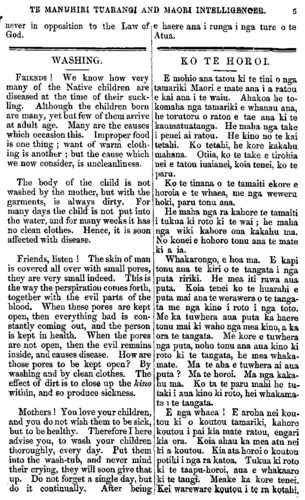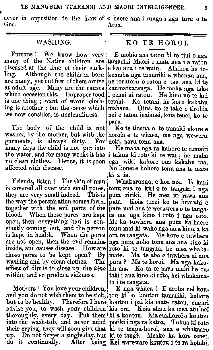 TE MANUHIRI TUARANGI AND MAORI INTELLIGENCER. 5 never in opposition to the Law of God. WASHING. FRIENDS ! We know how very many of the Native children are diseased at the time of their suck- ling. Although the children born are many, yet but few of them arrive at adult age. Many are the causes which occasion this. Improper food is one thing ; want of warm cloth- ing is another ; but the cause which we now consider, is uncleanliness. The body of the child is not washed by the mother, but with the garments, is always dirty. For many days the child is not put into the water, and for many weeks it has no clean clothes. Hence, it is soon affected with disease. Friends, listen ! The skin of man is covered all over with small pores, they are very small indeed. This is the way the perspiration comes forth, together with the evil parts of the blood. When these pores are kept open, then everything bad is con- stantly coming out, and the person is kept in health. When the pores are not open, then the evil remains inside, and causes disease. How are those pores to be kept open? By washing and by clean clothes. The effect of dirt is to close up the kino within, and so produce sickness. Mothers! You love your children, and you do not wish them to be sick, but to be healthy. Therefore I here advise you, to wash your children thoroughly, every day. Put them into the wash-tub, and never mind their crying, they will soon give that up. Do not forget a single day, but do it continually. After being e haere ana i runga i nga ture o te Atua. KO TE HOROI. E mohio ana tatou ki te tini o nga tamariki Maori e mate ana i a ratou e kai ana i te waiu. Ahakoa he to- komaha nga tamariki e whanau ana, he torutoru o ratou e tae ana ki te kaumatuatanga. He maha nga take i penei ai ratou. He kino no te kai tetahi. Ko tetahi, he kore kakahu mahana. Otiia, ko te take e tirohia nei e tatou inaianei, koia tenei, ko te paru. Ko te tinana o te tamaiti ekore e horoia e te whaea, me nga weweru hoki, paru tonu ana. He maha nga ra kahore te tamaiti i tukua ki roto ki te wai; he maha nga wiki kahore ona kakahu ma. No konei e hohoro tonu ana te mate ki a ia. Whakarongo, e hoa ma. E kapi tonu ana te kiri o te tangata i nga puta ririki. He mea iti rawa aua puta. Koia tenei ko te huarahi e puta mai ana te werawera o te tanga- ta me nga kino i roto i nga toto. Me ka tuwhera aua puta ka haere tonu mai ki waho nga mea kino, a ka ora te tangata. Me kore e tuwhera nga puta, noho tonu ana aua kino ki roto ki te tangata, he mea whaka- mate. Ma te aha e tuwhera ai aua puta ? Ma te horoi. Ma nga kaka- hu ma. Ko ta te paru mahi he tu- taki i aua kino ki roto, hei whakama- te i te tangata. E nga whaea ! E aroha nei kou- tou ki o koutou tamariki, kahore koutou i pai kia mate ratou, engari kia ora. Koia ahau ka mea atu nei ki a koutou. Kia ata horoi o koutou potiki i nga ra katoa. Tukua ki roto ki te taapu-horoi, aua e whakaaro ki te tangi. Meake ka kore tenei. Kei wareware koutou i te ra kotahi.