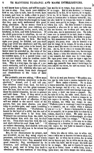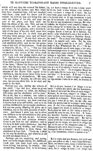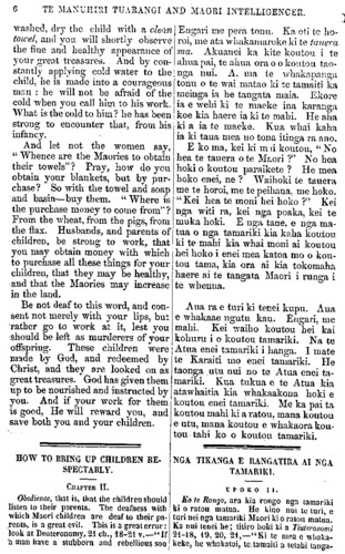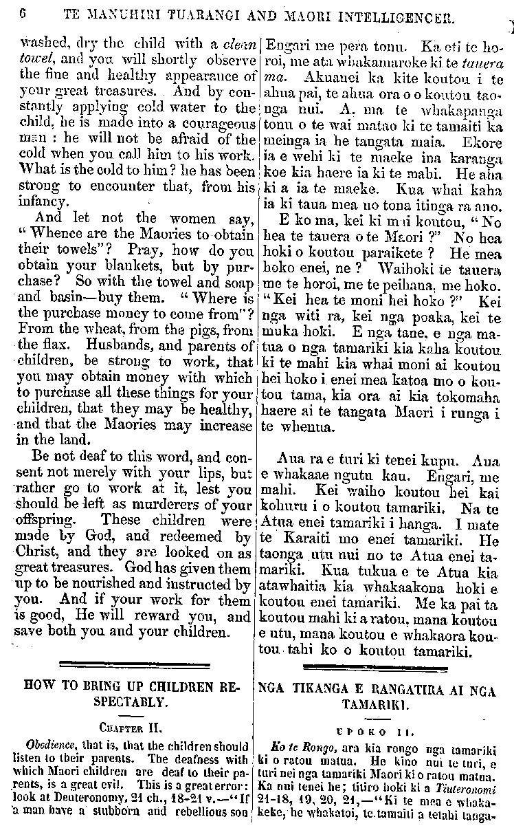 6 TE MANUHIRI TUARANGI AND MAORI INTELLIGENCER. washed, dry the child with a clean towel, and you will shortly observe the fine and healthy appearance of your great treasures. And by con- stantly applying cold water to the child, he is made into a courageous man : he will not be afraid of the cold when you call him to his work. What is the cold to him ? he has been strong to encounter that, from his infancy. And let not the women say, " Whence are the Maories to obtain their towels"? Pray, how do you obtain your blankets, but by pur- chase? So with the towel and soap and basin—buy them. " Where is the purchase money to come from" ? From the wheat, from the pigs, from the flax. Husbands, and parents of children, be strong to work, that you may obtain money with which to purchase all these things for your children, that they may be healthy, and that the Maories may increase in the land. Be not deaf to this word, and con- sent not merely with your lips, but rather go to work at it, lest you should, be left as murderers of your offspring. These children were made by God, and redeemed by Christ, and they are looked on as great treasures. God has given them up to be nourished and instructed by you. And if your work for them is good, He will reward you, and save both you and your children. HOW TO BRING UP CHILDREN RE- SPECTABLY. CHAPTER II. Obedience, that is, that the children should listen to their parents. The deafness with which Maori children are deaf to their pa- rents, is a great evil. This is a great error: look at Deuteronomy, 21 ch., 18-21 v.—"If a man have a stubborn and rebellious son Engari me pera tonu. Ka oti te ho- roi, me ata whakamaroke ki te tauera ma. Akuanei ka kite koutou i te ahua pai, te ahua ora o o koutou tao- nga nui. A. ma te whakapanga tonu o te wai matao ki te tamaiti ka meinga ia he tangata maia. Ekore ia e wehi Id te maeke ina karanga koe kia haere ia ki te mahi. He aha ki a ia te maeke. Kua whai kaha ia ki taua mea no tona itinga ra ano. E ko ma, kei ki mai koutou, " No hea te tauera o te Maori ?" No hea hoki o koutou paraikete ? He mea hoko enei, ne ? Waihoki te tauera me te horoi, me te peihana, me hoko. " Kei hea te moni hei hoko ?" Kei nga witi ra, kei nga poaka, kei te muka hoki. E nga tane, e nga ma- tua o nga tamariki kia kaha koutou ki te mahi kia whai moni ai koutou hei hoko i enei mea katoa mo o kou- tou tama, kia ora ai kia tokomaha haere ai te tangata Maori i runga i te whenua. Aua ra e turi ki tenei kupu. Aua e whakaae ngutu kau. Engari, me mahi. Kei waiho koutou hei kai kohuru i o koutou tamariki. Na te Atua enei tamariki i hanga, I mate te Karaiti mo enei tamariki. He taonga .utu nui no te Atua enei ta- mariki. Kua tukua e te Atua kia atawhaitia kia whakaakona hoki e koutou enei tamariki. Me ka pai ta koutou mahi ki a ratou, mana koutou e utu, mana koutou e whakaora kou- tou tahi ko o koutou tamariki. NGA TIKANGA E RANGATIRA AI NGA TAMARIKI. UPOKO II. Ko te Kongo, ara kia rongo nga tamariki ki o ratou matua. He kino nui te turi, e turi nei nga tamariki Maori ki o ratou matua. Ka nui tenei he; titiro hoki ki a Tiuteronomi 21-18, 19, 20, 21,—"Ki te mea e whaka- keke, he whakatoi, te tamaiti a tetahi tanga-