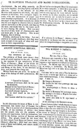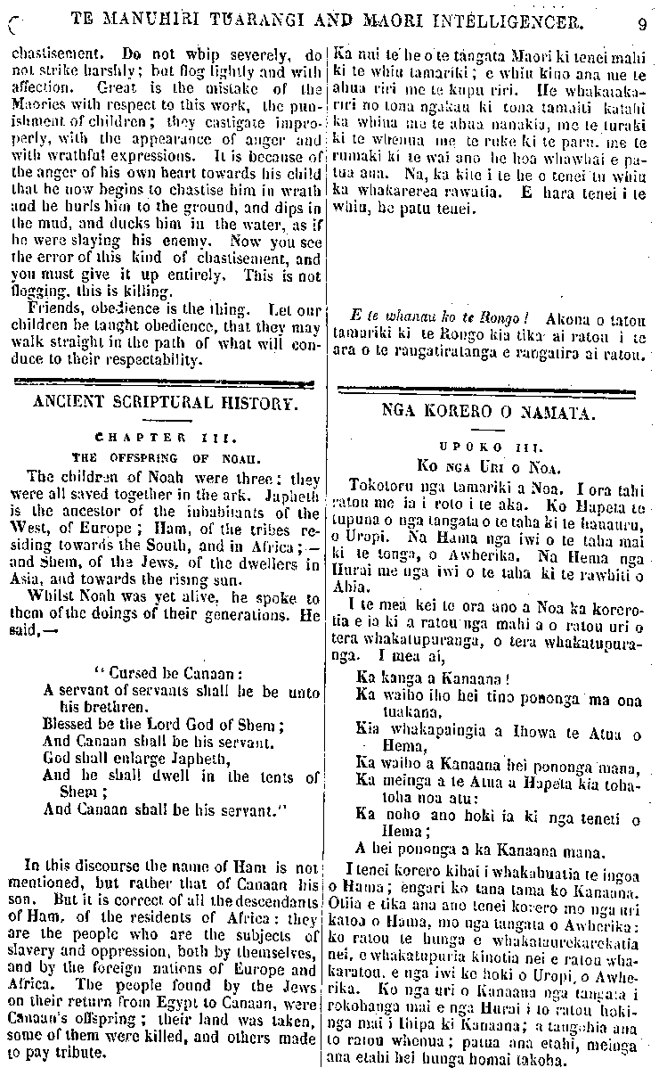 TE MANUHIRI TUARANGI AND MAORI INTELLIGENCER. 9 chastisement. Do not whip severely, do not strike harshly; but flog lightly and with affection. Great is the mistake of the Maories with respect to this work, the pun- ishment of children ; they castigate impro- perly, with the appearance of anger and with wrathful expressions. It is because of the anger of his own heart towards his child that he now begins to chastise him in wrath and he hurls him to the ground, and dips in the mud, and ducks him in the water, as if he were slaying his enemy. Now you see the error of this kind of chastisement, and yon must give it up entirely. This is not flogging, this is killing. Friends, obedience is the thing. Let our children be taught obedience, that they may walk straight in the path of what will con- duce to their respectability. ANCIENT SCRIPTURAL HISTORY. CHAPTER III. THE OFFSPRING OF NOAH. The children of Noah were three: they were all saved together in the ark. Japheth is the ancestor of the inhabitants of the West, of Europe ; Ham, of the tribes re- siding towards the South, and in Africa; — and Shem, of the Jews, of the dwellers in Asia, and towards the rising sun. Whilst Noah was yet alive, he spoke, to them of the doings of their generations. He said,— " Cursed be Canaan : A servant of servants shall he be unto his brethren. Blessed be the Lord God of Shem; And Canaan shall be his servant. God shall enlarge Japheth, And he shall dvvell in the tents of Shem; And Canaan shall be his servant." In this discourse the name of Ham is not mentioned, but rather that of Canaan his son. But it is correct of all the descendants of Ham, of the residents of Africa : they are the people who are the subjects of slavery and oppression, both by themselves, and by the foreign nations of Europe and Africa. The people found by the Jews on their return from Egypt to Canaan, were Canaan's offspring ; their land was taken. some of them were killed, and others made to pay tribute. I Ka nui te he o te tangata Maori ki tenei mahi ki te whiu tamariki; e whiu kino ana me te ahua riri me te kupu riri. He whakataka riri no tona ngakau ki tona tamaiti katahi ka whiua inu te ahua nanakia, me te turaki ki te whenua me te ruke ki te paru, me te rumaki ki te wai ano he hoa whawhai e pa- tua ana. Na, ka kite i te he o tenei tu whiu ka whakarerea rawatia. E hara tenei i te whiu, hu patu tenei. E te whanau ko te Rongo ! Akona o tatou tamariki ki te Rongo kia tika ai ratou i te ara o te rangatiratanga e rangatira ai ratou. NGA KORERO O NAMATA. UPOKO III. KO NGA URI O NOA. Tokotoru nga tamariki a Noa. I ora tahi ratou me ia i roto i te aka. Ko Hapeta to tupuna o nga tangata o te taha ki te hauauru, o Uropi. Na Hama nga iwi o te taha mai ki te tonga, o Awherika. Na Hema nga Hurai me nga iwi o te taha ki te rawhiti o Ahia. I te mea kei te ora ano a Noa ka korero- tia e ia ki a ratou nga mahi a o ratou uri o tera whakatupuranga, o tera whakatupura- nga. I mea ai, Ka kanga a Kanaana Ka waiho iho hei tino pononga ma ona tuakana, Kia whakapaingia a Ihowa te Atua o Hema, Ka waiho a Kanaana hei pononga mana, Ka meinga a te Atua a Hapeta kia toha- toha noa atu: Ka noho ano hoki ia ki nga teneti o Hema; A hei pononga a ka Kanaana mana. I tenei korero kihai i whakahuatia (e ingoa o Hama; engari ko tana tama ko Kanaana. Otiia e tika ana ano tenei korero mo nga uri katoa o Hama, mo nga tangata o Awherika: ko ratou te hunga e whakataurekarekatia nei, e whakatupuria kinotia nei e ratou wha- karatou e nga iwi ke hoki o Uropi, o Awhe- rika. Ko nga uri o Kanaana nga (tangata i rokohanga mai e nga Hurai i to ratou hoki- nga mai i Ihipa ki Kanaana; a tangohia ana to ratou whenua; pama ana etahi, meinga ana etahi hei hunga homai takoha.