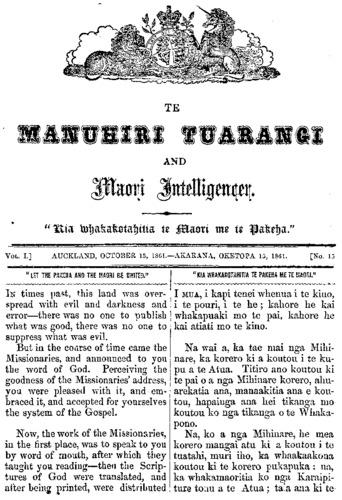 Te Manuhiri Tuarangi Maori Intelligencer 1861: Number 15. 15 October 1861 |