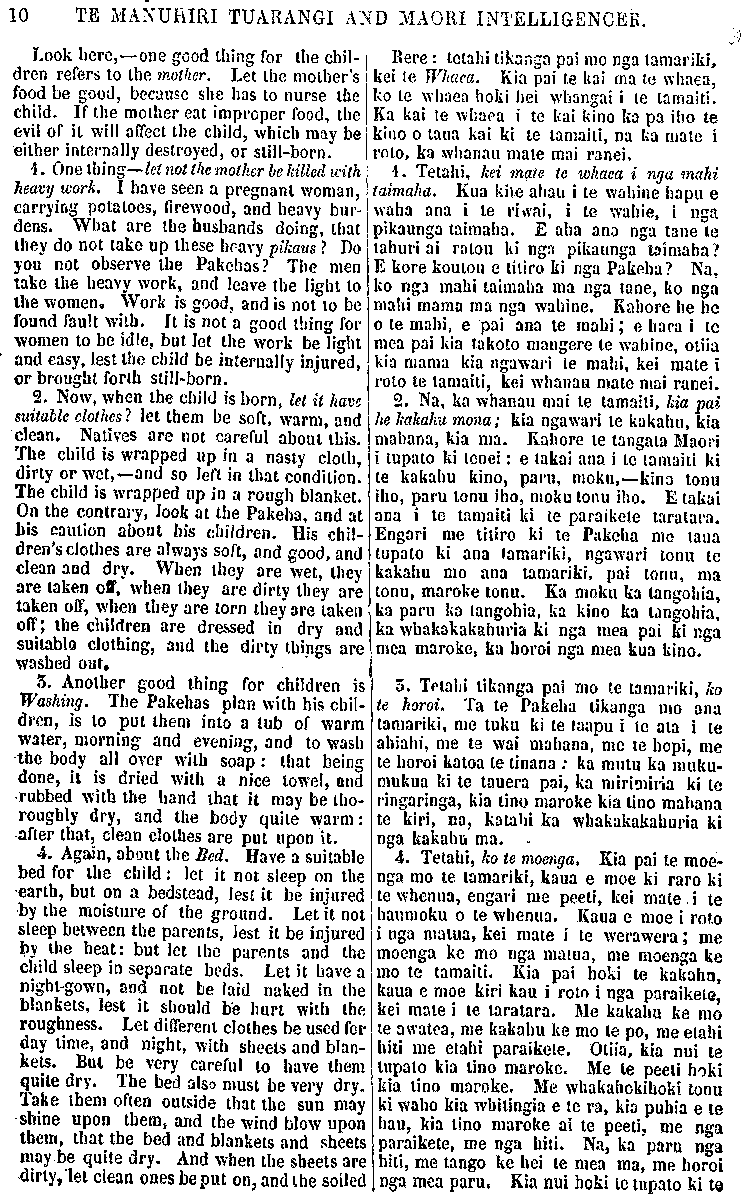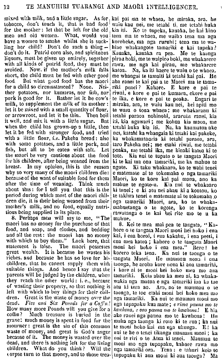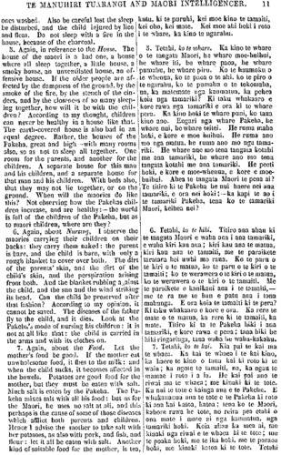 TE MANUHIRI TUARANGI AND MAORI INTELLIGENCER. 11 ones washed. Also be careful lest the sleep be disturbed, and the child injured by lice and fleas. Do not sleep with a fire in the house, because of the charcoal. 5. Again, in reference to the House. The house of the maori is a bad one, a house where all sleep together, a little house, a smoky house, an unventilated house, an of- fensive house. If the older people are af- fected by the dampness of the ground, by the smoke of the fire, by the stench of the cin- ders, and by the closeness of so many sleep- ing together, how will it be with the chil- dren? According to my thought, children can never be healthy in a house like that. The earth-covered house is also bad in an equal degree. Rather, the houses of the Pakeha, great and high —with many rooms also, so as not to sleep all together. Ono room for the parents, and another for the children. A separate house for this man and his children, and a separate house for that man and his children. With beds also, that they may not lie together, or on the ground. When will the Maoris do like this? Not observing how the Pakehas chil- dren increase, and are healthy:—the world is full of the children of the Pakeha, but as to maori children, where are they? 6, Again, about Nursing, I observe the maories carrying their children on their backs: they carry them naked: the parent is bare, and the child is bare, with only a rough blanket to cover over both. The dirt of the parents skin, and the diet of the child's skin, and the perspiration arising from both. And the blanket rubbing against the child, and the sun and the wind striking its head. Can the child be preserved after that fashion? According to my opinion, it cannot be saved. The diseases of the father fly to the child, and it dies. Look at the Pakeha mode of nursing his children: it is not at all like that: the child is carried in the arms and with its clothes on. 7. Again, about the Food!. Let the mother's food be good. If the mother eat unwvholesome food, it flies to the milk: and when the child sucks, it becomes affected in the bowels. Potatoes are good food for the mother, but they must be eaten with salt. Much salt is eaten by the Pakeha. The Pa- keha mixes salt with all his food: but as for the Maori, he uses no salt at all, and this perhaps is the cause of some of those diseases which afflict both parents and children. Hence 1 advise the mother to take salt with her potatoes, as also with pork, and fish. and flour: let it all be eaten with salt. Another kind of suitable food for the mother, is tea, kutu, ki te puruhi, kei moe kino te tamaiti, kei oho, kei mate. Kei moe ahi hoki i roto i te whare, ka kino te ngarahu. 5. Tetahi, ko te whare. Ka kino te whare o te tangata Maori, ha whare moe-huihui, he whare iti, he whare paoa, he whare pumahu, he whare piro. Ko te haumoku o te whenua, ko te paoa o te ahi. ko te piro o te ngarahu, ko te pumahu o te tokomaha, na, ka matemate nga kaumatua, ka pehea koia nga tamariki? Ki taku whakaaro e kore rawa nga tamariki e ora ki te whare pera. Ka kino hoki te whare puni, ko taua kino ano. Engari nga whare Pakeha, he whare nui, he whare teitei. He ruma maha hoki, e kore e moe huihui. He ruma ano mo nga matua, he ruma ano mo nga tama- riki. He whare ano mo tena tangata kotahi me ana tamariki, he whare ano mo tena tangata kotahi me ana tamariki. He peeti hoki, e kore e moe whenua, e kore e moe huihui. Ahea te tangata Maori te pena ai? Te titiro ki te Pakeha he nui haere nei ana tamariki, e ora nei hoki;—ka kapi te ao i te tamariki Pakeha, tena ko te tamariki Maori, keihea nei? 6. Tetahi, ko te hihi. Titiro ana ahau ki te tangata Maori e waha ana i ana tamariki, e waha kiri kau ana; kiri kau ana te matua, ki ri kau ana te tamaiti, me te paraikete taratara hei uwhi mo raua. Ko te paru o te kiri o te mama, ho te paru o te kin o te tamaiti; ko te werawera o te kiri o te mama, ko te werawera o te kiri o te tamaiti. Me te paraikete e kanikani ana i te tamaiti,— me te ra me te hau e patu ana i tona mahunga. E ora koia te tamaiti ki te pera? Ri taku whakaaro e kore e ora. Ka rere te mate o te matua, ka rere ki te tamaiti, ka male. Titiro ki la te Pakeha hiki i ana tamariki, e kore rawa e pena; tana hiki he hiki ringaringa, tana waha he waha kakahu. 7. Tetahi, ko te kai. Kia pai te kai ma te whaea. Ka kai te whaea i te kai kino, ka haere te kino o taua kai ki roto ki te waiu; ka ngote te tamaiti, na, ka ngau te mamae i roto i a ia. He kai pai ano te riwai ma te whaea; me kinaki ki te tote. Ka nui te tote e kainga ana e te Pakeha. E whakananua ana te tote e te Pakeha ki roto ki ana kai katoa, katoa; tena ko te Maori, kahore rawa he tote, no reira pea etahi o ona mate i mate ai nga kaumatua, nga tamariki hoki. Koia ahau ka mea ai, mo kinaki nga riwai e te whaea ki te tote; my te poaka hoki, me te ika hoki, me te paraoa hoki, me kinaki katoa ki te tote. Tetahi