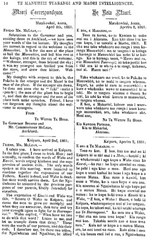 14 TE MANUHIRI TUARANGI AND MAORI INTELLIGENCER. Maori Correspondence Matakowhai, Aotea, April 8th, I 861. FRIEND MR. MCLEAN,— Salutations to the Governor and you, residing there at Auckland,—we have seen your words of the 1st instant. My thoughts are correct in regard to the welcome to the Manuwhiri. It is for the men of the place to bail the Manuwhiri, and bid him rest at the kainga, and this is the cry of welcome. "Welcome, stranger, from beyond the sky; it was my youngest son fetched you from the stars, and drew thee hither. Welcome!' My thoughts with respect to this is, the Pakeha is the Stranger and the Maori is the man of the place. If the stranger sits down, he does not soon rise to "Taki" (make a speech'); the man of the place has to begin it, and then the stranger and the man of the place both make speeches. Friend, I have not forgotten my thoughts about the wel- come to strangers. From TE WETINI TE HORO. To Governor Browne and Mr. Commissioner McLean, Auckland. Kaipara, April 2nd, 1861. FRIEND, MR. MCLEAN,— I salute you. I have arrived at Kaipara. In the first place, I came to fetch Male; and secondly, to confirm the words of Waho and Kawiti, words urging kindness and the sup- pression of ancient evils. e] he only words spoken at this meeting, were intended to combine together the expressions of our Fathers. Kawiti is dead, and Waho is dead, but their words survive them. Let the Nga- tiwhatua be animated by the gracious pur- poses of our parents kindly (intended) for ourselves. The expression of Kawhi and Waho was this, "Return O Waho to Kaipara, and cause the men to grow (or multiply) and when they are numerous, then turn and try your strength again in fight for the "Ikaranga- nui." Waho replied, " What have we two to do with that word? Listen to me, and let us trample down that thing.'' These were the words of our parents, and this their oath. I therefore say, let these two tribes, the Ngatiwhatua and Ngatihine be allied He Reta Maori Matakowhai, Aotea, April 8, 1861. E HOA, E MAKARINI,— Tena ra korua, KO te Kawana to noho mai ma i Akarana. Kua kite ahau i ta ko- rua kupu, i te tuatahi o Maehe, 1861. E tika ana taku whakaaro mo runga i tena ka- ranga Manuwhiri: ma te tangata i (e kainga e karanga te Manuwhiri kia noho ki te kai- nga. Ko te karanga tenei, " Haere mai ra, e te Manuwhiri Tuarangi', na taku potiki koe i tiki atu ki te whetu o te rangi, kukume, mai ai. Haere mai" Taku whakaaro mo tenei ko te Pakeha te Manuwhiri, ko te mahi te tangata whenua. Engari, ka noho ki raro te manuwhiri: e kore e whakatika wawe te manuwhiri ki te taki. Ma te tangata whenua e timata he taki, ka tahi ka whai korero te manuwhiri, te tangata whenua. E hoa, e Makarini, kahore ano i ware- ware taku whakaaro mo runga i tenei kara- nga manuwhiri, ara, taku whakaaro ake. Heoi ano, Na TE WETINI TE HORO. Kia Kawana Paraone, Kia te Makarini, Akarana. Kaipara, Aperira 2, 1861. E HOA E TE MAKARINI,— Tena ra koe. E hoa, kua tae mai au ki Kaipara ki te tiki mai i a Mate;— -kotahi; ki te whakatutuki i nga kupu a Waho raua ko Kawiti,—ka rua: he kupu atawhai na raua, he pehi i nga kino o mua. Heoi ano nga kupu o tenei huihui he hono i nga kupu a o matou Matua. Kua mate a Kawiti, kua mate a Waho, ko a raua kupu e ora ana. Kia marama ai Ngatiwhatua ki nga kupu pai a o matou Matua. He kupu atawhai mo matou: ko te kupu hoki tenei a Kawiti ki a Waho, "E hoa, e Waho! Haere, e hoki ki Kaipara, whakatuputupu mai ai i te tangata. Ka tupu, ka tahuri mai, ka ki i tetahi whainga mo Te Ikaranganui" Ka mea atu a Waho, "Hei aha ma taua tena kupu? Kia rongo mai koe. Takahia noatia ano e taua tena mea." Koia nei te kupu a o matou Matua. aro, he oati tenei na raua. Koia ahau i mea ai, kia honea enei iwi e rua, a Ngatiwhatua