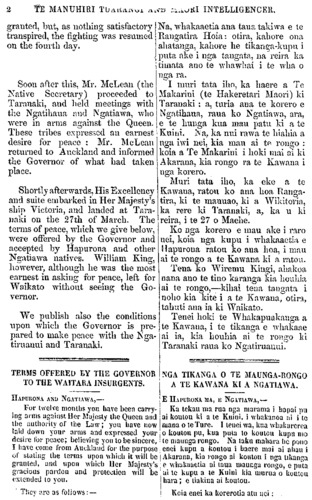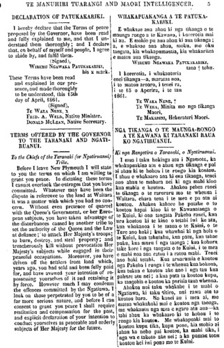 TE MANUHIRI TUARANGI AND MAORI INTELLIGENCER. 5 DECLARATION OF PATUKAKARIKI I hereby declare that the Terms of peace proposed by the Governor, have been read and fully explained to me, and that I un- derstand them thoroughly; and I declare that, on behalf of myself and people, 1 agree to abide by, and fulfil them. (Signed), WIREMU NGAWAKA PATUKAKARIKI, his x mark. These Terms have been read and explained in our pre- sence, and made thoroughly to be understood, this 15th day of April, 1861. (Signed), TE WAKA NENE, x FRED. A. WELD, Native Minister. DONALD MCLEAN, Native Secretary. TERMS OFFERED BY THE GOVERNOR TO THE TARANAKI AND NGATI- RUANUI. To the Chiefs of the Taranaki (or Ngatiruanui) Tribe. Before I leave New Plymouth I will state to you the term's on which I am willing te grant you peace. In dictating these term's I cannot overlook the outrages that you have committed. Whatever may have been the dispute in reference to the land at Waitara it was a matter with which you had no con- cern. Without even pretence of quarrel with the Queen's Government, or her Euro- pean subjects, you have taken advantage of the disturbances caused by another tribe to set the authority of the Queen and the Law at defiance to attack Her Majesty's troops; to burn, destroy, and steal property; and treacherously kill without provocation Her Majesty's subjects while engaged in their peaceful occupations. Moreover, you have driven off the settlers from land which, years ago, you had sold and been fully paid for, and have avowed your intention of re- possessing yourselves of it and retaining it by force. However much I may condemn the offences committed by the Ngatiawa, I look on those perpetrated by you to be of a far more serious nature, and before I can consent to grant you peace I shall require restitution and compensation for the past, and explicit declaration of your intention to conduct yourselves as peaceable and orderly subjects of Her Majesty for the future. WHAKAPUAKANGA A TE PATUKA- KARIKI. E whakaae ana ahau ki nga tikanga o te maunga rongo a te Kawana, i korerotia mai ki au. E mohio pu ana ahau ki aua tikanga; a, e whakaae ana ahau, moku, mo oku tangata, kia whakapumautia, kia whakaritea e matou aua tikanga. WIREMU NGAWAKA PATUKAKARIKI, tana x tohu. 1 korerotia, i whakaaturia enei tikanga—a, marama noa, i to matou aroaro, i tenei ra, i te 15 o Aperira, i te tau 1861. TE WAKA NENE, x TE WERA, Minita mo nga tikanga Maori, TE MAKARINI, Hekeretari Maori. NGA TIKANGA O TE MAUNGA RONGO A TE KAWANA KI TARANAKI RAUA KO NGATIRUANUI Ki nga Rangatira o Taranaki, o Ngatiruanui. I mua i taku hokinga atu i Ngamotu, ka whakapuakina atu e ahau nga tikanga e pai ai ahau ki te hohou i te rongo kia koutou. I ahau e whakaaro ana ki ena tikanga, tenei ano ahau te mahara nei ki nga mahi kino kua mahia e koutou. Ahakoa pehea ranei te tikanga o te raruraru mo te whenua i Waitara, ehara tena i te mea e pa atu ai koutou. Ahakoa kahore he putake o to koutou hapai kino ki te Kawanatanga o te Kuini, ki ona tangata Pakeha ranei, kua uru koutou ki te kino o tetahi iwi ke atu, kua whakanoa i te mana o te Kuini, o te Ture ano hoki; kua whawhai ki nga hoia o te Kuini, kua tahutahu, kua patu, kua tahae puku, kua muru i nga taonga; kua kohura take kore i nga tangata o te Kuini, i te mea e mahi noa anu ratou i a ratou mahi. Tenei ano hoki tetahi. Kua aruarumia e koutou nga Pakeha i runga i te whenua kua hokona, kua tukua e koutou ake ano i nga tau kua pahure atu nei; a kua puta ia koutou kupu, ka tangohia e koutou ka puritia taua whenua. Ahakoa nui taku whakahe i te mahi o Ngatiawa, ki taku titiro, nui rawa atu to koutou hara. No konei au i mea ai, me matua whakahoki mai e koutou nga taonga, me whakautu nga mea e ngaro atu ana—ka tahi ahau ka whakaaro ki te hohou i te rongo kia koutou. Me whakapuaki mai to koutou kupu tika, kupu pono, kia mohio ai ahau ka noho pai koutou, ka mahi tika, i nga wa e takoto ake nei; a ka pumau tonu koutou hei iwi pono mo te Kuini.