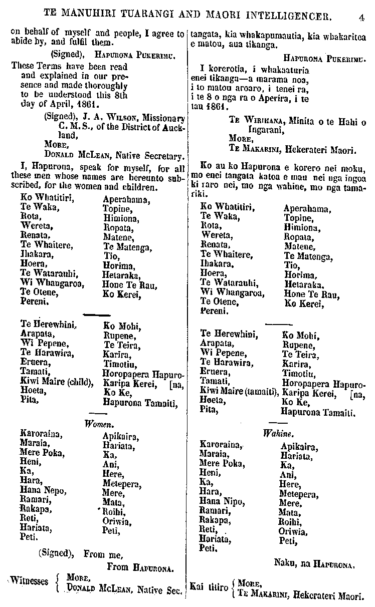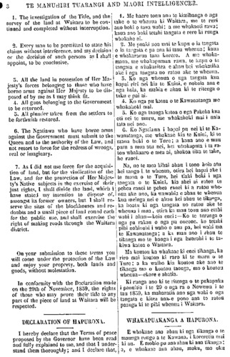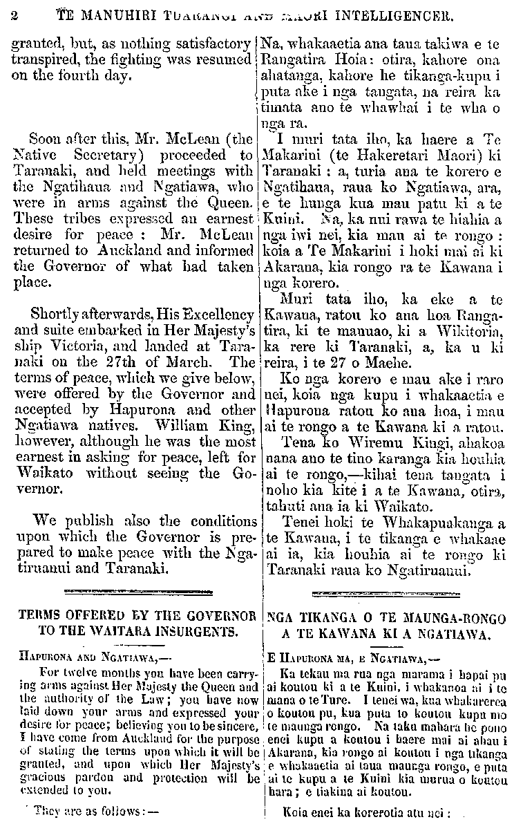 3 TE MANUHIRI TUARANGI AND MAORI INTELLIGENCER. 1. The investigation of the Title, and the survey of the land at Waitara to be con- tinued and completed without interruption. 2. Every man to be permitted to stale his claims wiihout interference, and my decision or the decision of such persons as I shall appoint, to be conclusive. 3. All the land in possession of Her Ma- jesty's forces belonging to those who have borne arms against Her Majesty to be dis- posed of by me as I may think fit. 4. All guns belonging to the Government to be returned. 5. All plunder taken from the settlers to be forthwith restored. 6. The Ngatiawa who have borne arms against the Government must submit to the Queen and to the authority or the Law, and not resort to force for the redress of wrongs, real or imaginary. 1. As I did not use force for the acquisi- tion of land, but for the vindication of the Law, and for the protection of Her Majes- ty's Native subjects io the exercise of their just rights, I shall divide the land, which I have stated my intention to dispose or, amongst its former owners, but I shall re- serve the sites or the blockhouse's and re- doubts and a small piece of land round each for the public use, and shall exercise the right of making roads through the Waitara district. On your submission to these term's you will come under the protection of the Law and enjoy your property, both lands and goods, without molestation. In conformity with the Declaration made on the 29th of November, 1859, the rights of those who may prove their title to any part of the piece of land at Waitara will be respected. DECLARATION OF HAPURONA. I hereby declare that the Terms of peace proposed by the Governor have been read and fully explained to me, and that I under- stand them thoroughly; and I declare that, 1. Me haere tonu ano te kimihanga o nga take o te whenua ki Waitara, mo te ruri ano hoki o taua wahi; a me whakaoti rawa; kaua ano hoki tetahi tangata e rere ki runga whakahe ai. 2. Me puaki noa mai te kupu o ia tangata o ia tangata e pa ana ki taua whenua; kaua e whakararua tana korero. A me whaka- mana, me whakapumau rawa, te kupu o te tangata e whakaritea e ahau hoi whakatika ake i nga tangata no ratou ake to whenua. 3. Ko nga whenua o nga tangata kua hapai riri nei kia te Kuini, e nohoia ana e nga hoia, ka mahia e ahau ki te ritenga o taku e pai ai. 4. Ro nga pu katoa o te Kawanatanga me whakahoki mai. 5. Ko nga taonga katoa o nga Pakeha kua oti nei te muru, me whakahoki mai i naia tata nei ano. 6. Ko Ngatiawa i hapai pu nei ki te Ka- wanatanga, me whakaae kia te Kuini, ki te mana hoki o to Ture; a kaua ano e mau patu a mua atu nei, hei whakaputa i ta ra tou whakaaro e mea ai, ahakoa tika te take, he ranei. Na, no te mea kihai ahau i tono hoia atu hei tango i. te whenua, otira hei hapai ake i te mana o te Ture, hei tiaki hoki i nga tangata o te Kuini, kia ahei ai ratou te pehea ranei te pehea ranei ki a ratou whe- nua ake ano, ka wawahia e ahau te whenua kua meinga, nei e ahau kei ahau te tikanga, ka hoatu ki nga tangata no ratou ake te whenua i mua, otira ka mau tonu ano etahi wahi i ahau—koia enei:—Ko te turanga o nga pa rakau o nga pa oneone, ko tetahi pihi nohinohi i waho o aua pa, hei wahi ma te Kawanatanga; a ka mau ano i ahau te tikanga mo te hangai nga huarahi i te ta- kiwa katoa o Waitara. Ma koutou ka whakaae ki enei tikanga, ka riro mai koutou ki raro ki te maru o te Ture; a ka waiho kia koutou ake ano te tikanga mo o koutou taonga, mo o koutou whenua—ekore e ahatia. Ki runga ano ki te ritenga o te pukapuka i panuitia i te 29 o nga ra o Nowema i te tau 1859, ka maharatia ano nga wahi o nga tangata e kitea ana e pono ana to ratou paanga ki te pihi whenua i Waitara. WHAKAPUAKANGA A HAPURONA. E whakaae ana ahau ki nga tikanga o te maunga rongo a te Kawana, i korerotia mai ki au. E mohio pu ana ahau ki aua tikanga; a, e whakaae ana ahau, moku, mo oku