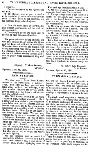 6 TE MANUHIRI TUARANGI AND MAORI INTELLIGENCER. I require— 1. Entire submission to the Queen and the Law. 2. All plunder now in your possession to be forthwith given up, and compensation made for that which is not returned, and for property destroyed and injured. I 3. That all mails shall be permitted to pass without interruption, and the mail car- riers protected. 4. That people, goods, and cattle shall be allowed to pass without molestation. The grave offence of killing unarmed set- tlers and children is one against the Queen and the Law, and will not be overlooked. Whenever those men who are charged with having committed that offence are taken by the Officers of Justice they will be tried, and the law will declare whether they are guilty, and, if guilty, what punishment they shall suffer. (Signed), I. GORE BROWNE, Governor. Ngamotu, April 13, 1861. RENATA'S LETTER. We have seen a Ietter from Renata, written at the Pawhakairo, in February, 1861. This letter is a long one, and con- tains many subjects; and although, in our view, some of the parts are correct, yet the greater portion of the letter is neither cor- rect nor well-informed. This Chief,. Renata, belongs to the Ngati- kahuhunu tribe, residing at Ahuriri. He is a thoughtful man, and of a good disposition towards his race: but his thoughts have now become one-sided, and he has given way to murmuring at everything which is done by the Government. What can be the cause of our friend's acting thus? We can only imagine that he has been instructed by some evil-disposed European: or that it arises from his own sadness at the great destruction which the Natives have met with, in their war with us, at Taranaki. If he grieves over his people, it is right to do so, as we also grieve much at their suicidal conduct. But what can wo do, so long as the Natives persist in fighting? We had imagined that we could live peaceably in this land, the same as in Euro- pean lands abroad: and, if any cause of trouble arise, whether springing from the Koia enei nga tikanga ka tonoa e ahau:— I. Me tino whakaae pono koutou ki te mana o te Kuini, o te Ture ano hoki. 2. Ko nga taonga katoa o nga Pakeha i a koutou me whakahoki mai, inaianei tonu ano; a me homai he utu mo nga mea e ngaro atu ana, mo nga mea kua pakarua, kua whakakinotia. 3. Me tuku nga meera kia haere i runga i o koutou kainga, kaua e ahatia,—me tiaki pai hoki nga kui pikau i te mera. 4. Me tuku nga tangata, nga taonga, me nga kararehe kia haere noa i nga huarahi, kaua e ahatia. Ko te hara nui ko te kohuru i nga tangata haere noa, i nga tamariki, he hara nui tena kiu te Kuini, ki te Ture ano hoki—me mahi ano tena. Kei to wa ano e hopukina ai nga tangata e meinga nei na ratou taua hara, e nga kai whakahaere i te Ture, ka whaka- wakia ratou: a ma te Ture e mea, mehemea i pono pu te whakapaenga o te hara kia ratou; a mehemea kua hara ratou, ma te Ture ano e whakarite te whakawakanga mo ratou. Na TAMATI KOA PARAONE, Na te Kawana. Ngamotu, Aperira 15, 1861. TE PUKAPUKA A RENATA. KUA kite nei matou i tetahi pukapuka a Renata, i tuhituhia ki te Pawhakairo, i Pepuere, 1861. He hanga roa ra tenei reta, ho maha hoki nga mea o roto: a, ki ta matou titiro, e tika ana ano etahi kupu, otira. ko te nuinga o te pukapuka, e he ana, e kuware ana. No Ahuriri tenei rangatira, a Renata, no Ngatikahununu. He tangata whai whakaaro ia, he tangata, ngakau-pai ki tona iwi, otira, kua titaha rawa; ana whakaaro inaianei, kua riro rawa i te amuamu ki nga tikanga katoa a te Kawanatanga. He aha ra i peneitia ai te ritenga a tu tatou hoa, he aha ranei? Heoi ano ta matou i kite ai: he mea wha- kaako ranei e tetahi Pakeha kino—he pouri- tanga noatanga ranei, nana, ki te mate nui o nga tangata Maori, i la ratou pakanga mai ki a matou ki Taranaki. Me he mea e pouri ana ia mo tona iwi, e tika ana: me matou hoki e tino pouri ana, mo la ratou tikanga whakamomori i a ratou. Otira, e taea e matou te pewhea, i te tohe tonu a nga tangata Maori ki te whawhai? Hua noa matou he noho marire ta tatou i konei, pena ano me nga whenua pakeha i tawahi; a, ki te puta ake te raruraru, na nga rangatira ranei, na te tangata noa iho