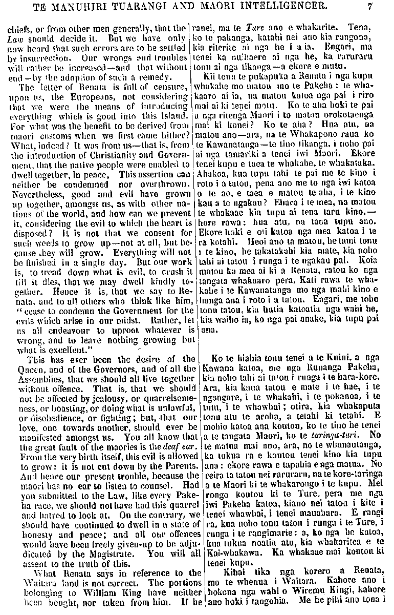 TE MANUHIRI TUARANGI AND MAORI INTELLIGENCER. 7 chiefs, or from other men generally, that the 1 Law should decide it. But we have only now heard that such errors are to be settled by insurrection. Our wrongs and troubles will rather be increased—and that without end—by the adoption of such a remedy. The letter of Renata is full of censure, upon us, the Europeans, not considering that we were the means of introducing everything which is good into this Island. For what was the benefit to be derived from maori customs when we first came hither? What, indeed? It was from us-that is, from the introduction of Christianity and Govern- ment, that the native people were enabled to dwell together, in peace. This assertion can neither be condemned nor overthrown. Nevertheless, good and evil have grown up together, amongst us, as with other na- tions of the world, and how can we prevent it, considering the evil to which the heart is disposed? It is not that we consent for such weeds to grow up—not at all, but be cause ..hey will grow. Everything will not be finished in a single day. But our work is, to tread down what is evil, to crush it till it dies, that we may dwell kindly to- gether. Hence it is, that wo say to Re- nata, and to all others who think like him, " cease to condemn the Government for the evils which arise in our midst. Rather, let us all endeavour to uproot whatever is wrong, and to leave nothing growing but what is excellent." This has ever been the desire of the Queen, and of the Governors, and of all the Assemblies, that we should all live together without offence. That is, that we should not be affected by jealousy, or quarrelsome- ness. or boasting, or doing what is unlawful, or disobedience, or fighting; but, that our love, one towards another, should ever be manifested amongst us. You all know that the great fault of the maories is the deaf ear. From the very birth itself, this evil is allowed to grovv: it is not cut down by the Parents. And hence our present trouble, because the maori has no ear to listen to counsel. Had you submitted to the Law, like every Pake- ha race, we should not have had this quarrel and hatred to look at. On the contrary, we should have continued to dwell in a state of honesty and peace; and all our offences would have been freely given-up to be adju- dicated by the Magistrate. You will all assent to the truth of this. What Renata says in reference to the Waitara! and is not correct. The portions belonging to William King have neither been bought, nor taken from him. If he ranei, ma te Ture ano e whakarite. Tena, ko te pakanga, katahi nei ano kia rangona, kia riterite ai nga he i a ia. Engari, ma tenei ka nuihaere ai nga he, ka raruraru tonu ai nga tikanga—a ekore e mutu. Kii tonu te pukapuka a Renata i nga kupu whakahe mo matou mo te Pakeha: te wha- kaaro ai ia, na matou katoa nga pai i riro mai ai ki tenei motu. Ko te aha hoki te pai a nga ritenga Maori i to matou orokotaenga mai ki konei? Ko te aha? Hua atu, ua matou ano—ara, na te Whakapono raua ko te Kawanatanga—te tino tikanga, i noho pai ai nga tamariki a tenei iwi Maori. Ekore tenei kupu e taea te whakahe, te whakataka. Ahakoa, kua tupu tahi te pai me te kino i roto i a tatou, pena ano me to nga iwi katoa o te ao, e taea e matou te aha, i te kino kau a te ngakau? Ehara i te mea, na matou te whakaae kia tupu ai tena taru kino,— hore rawa: hua atu, na tana tupu ano. Ekore hoki e oti katoa nga mea katoa i te ra kotahi. Heoi ano ta matou, he tami tonu i te kino, he takatakahi kia mate, kia noho tahi ai tatou i runga i te ngakau pai. Koia matou ka mea ai ki a Renata, ratou ko nga tangata whakaaro pera, Kati rawa te wha- kahe i te Kawanatanga mo nga mahi kino e hanga ana i roto i a tatou. Engari, me tohe tonu tatou, kia hutia katoatia nga vvahi he, kia waiho ia, ko nga pai anake, kia tupu pai ana. Ko te hiahia tonu tenei a te Kuini, a nga Kawana katoa, me nga Runanga Pakeha, kia noho tahi ai tatou i runga i te harakore. Ara kia kaua tatou e mate i te hae, i te ngangare, i te whakahi, i te pokanoa, i te tutu, i te whawhai; otira, kia whakaputa tonu atu te aroha, a tetahi ki tetahi. E mohio katoa ana koutou, ko te tino he tenei a te tangata Maori, ko te taringa-turi. No te matua mai ano, ara, no te whanautanga, ka tukua ra e koutou tenei kino kia tupu ana: ekore rawa e tapahia e nga matua. No reira ia tatou nei raruraru, na te kore-taringa a te Maori ki te whakarongo i te kupu. Mei rongo koutou ki te Ture. pera me nga iwi Pakeha katoa, kiano nei tatou i kite i tenei whawhai, i tenei mauahara. E rangi ra, kua noho tonu tatou i runga i te Ture, i runga i te rangimarie: a, ko nga he katoa, kua tukua noatia atu, kia whakaritea e te Kaiwhakawa. Ka whakaae mai koutou ki tenei kupu. Kihai tika nga korero a Renata, mo te whenua i Waitara. Kahore ano i hokona nga wahi o Wiremu Kingi, kahore ano hoki i tangohia. Me he pihi ano tona i