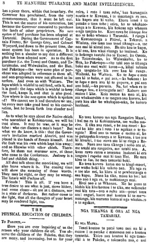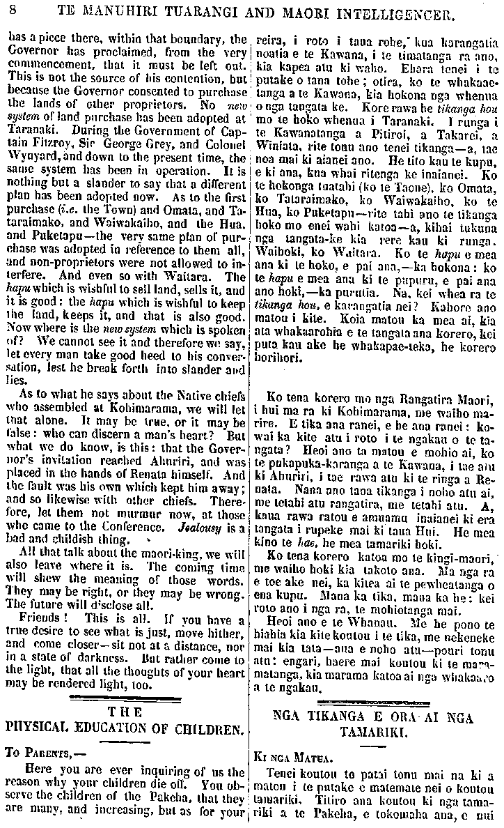 8 TE MANUHIRI TUARANGI AND MAORI INTELLIGENCER. has a piece there, within that boundary, the Governor has proclaimed, from the very commencement, that it must be left out. This is not the source of his contention, but because the Governor consented to purchase. the lands of other proprietors. No new system of land purchase has been adopted at Taranaki. During the Government of Cap- tain Fitzroy, Sir George Grey, and Colonel Wynyard, and down to the present time, the same system has been in operation. It is nothing but a slander to say that a different plan has been adopted now. As to the first purchase (i.e. the Town) and Omata. and Ta- taraimako, and Waiwakaiho, and the Hua. and Puketapu—the very same plan of pur- chase was adopted in reference to them all, and non-proprietors were not allowed to in- terfere. And even so with Waitara. The hapu which is wishful to sell land, sells it, and it is good: the hapu which is wishful to keep the land, keeps it, and that is also good. Now where is the new system which is spoken of? We cannot see it and therefore we say, let every man take good heed to his conver- sation, lest he break forth into slander and lies. As to what he says about the Native chiefs who assembled at Kohimarama, we will let that alone. It may be true, or it may be false: who can discern a man's heart? But what we do know, is this: that the Gover- nor's invitation reached Ahuriri, and was placed in the hands of Renata himself. And the fault was his own which kept him away; and so likewise with other chiefs. There- fore, let them not murmur now, at those who came to the Conference. Jealousy is a bad and childish thing. -" All that talk about the maori-king, we will also leave where it is. The coming time will shew the meaning of those words. They may be right, or they may be wrong. The future will disclose all. Friends! This is all. If you have a true desire to see what is just, move hither, and come closer—sit not at & distance, nor in a state of darkness. But rather come to the light, that all the thoughts of your heart may be rendered light, loo. THE PHYSICAL EDUCATION OF CHILDREN. To PARENTS,— Here you are ever inquiring of us the reason why your children die off. You ob serve the children of the Pakeha, that they are many, and increasing, but as for your reira, i roto i taua rohe," kua karangatia noatia e te Kawana, i te timatanga ra ano, kia kapea atu ki waho. Ehara tenei i te putake o tana tohe; otira, ko te whakaae- tanga a te Kawana, kia hokona nga whenua o nga tangata ke. Kore rawa he tikanga hou mo te boko whenua i Taranaki. I runga i te Kawanatanga a Pitiroi, a Takarei, a Winiata, rite tonu ano tenei tikanga—a, tae noa mai ki aianei ano. He tito kau te kupu, e ki ana, kua whai ritenga ke inaianei. Ko te hokonga tuatahi (ko te Taone), ko Omata, ko Tataraimako, ko Waiwakaiho, ko te Hua, ko Puketapu—rite tahi ano te tikanga hoko mo enei wahi katoa—-a, kihai tukuna nga tangata-ke kia rere kau ki runga. Waihoki, ko Waitara. Ko te hapu e mea ana ki te hoko, e pai ana,—ka hokona: ko te hapu e mea ana ki te pupuru, e pai ana ano hoki,—ka purutia. Na, kei whea ra te tikanga hou, e karangatia nei? Kahore ano matou i kite. Koia matou ka mea ai, kia ata whakaarohia e te tangata ana korero, kei puta kau ake he whakapae-teka, he korero horihori. Ko tena korero mo nga Rangatira Maori, i hui ma ra ki Kohimarama, me waiho ma rire. E tika ana ranei, e he ana ranei: ko- wai ka kite atu i roto i te ngakau o te ta- ngata? Heoi ano ta matou e mohio ai, ko te pukapuka-karanga a te Kawana, i tae atu ki Ahuriri, i tae rawa atu ki te ringa a Re- nata. Nana ano tana tikanga i noho atu ai, me tetahi atu rangatira, me tetahi atu. A, kaua rawa ratou e amuamu inaianei ki era tangata i rupeke mai ki taua Hui. He mea kino te hae, he mea tamariki hoki. Ko tena korero katoa mo te kingi-maori, me waiho hoki kia takoto ana. Ma nga ra e toe ake nei, ka kitea ai te pewheatanga o ena kupu. Mana ka tika, mana ka he: kei roto ano i nga ra, te mohiotanga mai. Heoi ano e te Whanau. Me he pono te hiahia kia kite koutou i te tika, me nekeneke mai kia tata—ana e noho atu—pouri tonu atu: engari, haere mai koutou ki te mara- matanga, kia marama katoa ai nga whakaaro a te ngakau. NGA TIKANGA E ORA AI NGA TAMARIKI. Ki NGA MATUA. Tenei koutou to patai tonu mai na ki a matou i te putake e matemate nei o koutou ltamariki. Titiro ana koutou ki nga tama- riki a te Pakeha, e tokomaha ana, e nui