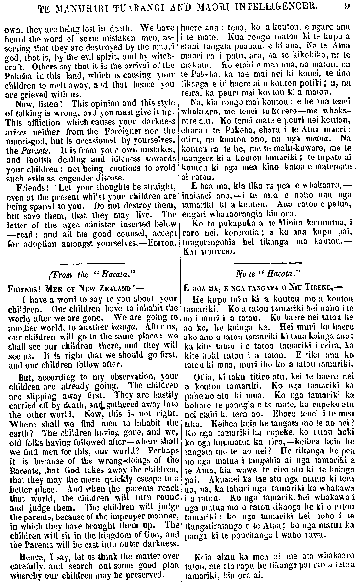 TE MANUHIRI TUARANGI AND MAORI INTELLIGENCER. 9 own, they are being lost in death. We have heard the word of some mistaken men, as- serting that they are destroyed by the maori god, that is, by the evil spirit, and by witch- crart. Others say that it is the arrival of the Pakeha in this land, which is causing your children to melt away. aid that hence you are grieved with us. Now, listen! This opinion and this style of talking is wrong, and you must give it up. This affliction which causes your darkness arises neither from the Foreigner nor the maori-god, but is occasioned by yourselves, the Parents. It is from your own mistakes, and foolish dealing and idleness towards your children: not being cautious to avoid such evils as engender disease. Friends! Let your thoughts be straight, even at (he present whilst your children are being spared to you. Do not destroy them, but save them, that they may live. The letter of the aged minister inserted below —read: and all his good counsel, accept for adoption amongst yourselves.—EDITOR. (From the "Haeata" FRIENDS'. MEN OF NEW ZEALAND;— I have a word to say to you about your children. Our children have to inhabit the world after we are gone. We are going to another world, to another kainga. After us, our children will go to the same place: we shall see our children there, and they will see us. It is right that we should go first, and our children follow after. But, according to my observation, your children are already going. The children are slipping away first. They are hastily carried off by death, and, gathered away into the other world. Now, this is not right. "Where shall we find men to inhabit the earth? The children having gone, and we, old folks having followed after— where shall we find men for this, our world? Perhaps it is because of the wrong-doings of the Parents, that God takes away the children, that they may the more quickly escape to a better place. And when the parents reach that world, the children will turn round and judge them. The children will judge the parents, because of the improper manner, in which they have brought them up. The children will sit in the kingdom of God, and the Parents will be cast into outer darkness. Hence, I say, let us think the matter over carefully, and search out some good plan whereby our children may be preserved. haere ana: tena, ko a! koutou, e ngaro ana i te male. Kua rongo matou ki te kupu a etahi tangata poauau, e ki ana, Na te Atua Maori a i patu, ara, na te kikokiko, na te makutu. Ko etahi e mea ana, na matou, na te Pakeha, ka tae mai nei ki konei, te tino tikanga e iti haere ai a koutou potiki; a, na reira, ka pouri mai koutou ki a matou. Na, kia rongo mai koutou: e he ana tenei whakaaro, me tenei tu-korero—me whaka- rere atu. Ko tenei mate e pouri nei koutou, ehara i te Pakeha, ehara i te Atua maori: otira, na koutou ano, na nga matua. Na koutou ra te he, me te mahi kuware, me te mangere ki a koutou tamariki; te tupato ai koutou ki nga mea kino katua e matemate ai ra tou. E hoa ma, kia tika ra pea te whakaaro,— inaianei ano,—i te moa e noho ana nga tamariki ki a koutou. Aua ratou e patua, engari whakaorangia kia ora. Ko te pukapuka a te Minita kaumatua, i raro nei, korerotia; a ko ana kupu pai, tangotangohia hei tikanga ma koutou.— KAI TUHITUHI. No te "Haeata." E HOA MA, E NGA TANGATA O NIU TIPENE,— He kupu taku ki a koutou mo a koutou tamariki. Ko a tatou tamariki hei noho i te ao i muri i a tatou. Ka haere nei tatou he ao ke, he kainga ke. Hei muri ka haere ake ano o tatou tamariki ki taua kainga ano; ka kite tatou io tatou tamariki i reira, ka kite hoki ratou i a tatou. E tika ana ko tatou ki mua, muri iho ko a tatou tamariki. Otiia, ki taku titiro atu, kei te haere nei o koutou tamariki. Ko nga tamariki ka pahemo atu ki mua. Ko nga tamariki ka hohoro te paanga e te mate, ka rupeke atu nei etahi ki tera ao. Ehara tenei i te moa tika. Keihea koia he tangata mo te ao nei? Ko nga tamariki ka rupeke, ko tatou hoki ko nga kaumatua ka riro,—kei hea koia he tangata mo te ao nei? He tikanga he poa no nga matua i tangohia ai nga tamariki e te Atua, kiu wawe te riro atu ki te kainga pai. Akuanei ka tae atu nga matua ki tera ao, na, ka tahuri nga tamariki ka whakawa i a ratou. Ko nga tamariki hei whakawa i nga matua mo o ratou tikanga he ki o ratou tamariki: ko nga tamariki hei noho i te Rangatiratanga o te Atua; ko nga matua ka panga ki te pouritanga i waho rawa. Koia ahau ka mea ai me ata whakaaro tatou, me ata rapu he tikanga pai mo a tatou tamariki, kia ora ai.