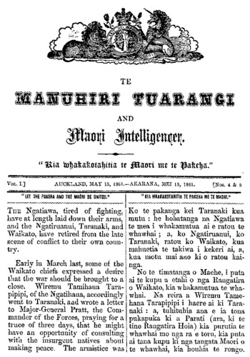 Te Manuhiri Tuarangi Maori Intelligencer 1861: Number 4. 15 May 1861 |