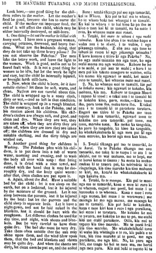 10 TE MANUHIRI TUARANGI AND MAORI INTELLIGENCER. Look here,—one good thing for the chil- dren refers to the mother. Let the mother's food be good, because she has to nurse the child. If the mother eat improper food, the evil of it will affect the child, which may be either internally destroyed, or stillborn. 1. One thing—let not the mother Ie killed with heavy work. I have seen a pregnant woman, carrying potatoes, Firewood, and heavy bur- dens. What are the husbands doing, that they do not lake up these heavy pikaus? Bo you not observe the Pakehas? The men take the heavy work, and leave the light to the women « Work is good, and is not to be found fault with. It is not a good thing for women to be idle, but let the work be light and easy, lest the child be internally injured, or brought forth stillborn. 2. Now, when the child is born, let it have suitable clothes let them be soft, warm, and clean. Natives are not careful about this. The child is wrapped up in a nasty cloth, dirty or wet,--and so left in that condition. The child is wrapped up in a rough blanket. On the contrary, look at the Pakeha, and at bis caution about his children. His chil- dren's clothes are always soft, and good, and clean and dry. When they are wet, they are taken off, when they are dirty they are taken off, when they are torn they are taken off; the children are dressed in dry and suitable clothing, and the dirty things are washed out. 3. Another good thing for children is Washing. The Pakehas plan with his chil- dren, is to put them into a tub of warm | vvater, morning and evening, and to wash the body all over with soap: that being done, it is dried with a nice towel, and I -rubbed with the hand that it may be tho- roughly dry, and the body quite warm: -after that, clean clothes are put upon it. 4. Again, about the Bed. Have a suitable bed for the child: let it not sleep on the earth, but on a bedstead, lest it be injured by the moisture of the ground. Let it not sleep between the parents, Jest it be injured by the heat: but let the parents and the child sleep in separate beds. Let it have a night-gown, and not be laid naked in the blankets, lest it should be hurt with the roughness. Let different clothes be used for day lime, and night, with sheets and blan- kets. But be very careful to have them quite dry. The bed also must be very dry. Take them often outside that the sun may shine upon them, and the wind blow upon them, that the bed and blankets and sheets may be quite dry. And when the sheets are dirty, let clean ones be put on, and the soiled Rere: tetahi tikanga pai mo nga tamariki, kei te Whaea. Kia pai te kai ma te whaea, ko te whaea hoki hei whangai i te tamaiti. Ka kai te whaea i te kai kino ka pa iho te kino o taua kai ki te tamaiti, na ka mate i roto, ka whanau mate mai ranei. 1. Tetahi, kei mate te whaea i nga mahi taimaha. Kua kite ahau i te wahine hapu e waha ana i te riwai, i te wahie, i nga pikaunga taimaha. E aha ana nga tane te tahuri ai ratou kinga pikaunga taimaha? E kore koutou e titiro ki nga Pakeha? Na, ko nga mahi taimaha ma nga tane, ko nga mahi mama ma nga wahine. Kahore he he o te mahi. e pai ana te mahi; e hara i te mea pai kia takoto mangere te wahine, otiia kia mama kia ngawari te mahi, kei mate i roto te tamaiti, kei whanau mate mai ranei. 2. Na, ka whanau mai te tamaiti, kia pai he kakahu mona; kia ngawari te kakahu, kia mahana, kia ma. Kahore te tangata Maori i tupato ki tenei; e takai ana i te tamaiti ki te kakahu kino, paru, moku,—kino tonu iho, paru tonu iho, moku tonu iho. E takai ana i te tamaiti ki te pahikete taratara. Engari me titiro ki te Pakeha me tana tupato ki ana tamariki, ngawari tonu te kakahu mo ana tamariki, pai tonu, ma tonu, maroke tonu. Ea moku ka tangohia, ka paru ka tangohia, ka kino ka tangohia, ka whakakakahuria ki nga mea pai ki nga mea maroke, ka horoi nga mea kua kino. 5. Tetahi tikanga pai mo te tamariki, ko te horoi. Ta te Pakeha tikanga mo ana tamariki, me tuku ki te tapu i te ata i te ahiahi, me te wai mahana, me te hopi, me te horoi katoa te tinana: ka mutu ka muku- mukua ki te tauera pai, ka mirimiria ki te ringaringa, kia tino maroke kia tino mahana te kiri, na, katahi ka whakakakahuria ki nga kakahu ma. - 4. Tetahi, ko te moenga. Kia pai te moe- nga mo te tamariki, kaua e moe ki raro ki te whenua, engari me peeti, kei mate i te haumoku o te whenua. Kaua e moe i roto i nga matua, kei mate i te werawera; me moenga ke mo nga matua, me moenga ke mo te tamaiti. Kia pai hoki te kakahu, kaua e moe kiri kau i roto i nga paraikete, kei mate i te taratara. Me kakahu ke mo te awatea, me kakahu ke mo te po, me etahi hiti me etahi paraikete. Otiia, kia nui te tupato kia tino maroke. Me te peeti hoki kia tino maroke. Me whakahokihoki tonu ki waho kia whitingia e te ra, kia puhia e te hau, kia tino maroke ai te peeti, me nga paraikete, me nga hiti. Na, ka paru nga hiti, me tango ke hei te mea ma, me horoi nga mea paru. Kia nui hoki te tupato ki te