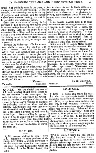 TE MANUHIRI TUARANGI AND MAORI INTELLIGENCER. 13 sures? And will it lie warm in the grave, in consequence of its expensive coffin? On the contrary, it will probably rise up in the day of judgement, and condemn you, for having wasted your treasure in the grave, and for having stolen your childrens money. Great also is the waste of money in the purchase of fine clothes for the adults, and in tobacco and spirits and horses; and many other things. And so the corpse is to be dressed up liked the King; and the adult must be like a king in the finery and abundance of his clothing: but as for the children, they may be lost in dirt, in cold, in hunger and in poverty. Perhaps the Native says, "He has no cow from which to supply his children with milk." Indeed! And why has he not? Why? The land is wasted over the maori, who does not provide a cow, to give milk for his children. Parents! Listen to my affectionate ad- vice, and leave off these wrong doings lest all your children be destroyed. But rather adopt the counsel I have goven you, that your offspring may be saved, both in this world, and the next. J. WHITELEY, Taranaki. Missionary NOTICE! We are wishful that men of understanding should write letters to us, for insertion in the newspaper. But only let things of importance be written, such as anxious thoughts of the heart in regard to the measures required to promote the well-being both of the maori and the pakeha. Let them be sent to the Editor of the Manuhiri, and he will look at them; and if the letter is proper, he will insert it in the paper. We are willing for one por- tion of it to be employed by the maori in the expression of his good thoughts, but the letters of the words be fairly written that all our time may not be spent in search- ing them out. NOTICE All persons wishing to suppy fresh vegetables or other produce at the Camp, at Otahuhu, will be permitted to do so at a spot set apart for that purpose, but under the Camp regulations, which can be obtained from the Market Master, Otahuhu. tana kawhena utu nui ka takoto mahana ai te tupapaku i roto i te rua? Engari pea, ka tahuri a te ra whakawa ki te whakawa i a komou, mo te maumau taonga ki roto ki te urupa, ano te tahae i nga moni o nga tama- riki. Ka nui hoki te maumau moni ki te hoko kakahu whakapaipai mo nga kaumatua; me te tupeka, me te waipiro, me Ie hoiho, me te tini o nga mea. Ko nga tupapaku kia penei me te kingi te whakapaipai? Ko nga kaumatua kia penei me te kingi te whaka- paipai, te maha o ona taonga? Tena ko nga tamariki kia ngaro noa iho i te paru, i te maeke, i te kai kino, i te rawakore Rei te mea hoki te tangata Maori, kahore he kau hei mea waiu mo ana tamariki. Ha! He aha i kore ai? Inei? Maumau te whenua mo te Maori kahore nei i mea i te kau, hei waiu ma ona tamariki! E nui ana te whenua hei haerenga kau; e nui ana te whenua hei tupuranga kai, te taiepangia tetahi paamu, hei haerenga kau ma nga tamariki. E te whanau, whakarongo mai ki taku kupu aroha! Whakareaea ena tikanga he, kei ngaro rawa a koutou tama- riki. Engari kia whakarite koutou i taku korero, kia ora ai ratou, kia rangatira ai ratou ki tenei ao, ki tera ao atu. Na TE WHAITERE. Taranaki. Minita. PANUITANGA. RERE! E hiahia ana matou kia tuhi- tuhia mai nga tangata mohio i a ratou pukapuka, kia maka iho ki roto ki te niupepa nei. Otira, ko nga kupu nunui anake e tuhi mai, ara, ko nga whakaaro taimaha a te ngakau ki nga mea e tupu pai ai te tangata Maori raua ko te Pakeha. Tukua mai ki te "Kai-tuhituhi o te Manuwhiri," mana ano e titiro: a, ki te pai te reta, ka panga e ia ki roto ki te Pepa nei. E pai ana matou kia waiho tetahi taha mo te Maori, hei whakaputanga mai mo ana whakaaro pai: otira, kia ata ririte nga reta o nga kupu, kei pau katoa nga ra i te kimihanga iho. PANUITANGA. KO te hunga e kawe kai mai ana hei hoko ma ratou, ki te Puni Hoia, i Otahuhu, me kawe ki te wahi kua whaka ritea hei takotoranga mo aua mea. Otira, ko nga ture mo nga kai hoko, me tono atu ki te Kaitiaki o te Makete, a, mana ano e homai.