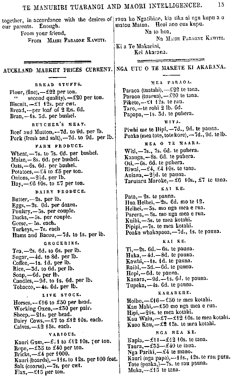 TE MANUHIRI TUARANGI AND MAORI INTELLIGENCER. 15 together, in accordance with the desires of our parents. Enough. From your friend, From MAIHI PARAONE KAWITI. AUCKLAND MARKET PRICES CURRENT. BREAD STUFFS. Flour, (fine),—£22 per ton. '' second quality), —•£ 20 per ton. Biscuit,—£1 12s.per cwt. Bread,--per loaf of 2 Ibs. 6d. Bran,—1s. 3d. per bushel. BUTCHER'S MEAT. Beef and Mutton,—7d. to 9d. per Ib. Pork (fresh and salt),—7d. to 9d. per Ib. FARM PRODUCE. Wheat,—7s. to 7s. 6d. per bushel. Maize,—8s. 6d; per bushel. Oats,—6s. 6d. per bushel. Potatoes,—£4 to £5 per ton. Onions,—21/2d. per Ib. Hay,—£6 10s. to £7 per ton. DAIRY PRODUCE. Butter,—2s. per Ib. Eggs,—2s. 6d. per dozen. Poultry,—5s. per couple. Ducks,—5s. per couple. Geese,—5s. each. Turkeys,—7s. each Hams and Bacon,—7d. to 1s. per Ib. GROCERIES. Tea,—2s. 6d. to 6s. per Ib. Sugar,—4d. to 8d. per Ib. Coffee,--1s. 1d. per Ib. Rice,—5d. to 6d. per Ib. Soap,—6d. per Ib. Candles,—9d. to 1s. 6d. per Ib. Tobacco,—4s. 6d. per Ib. LIVE STOCK. Horses,—£16 to £30 per head. Working Oxen,— £50 per pair. Sheep,—21s. per head. Dairy Cows,—£7 to £12 10s. each. Calves,—£2 15s. each. VARIOUS. Kauri Gum,—£1 to £12 10s. per ton. Rope,—£55 to £40 per ton. Bricks,—£4 per 1000. Kauri (boards),—11 to 12s. per 100 feet. Salt (coarse),—7s, per cwt. Flax,—£45 per ton. raua ko Ngatihine, kia tika ai ngu kupu a o matou Matua. Heoi ano ena kupu. Na to hoa, Na MAIHI PARAONE KAWITI Ki a Te Makarini, Kei Akarana. NGA UTU O TE MAKETE KI AKARANA MEA PARAOA. Paraoa (tuatahi).—£22 te tana. Paraoa (tuarua),—£20 te tana. Pikete,—£1 13s. te rau. Taro,—te rohi 2 Ib. 6d. Papapa,—Is. 5d. te puhera. MITA. Piwhi me te Hipi,—7d., 9d. te pauna. Poaka (mea tote, totekore),—7d., 9d. te Ibs MEA O TE MA ARA. Witi,—7s., 7s. 6d. te puhera. Kaanga,—8s. 6d. te puhera. Oti,—6s. 6d. te puhera. Riwai,—£4, £4 10s. te tana. Aniana,—21/2d. te pauna, Tarutaru Maroke,—£6 10s., £7 te tana KAI KE. Pata,—2s. te pauna. Hua Heihei,—2s. 6d. mo te 12. Heihei,—5s. mo nga mea e rua. Parera,—5s. mo nga mea e rua. Kuihi,—5s. te mea kotahi. Pipipi,—7s. te mea kotahi. Poaka whakapaoa,—7d.. 1s. te pauna. KAI KE. Ti,—2s. 6d.--6s. te pauna. Huka,— 4d.— 8d. te pauna. Kawhi,—1s. Id. te pauna. Raihi,—5d.—6d. te pauna. Hopi,—6d. te pauna. Kanara,—9d.—1s. 6d. te pauna. Tupeka,—4s. 6d. te pauna. KARAREHE. Hoiho, -£16—£50 te mea kotahi. Kau Mahi,—£50 mo nga mea e rua. Hipi,—21s. te mea kotahi. Kau Waiu,—£7—£12 10s. te mea kotahi Kuao Kau,—£2 15s. te mea kotahi. NGA MEA KE. Kapia,--£11—£12 10s. te tana. Taura,—£55—£40 te tana. Nga Pariki,—£4 te mano. Kauri (nga papa),—11s., 12s. te rau pu Tote (poaka,)—7s. te rau pauna. Muka,—£15 te tana.