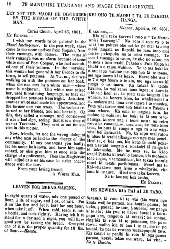 16 TE MANUHIRI TUARANGI AND MAORI INTELLIGENCER. LET NOT THE MAORI BE DISTURBED BY THE DOINGS OF THE WHITE MAN. Christchurch. April 16, 1861. MY FRIENDS,— I wish my words to be printed in the Maori Intelligencer. In the past week, there came to me some natives from Ropaki, from their runanga, with letters. The cause of their runanga was an alarm because of some white men of Port Cooper, who had assault- ed one of their women. In the morning. this woman had gone with her friends to the town, to sell potatoes At 7 a. m., she was walking on with the potatoes on her back, when she was met by a white man—whose name is unknown. This white man seized her, used threatening language, so that she dropped her potatoes from fright. Just then, another white man made his appearance, and the former one ran away. The woman re- turned to her friends, and told her tale. On this, they called a runanga, and considered it was a bad sign, seeing that it is a lime of war at Taranaki. They sent to me for ad- vice in this matter. Now, friends, let not the wrong doing of any white man be laid to the charge of the community. If any one treats you badly, let his name be known, and have him sum- moned, or else give him at once into the charge of a policeman. Then the Magistrate will adjudicate on his case in strict accor- dance with the law. From your loving friend. A WHITE MAN. LEAVEN FOR BREAD-MAKING. IN eight quarts of Water, mix one pound of flour, 3/4 Ib. of sugar, and 1/2 oz. of salt. Put it on the fire and let it boil for one hour, when lake it off. When cold, team it into a bottle, and cork tightly. Having left it to stand for a day and a night, you will have good yest for raising the bread. One pint can of it is the proper quantity for 18 Ibs. of flour.—Haeata. KEI OHO TE MAORI I TA TE PAKEHA HANGA. Akaroa, Aperira, 16, 1861. E AKU HOA,— Kia taia taku korero i roto o "Te Manu- vvhiri i Tuarangi."' No roto i nga ra o te wiki kua pahure ake nei ka pa mai ki ahau etahi tangata no Ropaki, he mea tono mai me te pukapuka no te reira runanga. Te mea i runanga ai ratou, he oho no ratou, no te mea i HIMI tetahi Pakeha o Puta Kupa ki tetahi o o ratou wahine. No te ata hoki ka u atu taua wahine me ona hua ki te taone. me nga taewa ki te hoko. Haere ake ana i te 7 o nga haora o te ata, me nga taewa ki runga o te tuara. Ka tutaki ki tetahi Pakeha, ko wai ranei tona ingoa, e kore ia e kitea; heoi ra, ka mau taua tangata i te wahine, ka korero kino, ka whakawehi i a ia, makere ana tona kete taewa i te mataku. Puta whakareke mai ana tetahi atu Pakeha i tona whare. Ka oma te tangata tutu, ka mahue te wahine; ka hoki ia ki ona wha- naunga, korero ana i tenei mea: no reira ratou ka runanga ai, mea ana, he tohu kino tena, ka puta ki runga o nga ra o te wha- whai kei Taranaki. Na, ka rapu mai ratou ki ahau ki tetahi tikanga mo nga mea penei. Heoi ra, e hoa ma, kia kaua te mahi poka- noa a tetahi tangata e whakairi ki runga ki te tokomaha. Me he mea ra, ka kino tetahi Pakeha ki tetahi o koutou, kia mohiotia tona ingoa, e tamanatia ai, kia tukua tonutia ranei ki tetahi porihimana. Penei ma te Kai-whakawa tana kino e whakarite, rite tonu ki te ture. Heoi ano taku korero. Na to koutou hoa aroha, HE PAKEHA. HE REWENA KIA PAI AI TE TARO. RINGIHIA ki roto ki te wai (kia waru nga kuata wai) he paraoa, kia kotahi pauna; he huka, 3/4 pauna; 'he tote, 1/2 aunehi; me panga ki te ahi; kia pau te haora kotahi e koro- pupu ana, tangohia ki tahaki; ka matao, ringihia ki roto ki te pounamu, me puru rawa; waiho kia tu ana i te ra, me te po kotahi, ka pai he rewena whakapupuhi taro. Kia kotahi te paniki ki roto ki nga pauna paraoa, kotahi tekau ma waru, ka rite. - No te Haeata.