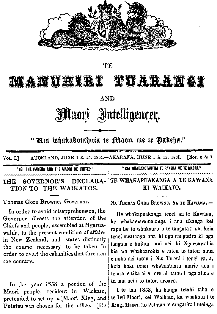 Te Manuhiri Tuarangi Maori Intelligencer 1861: Number 6. 01 June 1861 |