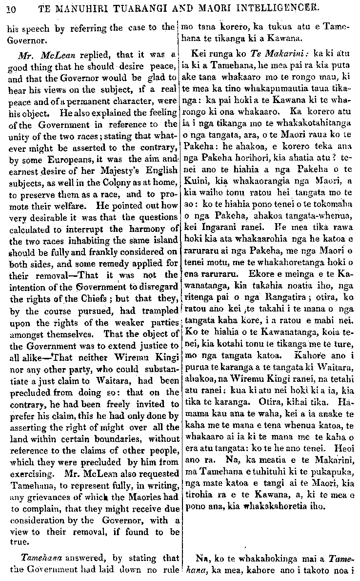 10 TE MANUHIRI TUARANGI AND MAORI INTELLIGENCER. his speech by referring the case to the Governor. Mr. McLean replied, that it was a good thing that he should desire peace, and that the Govemor would be glad to hear his views on the subject, if a real peace and of a permanent character, were his object. He also explained the feeling of the Government in reference to the unity of the two races; stating that what- ever might be asserted to the contrary, by some Europeans, it was the aim and- earnest desire of her Majesty's English subjects, as well in the Colony as at home, to preserve them as a race, and to pro- mote their welfare. He pointed out how very desirable it was that the questions calculated to interrupt the harmony of the two races inhabiting the same island should be fully and frankly considered on both sides, and some remedy applied for their removal—That it was not the intention of the Government to disregard the rights of the Chiefs; but that they, by the course pursued, had trampled upon the rights of the weaker parties amongst themselves. That the object of the Government was to extend justice to all alike—That neither Wiremu Kingi nor any other party, who could substan- tiate a just claim to Waitara, had been precluded from doing so; that on the contrary, he had been freely invited to prefer his claim, this he had only done by asserting the right of might over all the land within certain boundaries, without reference to the claims of other people, which they were precluded by him from exercising. Mr. McLean also requested Tamehana, to represent fully, in writing, ; my grievances of which the Maories had to complain, that they might receive due consideration by the Governor, with a view to their removal, if found to be true. Tamehana answered, by stating that the Government had laid down no rule mo tana korero, ka tukua atu e Tame- hana te tikanga ki a Kawana. Kei runga ko Te Makarini: ka ki atu ia ki a Tamehana, he mea pai ra kia puta ake tana whakaaro mo te rongo mau, ki te mea ka tino whakapumau tia taua tika- nga: ka pai hoki a te Kawana ki te wha- rongo ki ona whakaaro. Ka korero atu ia i nga tikanga mo te whakakotahitanga o nga tangata, ara, o te Maori raua ko te Pakeha: he ahakoa, e korero teka ana nga Pakeha horihori, kia aha tia atu? te- nei ano te hiahia a nga Pakeha o te Kuini, kia whakaorangia nga Maori, a kia waiho tonu ratou hei tangata mo te ao: ko te hiahia pono tenei o te tokomaha o nga Pakeha, ahakoa tangata whenua, kei Ingarani ranei. He mea tika rawa hoki kia ata whakaarohia nga he katoa e raruraru ai nga Pakeha, me nga Maori o tenei motu, me te whakahoretanga hoki o ena raruraru. Ekore e meinga e te Ka- wanatanga, kia takahia noatia iho, nga ritenga pai o nga Rangatira; otira, ko ratou aho kei te takahi i te mana o nga tangata kaha kore, i a ratou e mahi nei. Ko te hiahia o te Kawanatanga, koia te- nei, kia kotahi tonu te tikanga me te ture, mo nga tangata katoa. Kahore ano i puma te karanga a te tangata ki Waitara, ahakoa, na Wiremu Kingi ranei, na tetahi atu ranei; kua ki atu nei hoki ki a ia, kia tika te karanga. O tira, kihai tika. Ha- mama kau ana te waha, kei a ia anake, te kaha me te mana e tena whenua katoa, te whakaaro ai ia ki te mana me te kaha o era atu tangata: ko te he ano tenei. Heoi ano ra. Na, ka meatia e te Makarini, ma Tamehana e tuhituhi ki te pukapuka: nga mate katoa e tangi ai te Maori, kia tirohia ra e te Kawana, a, ki te mea e pono ana, kia whakakahore tia iho. Na, ko te whakahokinga mai a Tame- hana, ka mea, kahore ano i takoto noa i